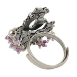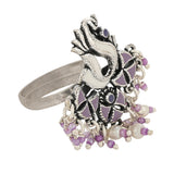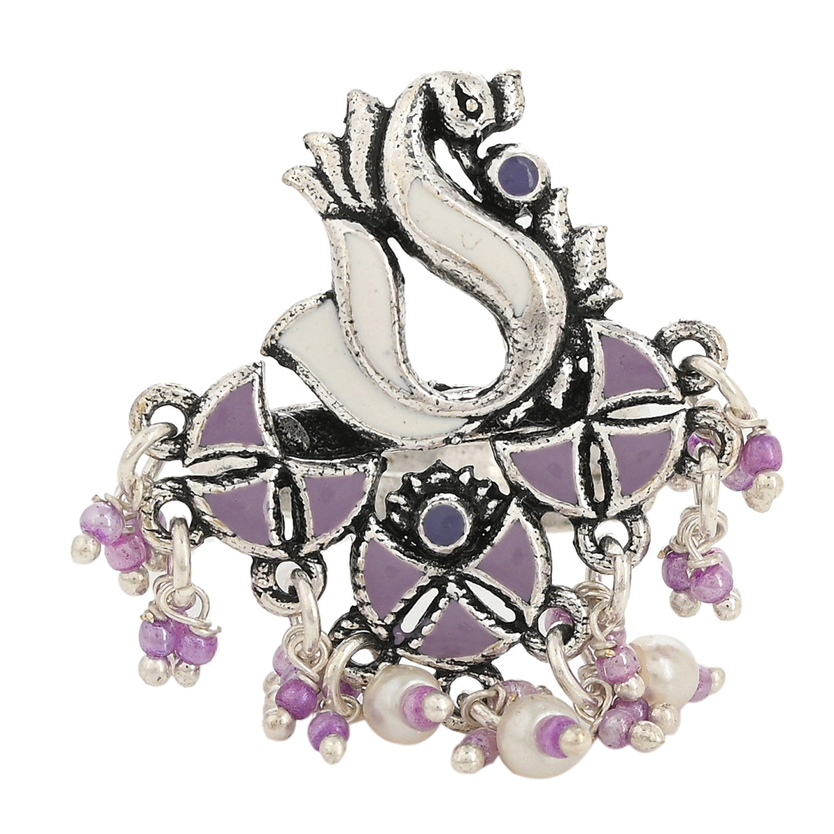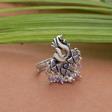 Peacock motif brass ring, enamelled and silver plated. The lightly embellished ring is adjustable for maximum comfort and promises to be a lightweight wear at all times. Versatile enough to be paired with a wide range of ethnic, Indo