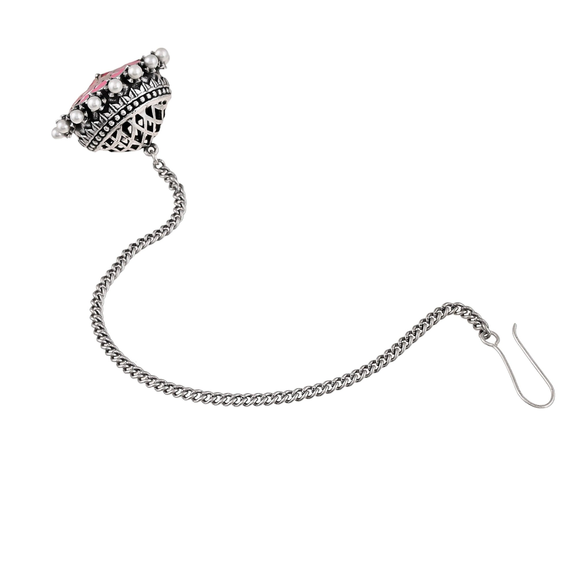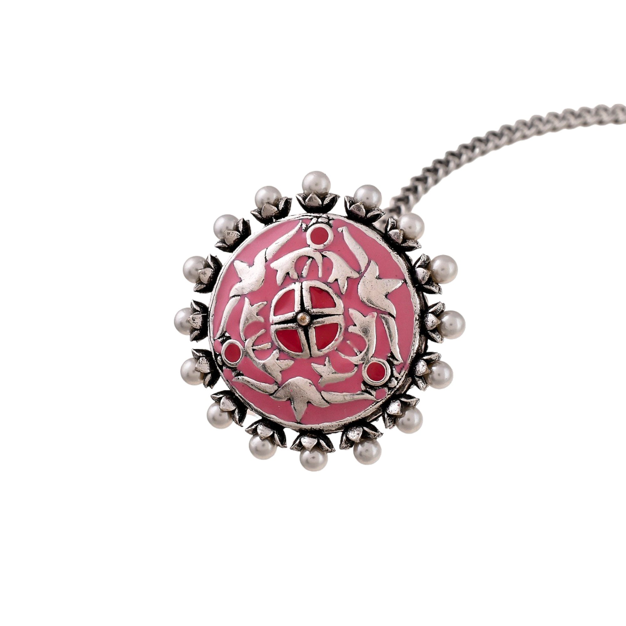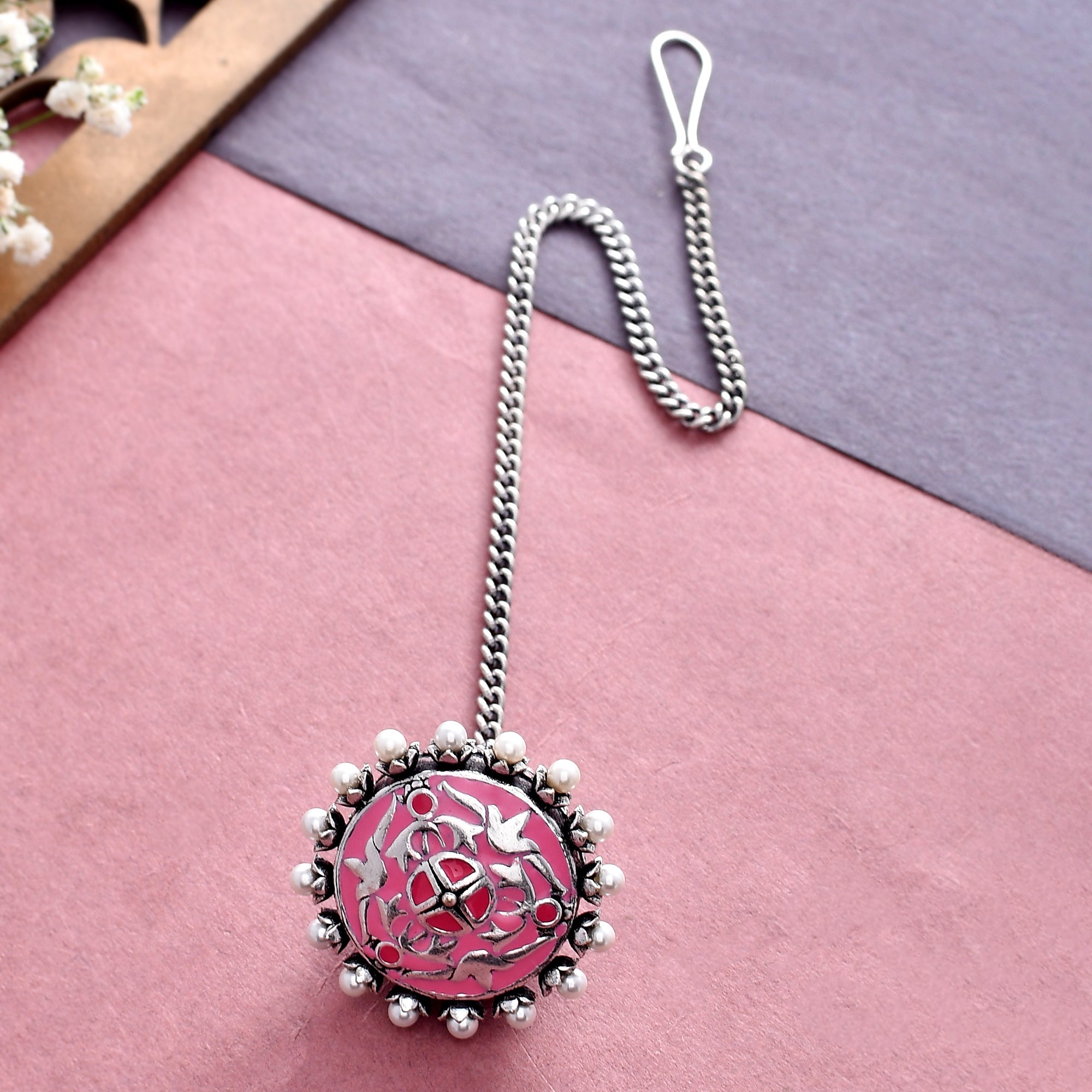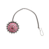 Shwet Kamal Pink Enamel Faux Pearls Adorned Silver Plated Maang Tika