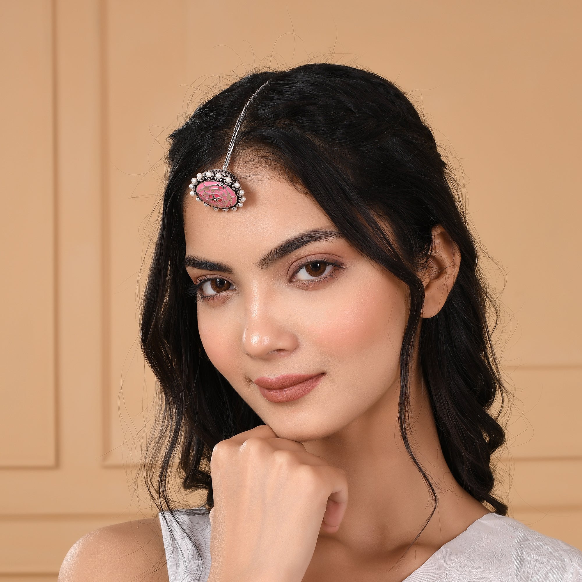 A delicate maang tika, fashioned out of brass and embellished with lovely white faux pearls. Silver plated and featuring pink enamel details, this classic tika is lightweight and comfortable. Pair the versatile piece with anything from sarees and lehengas to Bohemian outfits.