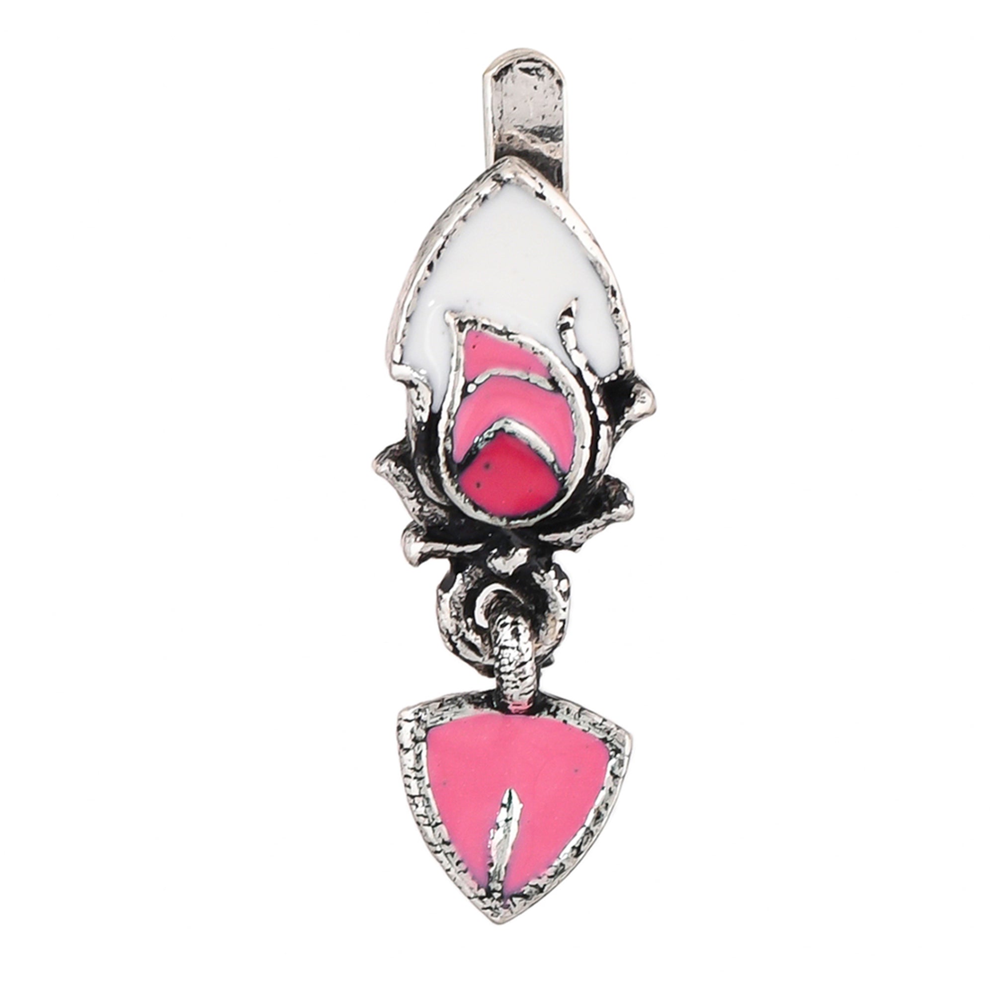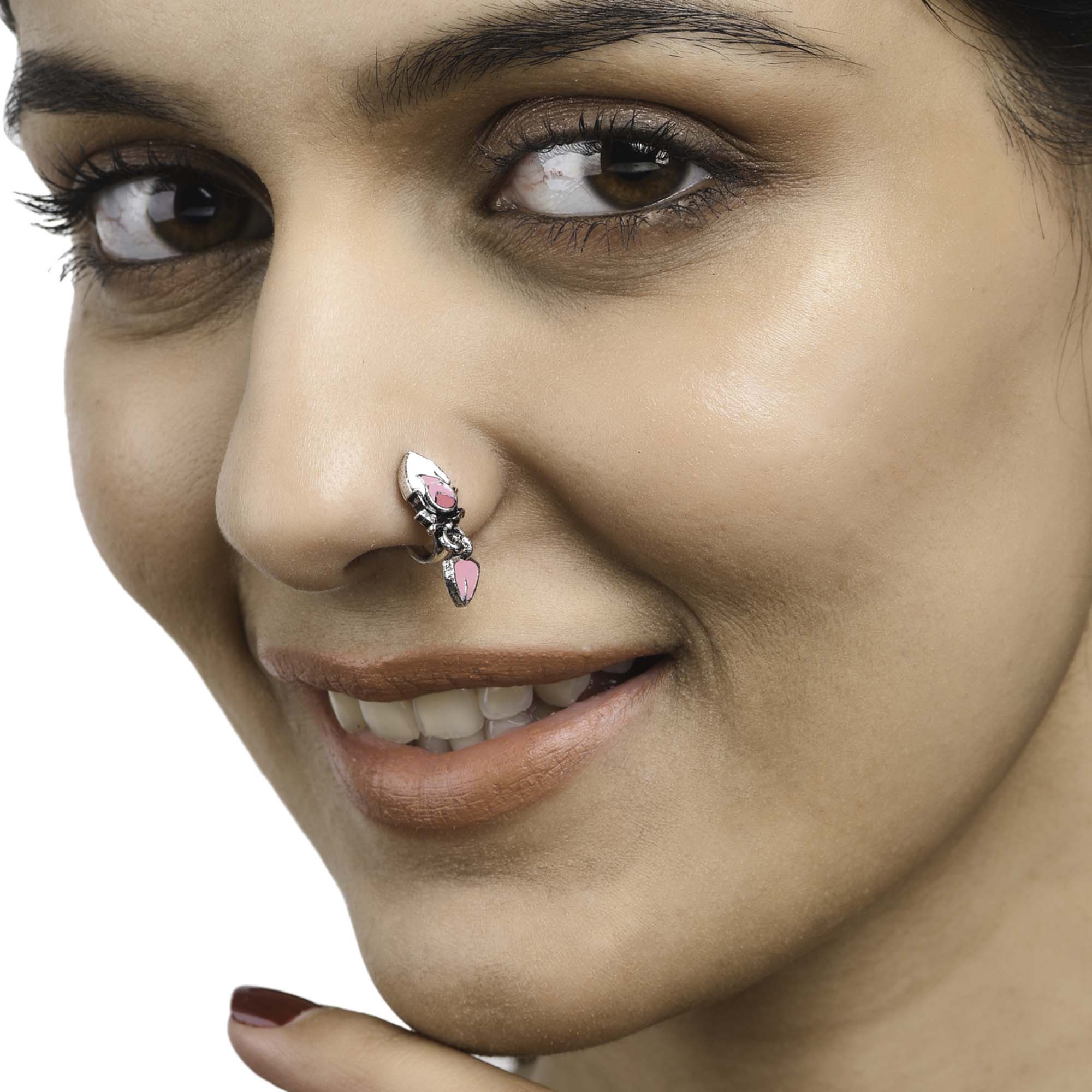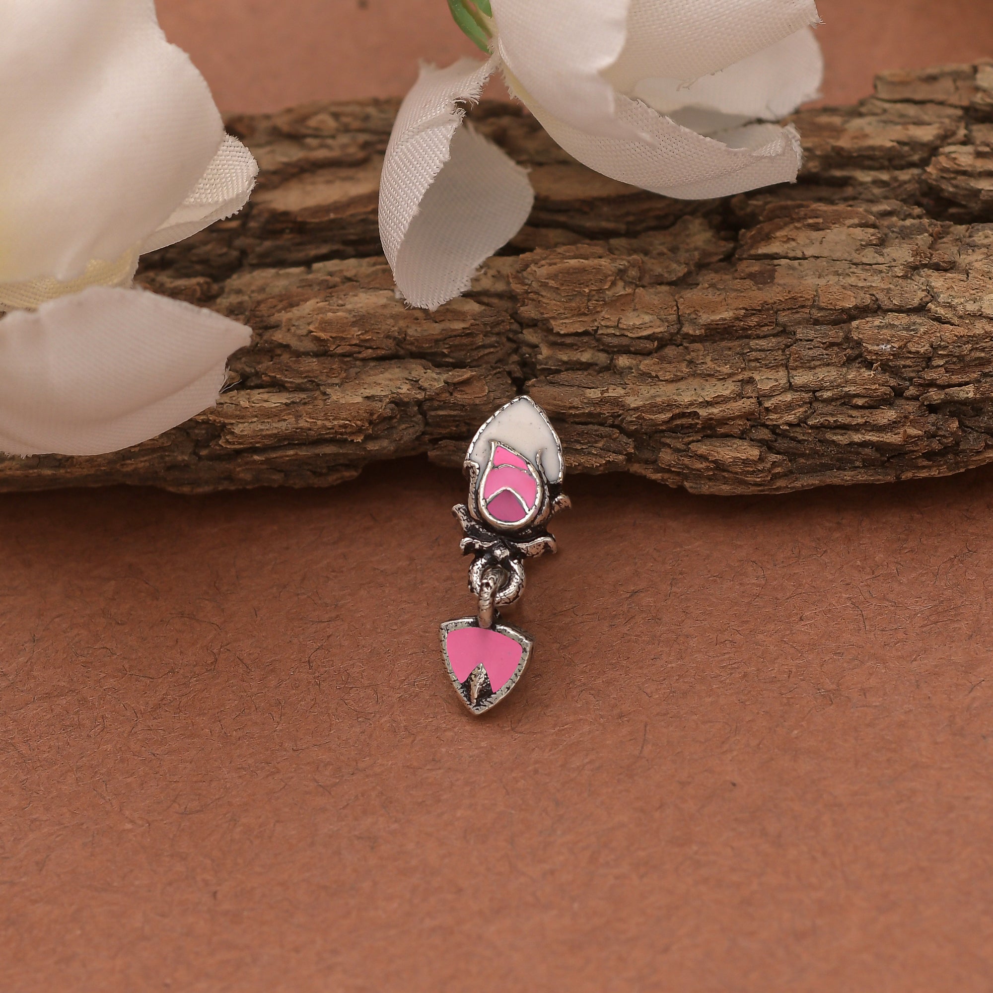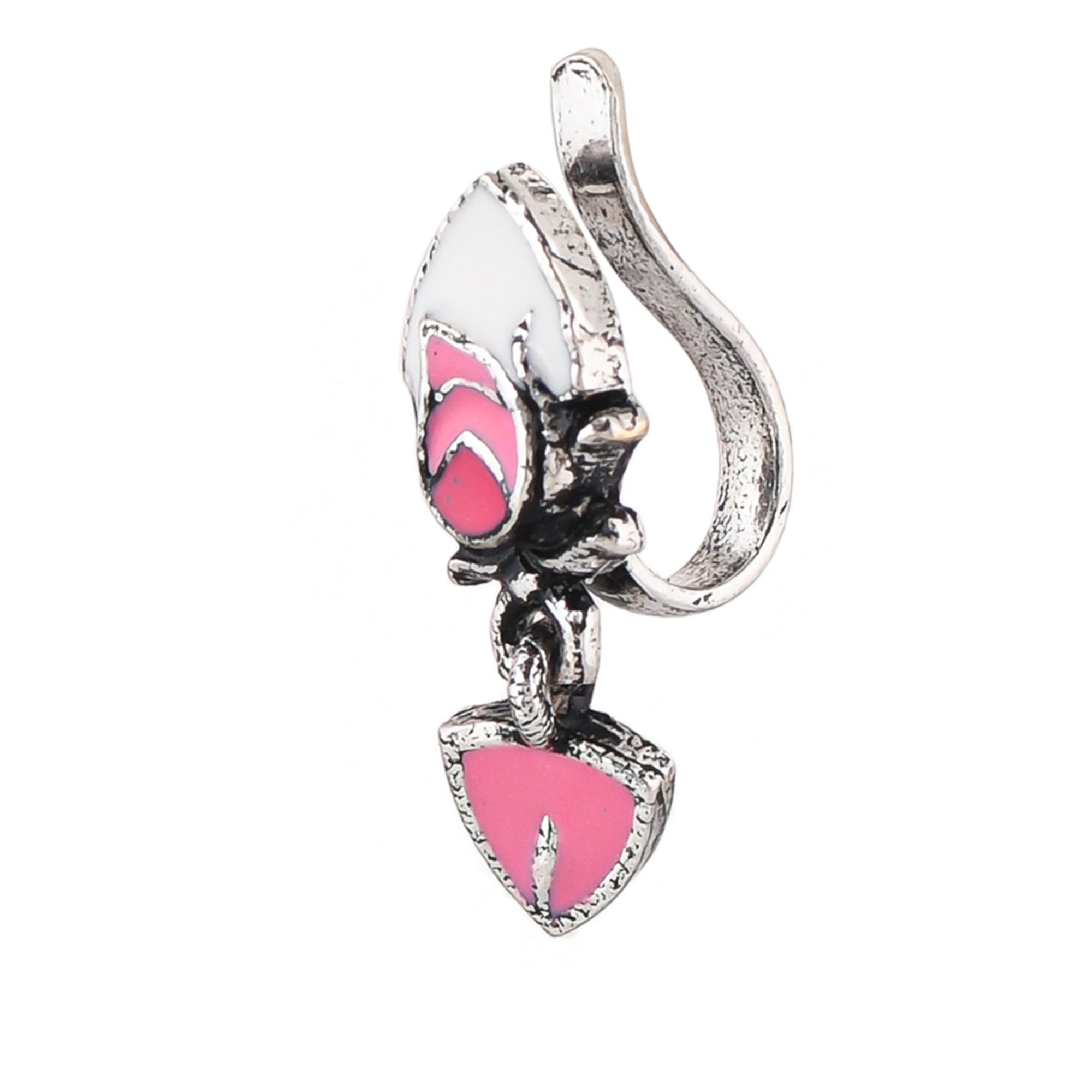 Silver plated nose pin with delicate pink enamel details. Made from brass and comfortable to slip on. Pair with any of your favourite outfits.