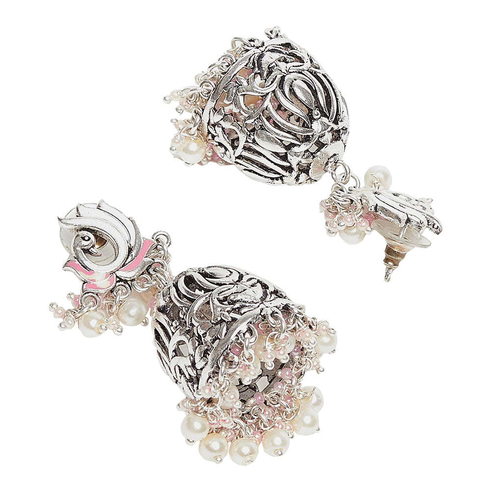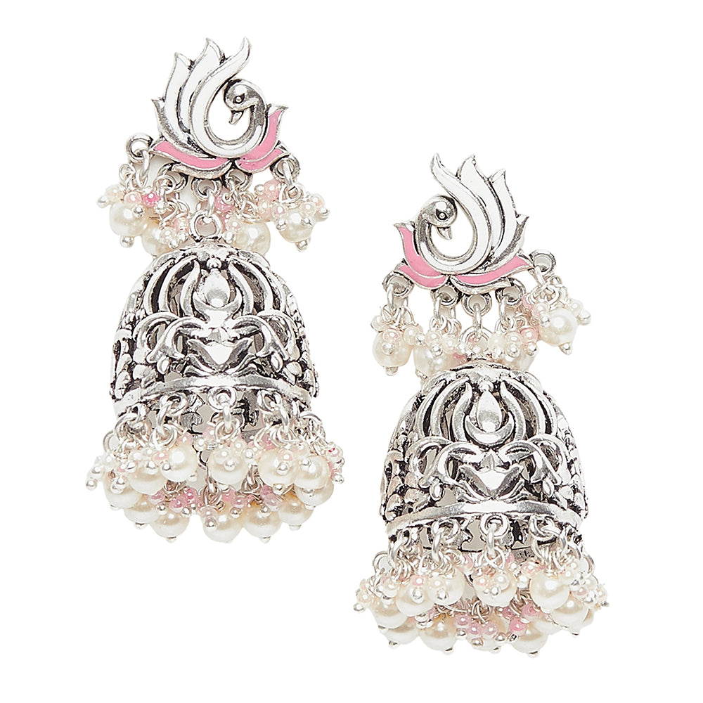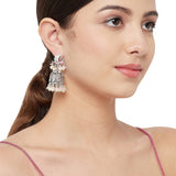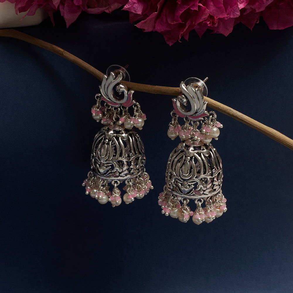 A collection that has been inspired by the serenity of lotus and magnificent beauty of white peacock. Decorated with beautiful ghunghroos in oxidized silver plated brass material, these danglers feature class and beauty together.