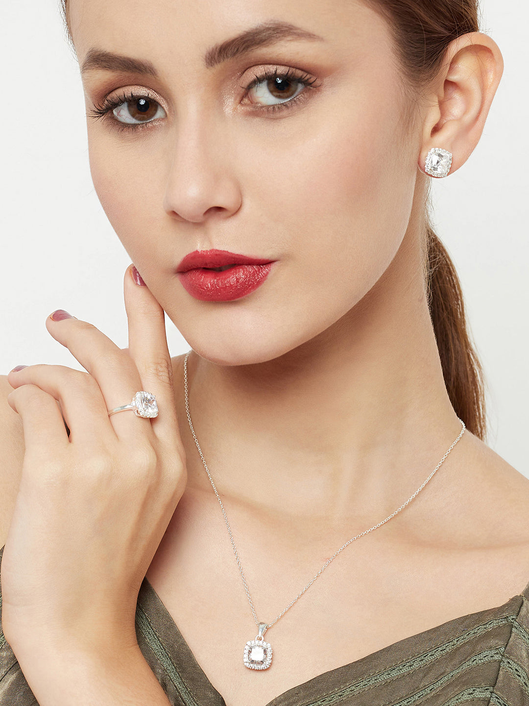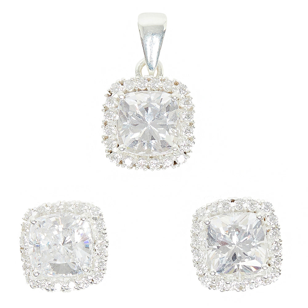 A box set featuring a pendant, earrings and a ring in a pretty design from our Silver CZ Collection. A perfect 9 to 5 piece.