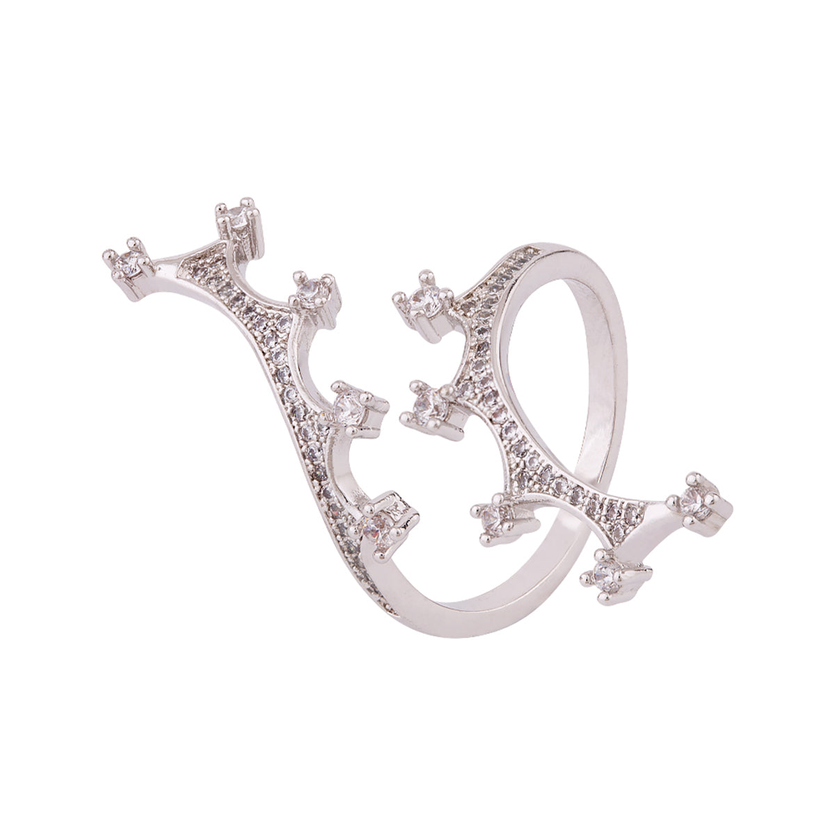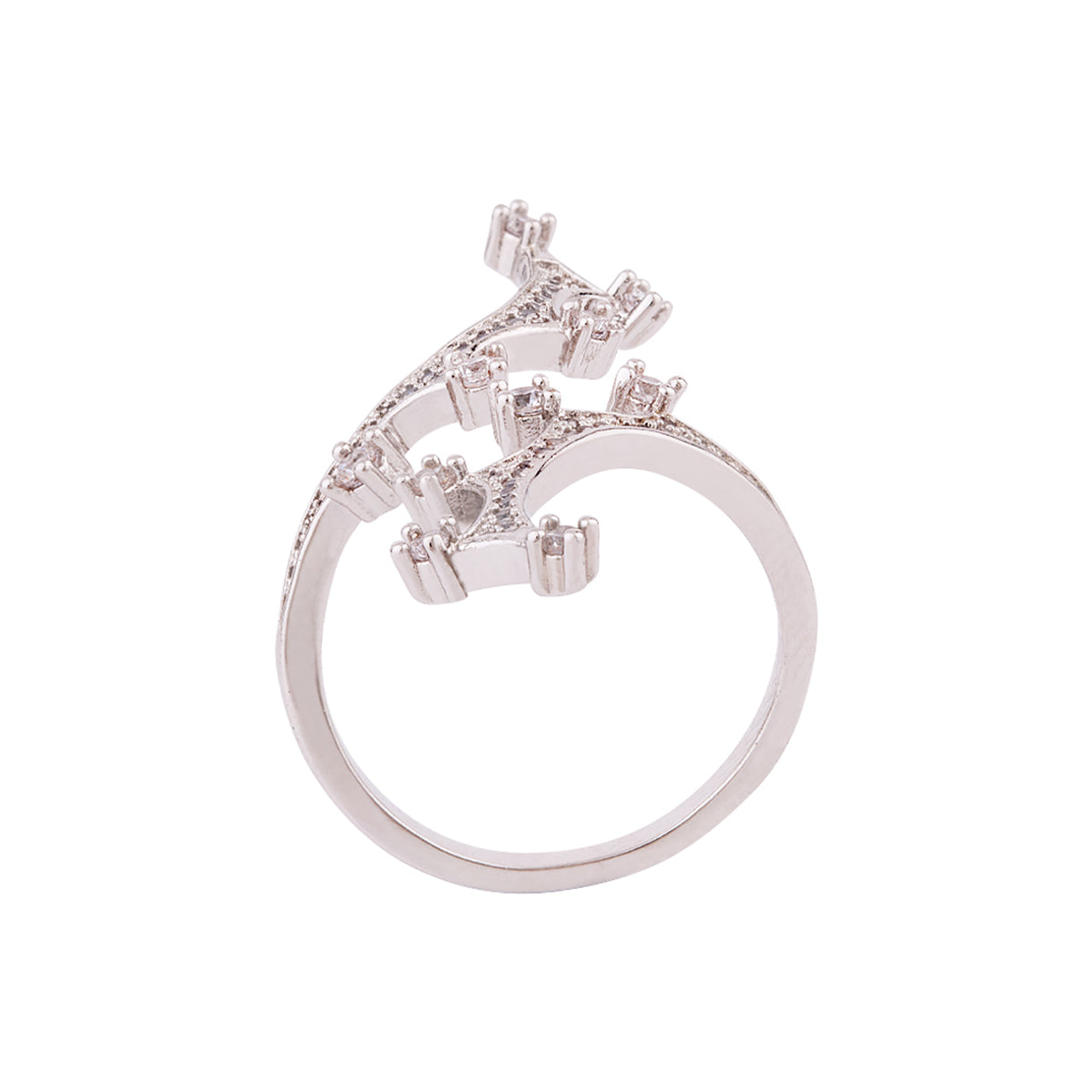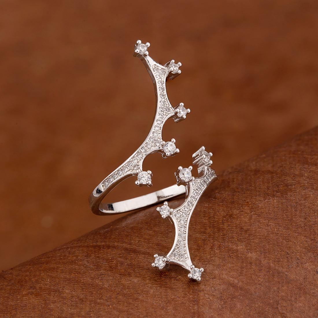 Silver plated brass ring fashioned into a crown motif. CZ gems embellished. Pair with a summer dress. This piece of jewelry comes with the Voylla assurance of quality and durability.