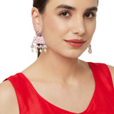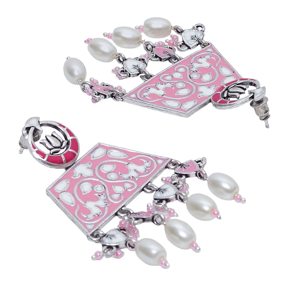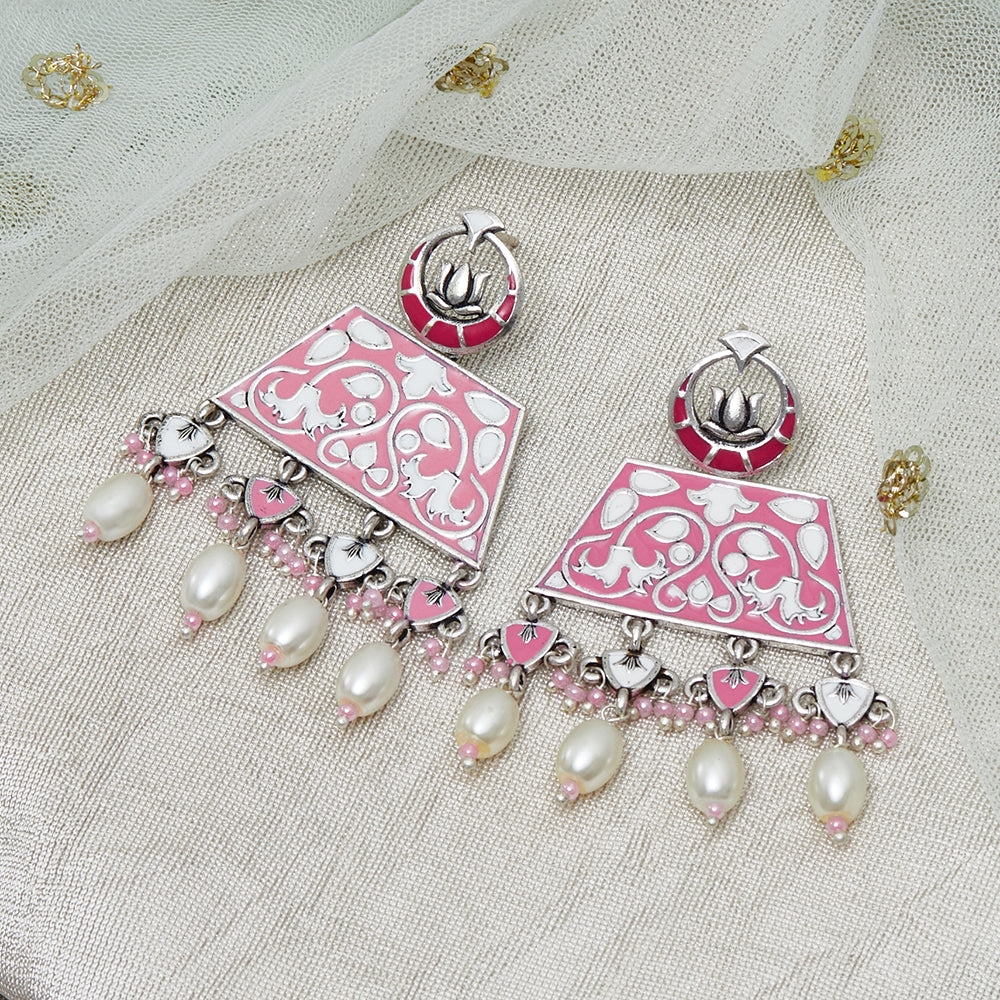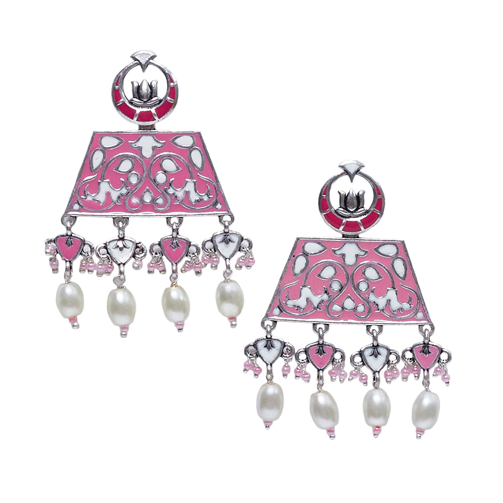 These beautiful earrings with white stones and pearl are a delightful addition to your treasury. Floral pattern with pink hues of meenakari enamelling makes it perfect for every occasion