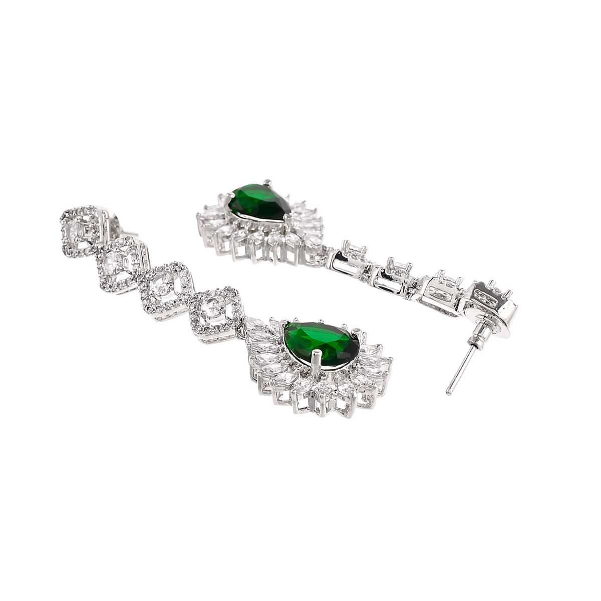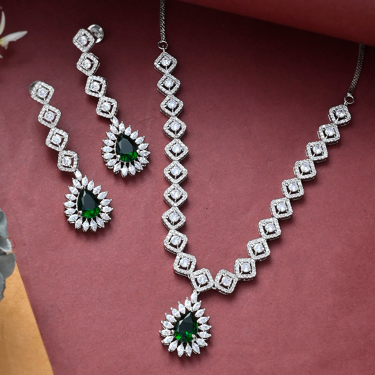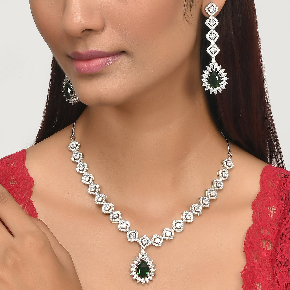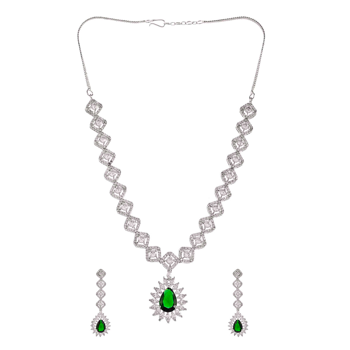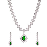 Silver Plated Teardrop Green and White Zircons Adorned Brass Jewellery Set