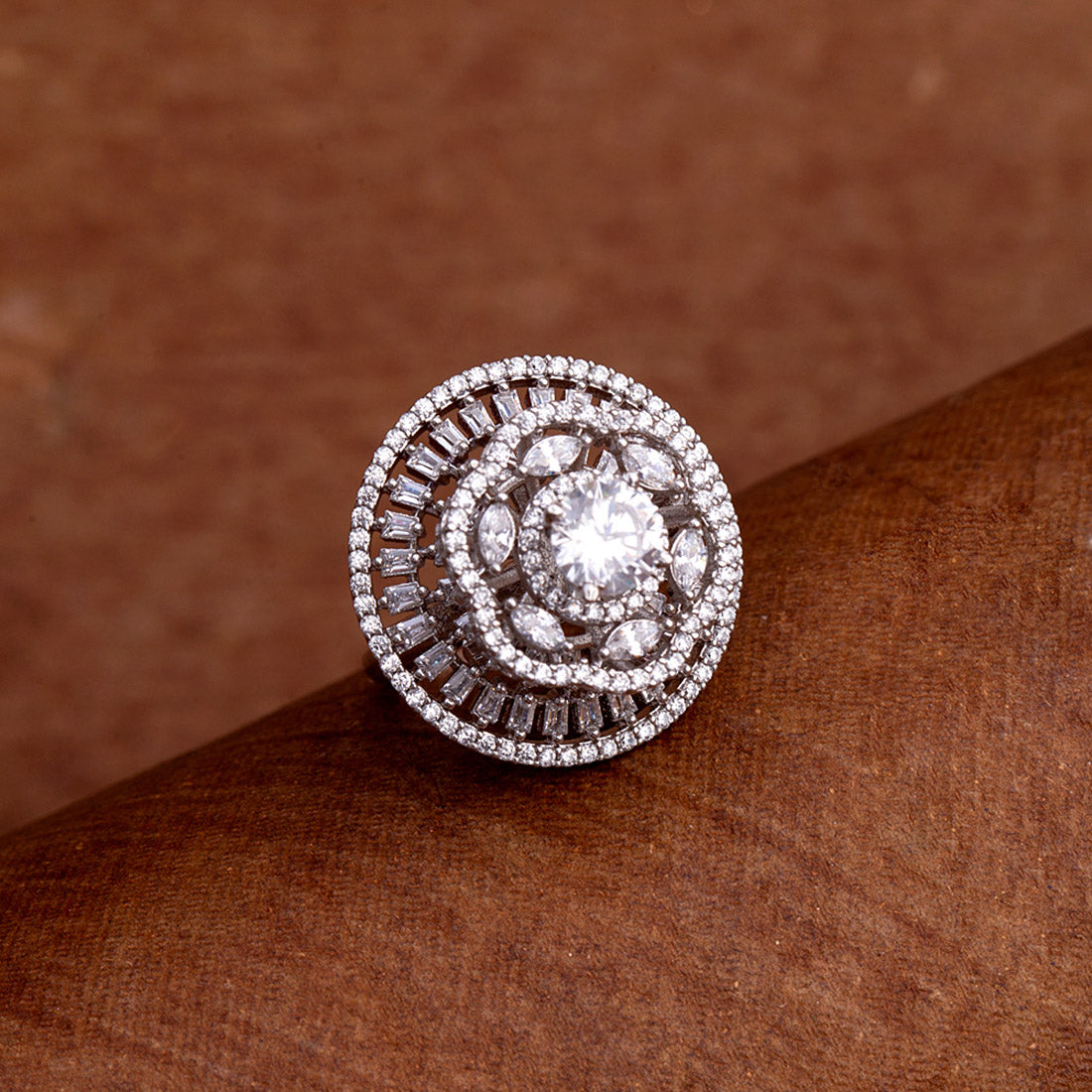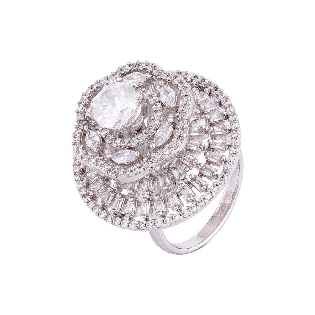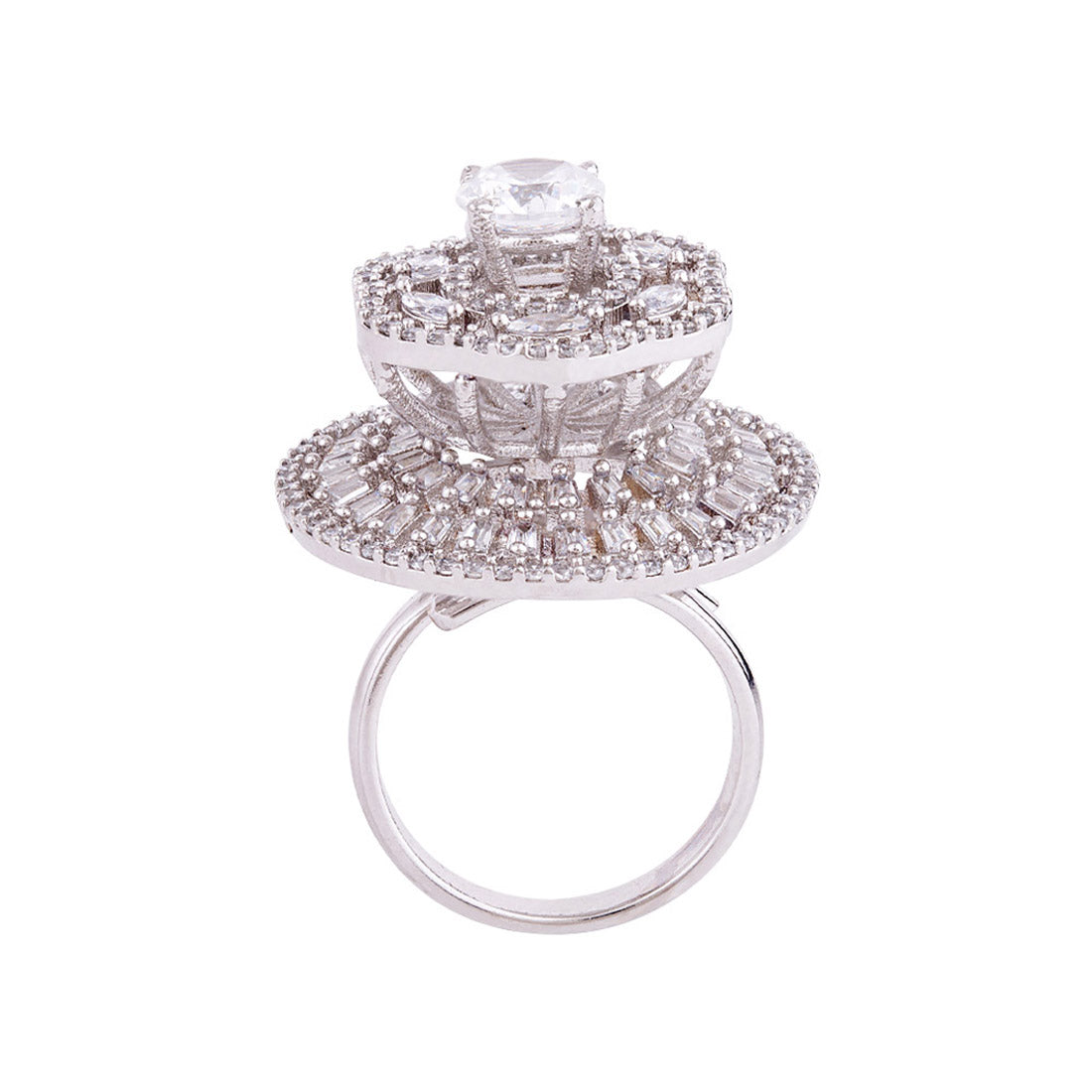 Statement ring made from brass and silver plated. Heavily embellished with zircon gemstones. Good for formal looks.