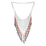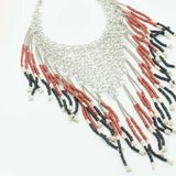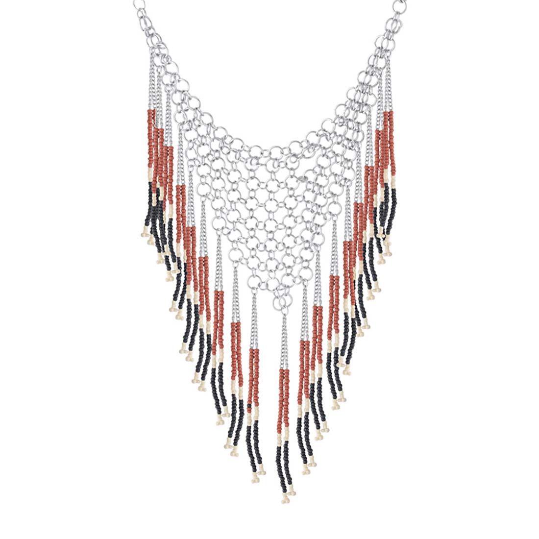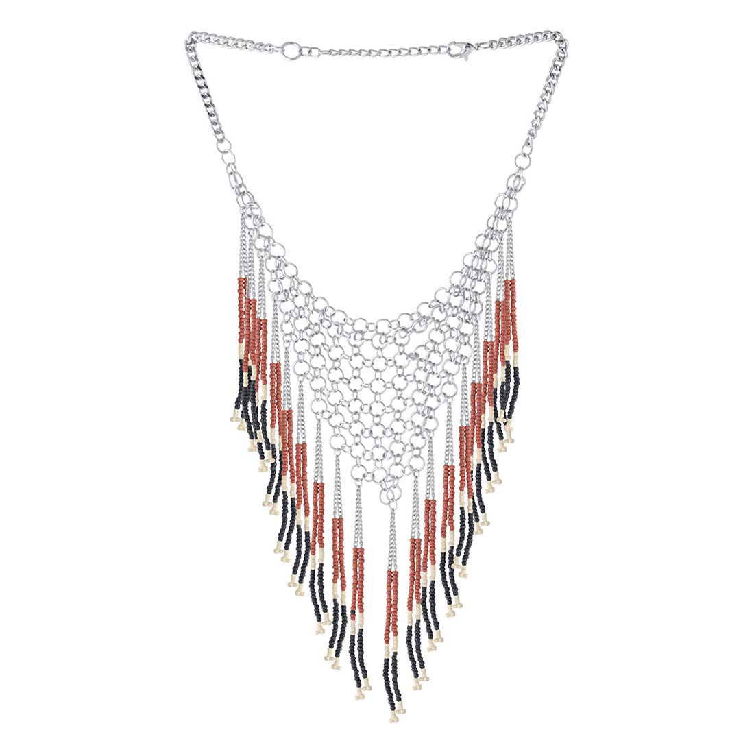 Inspire envy with this modern necklace adorned with cute red and black beads. Glossy silver tone and interlinked chain design make it a jewelry worth spending.