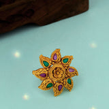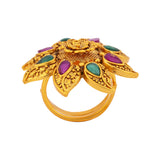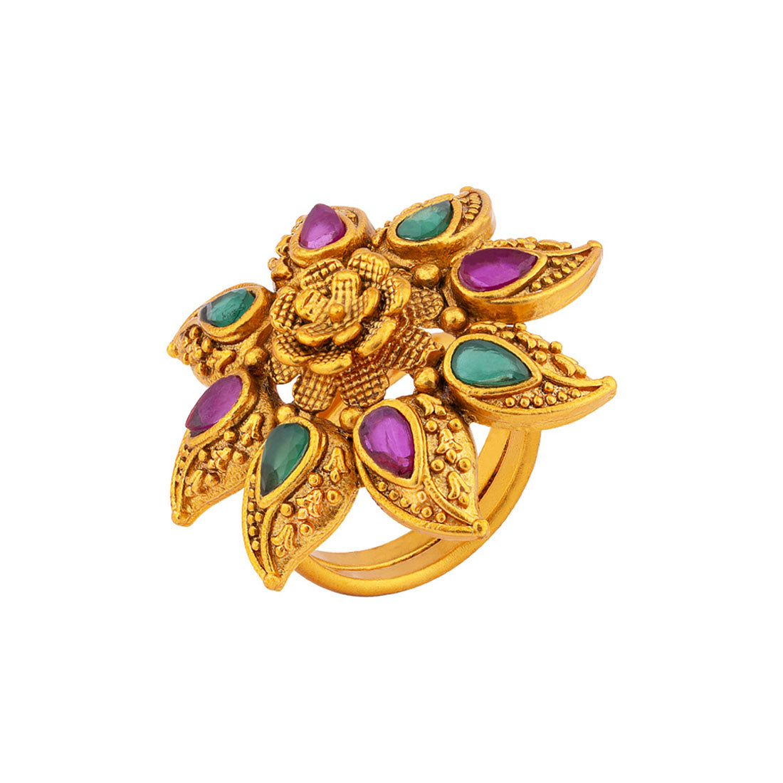Coloured stones embellished ring. Fashioned out of brass and yellow gold plated. Wear with ethnic attire.