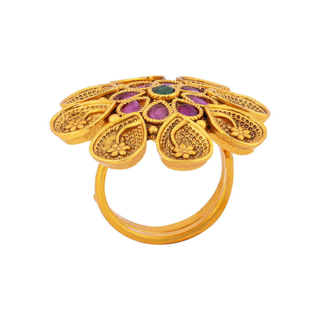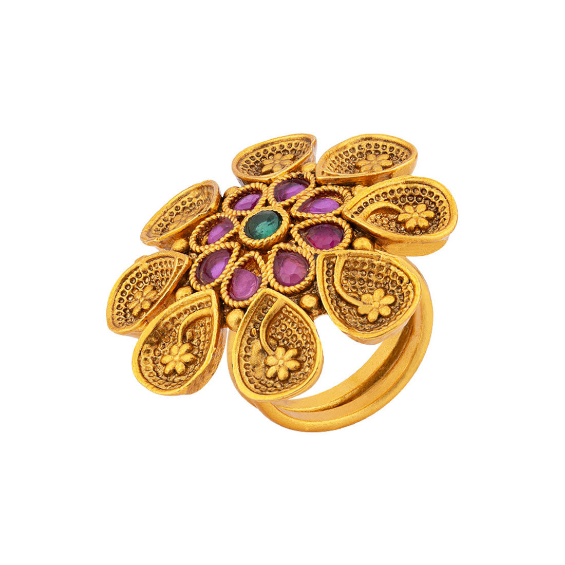 Cocktail ring fashioned from brass into a floral motif. Yellow gold plated and good for ethnic looks.