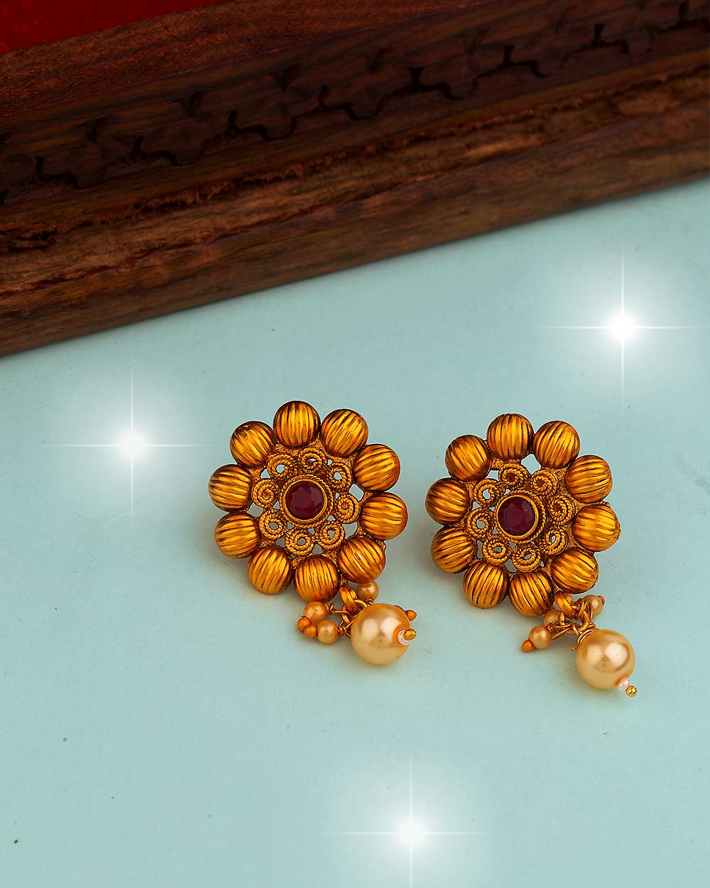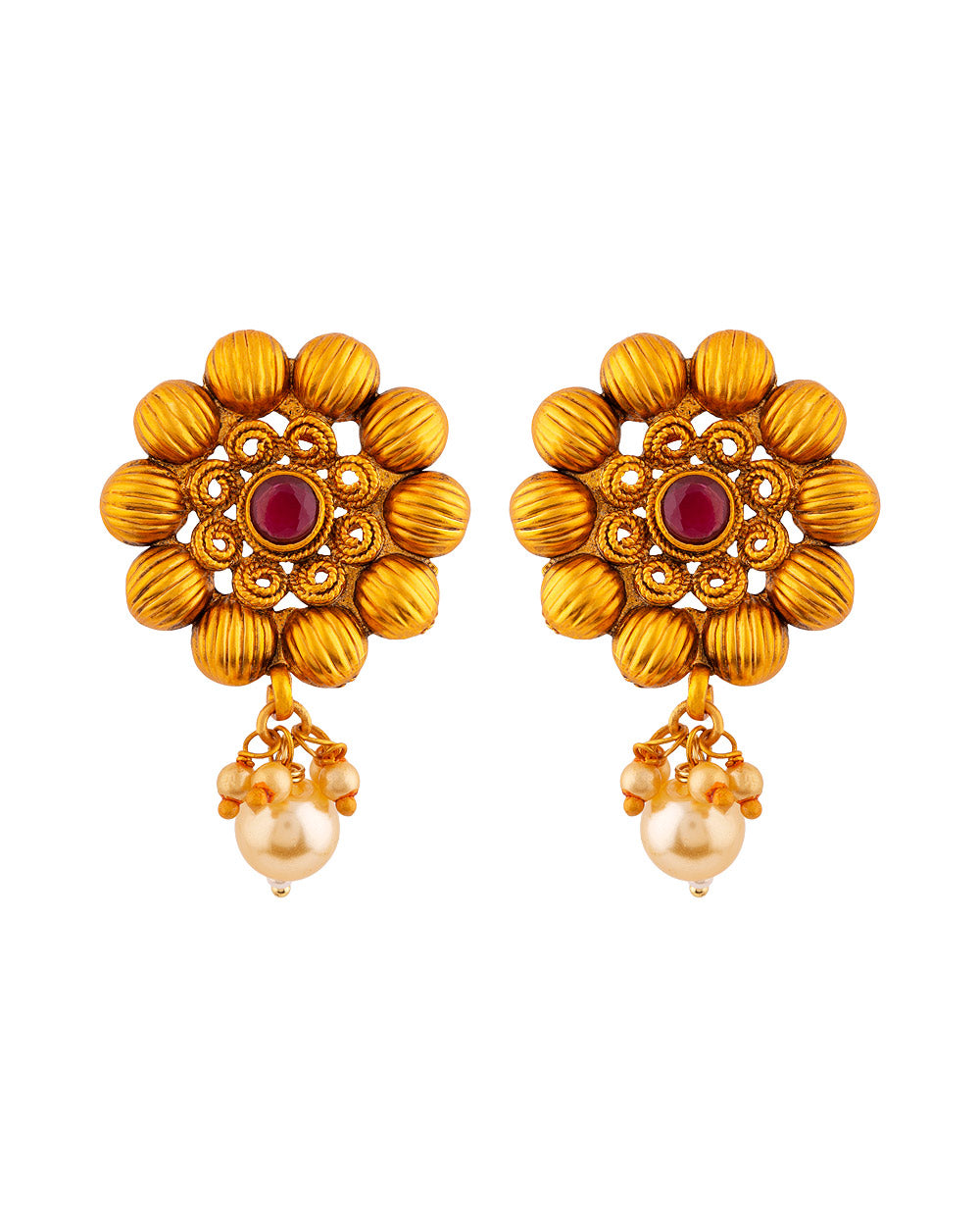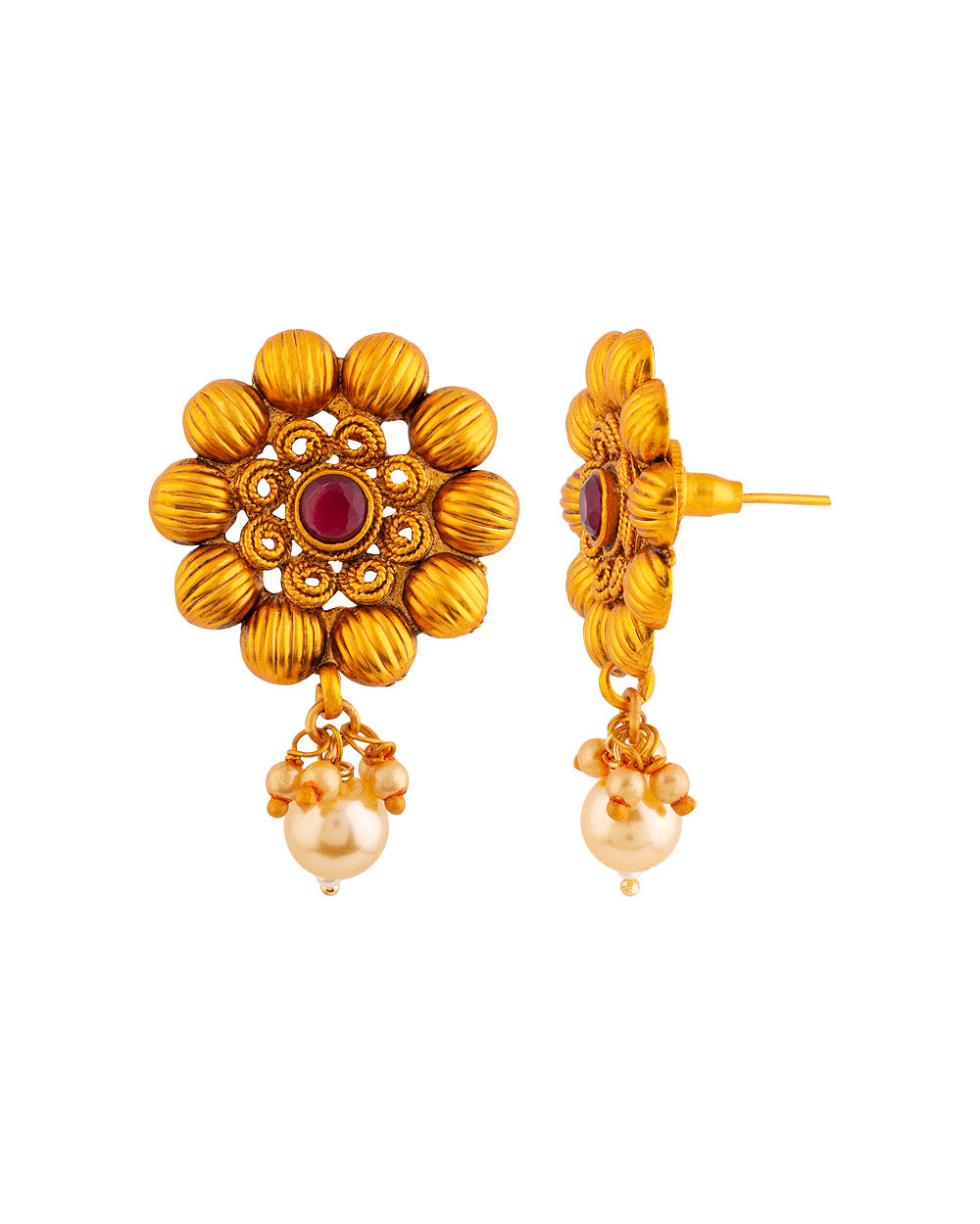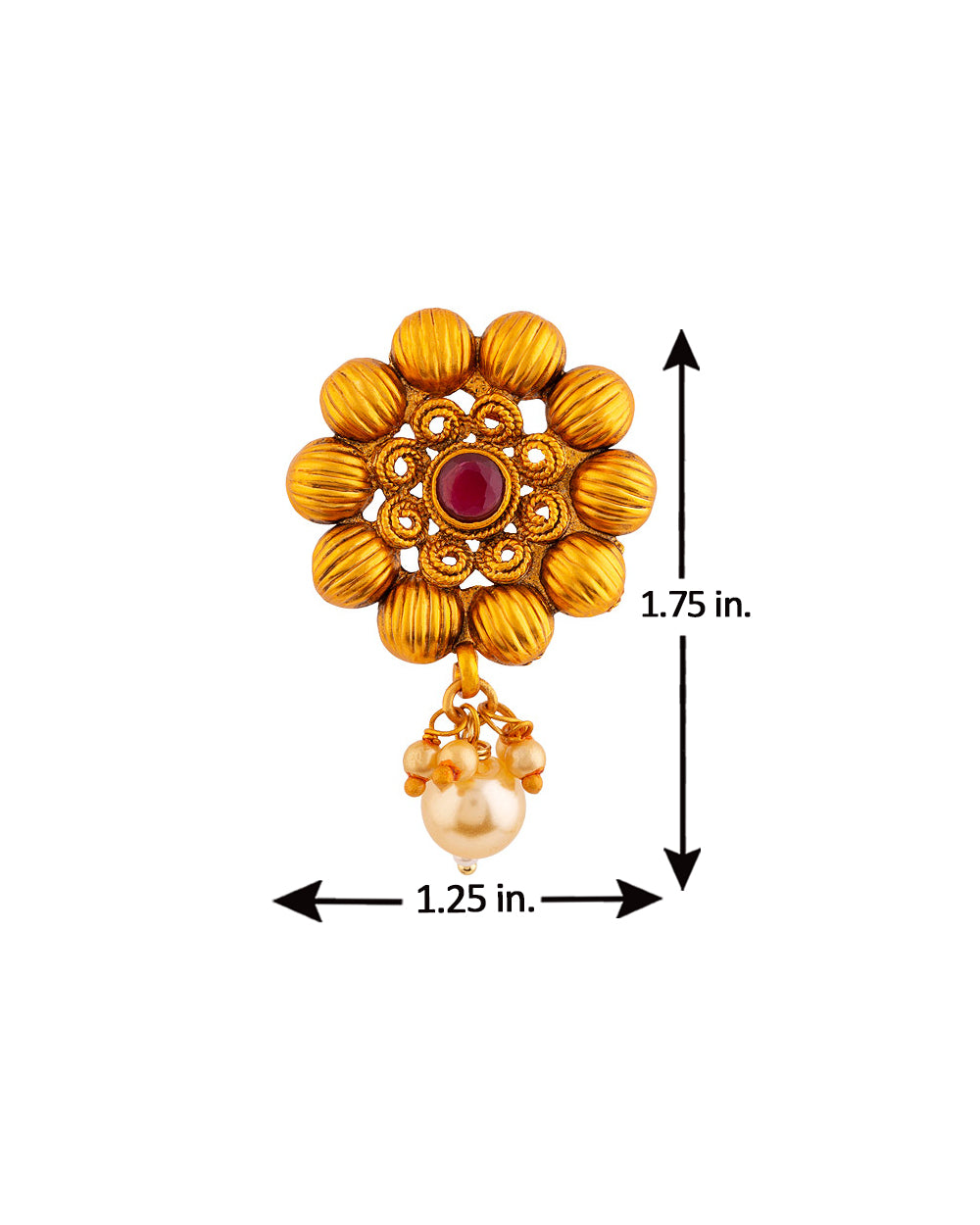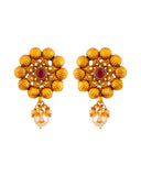 Floral motifs faux pearls adorned brass earrings. Copper plated and a good match for ethnic looks. This piece of jewelry comes with the Voylla assurance of quality and durability.