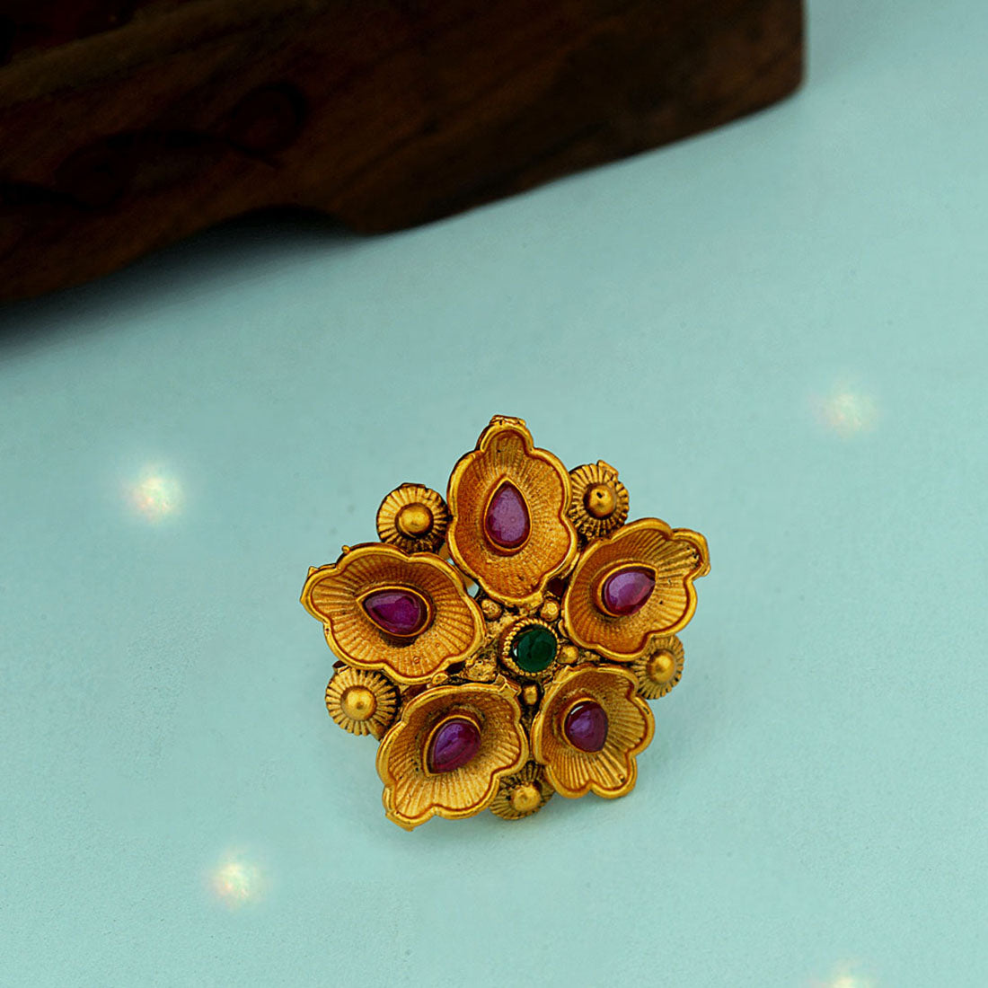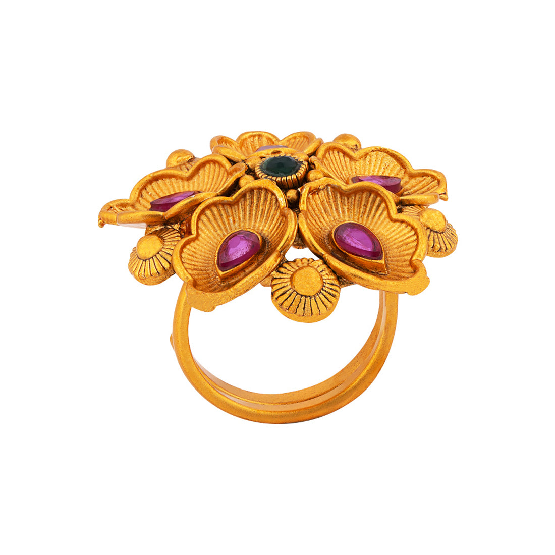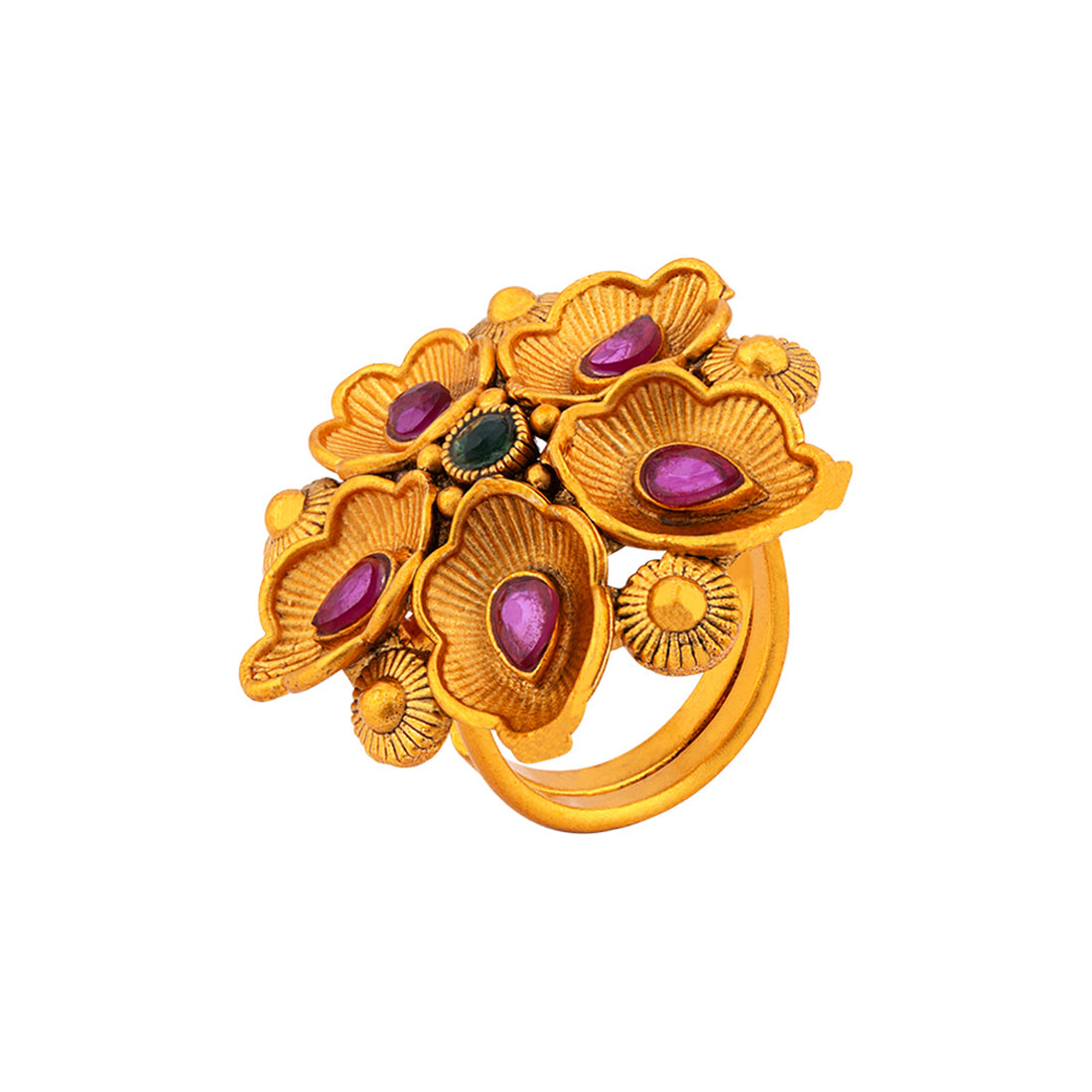Floral motif ring made from brass and yellow gold plated. Lightly embellished and good for formal looks.