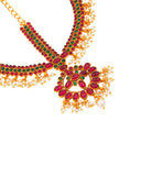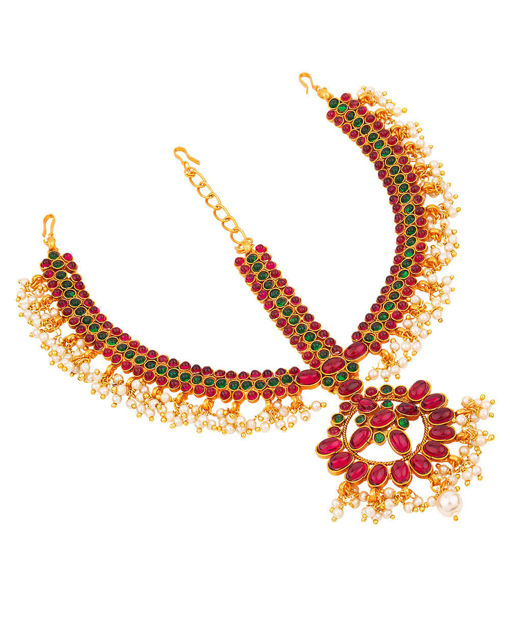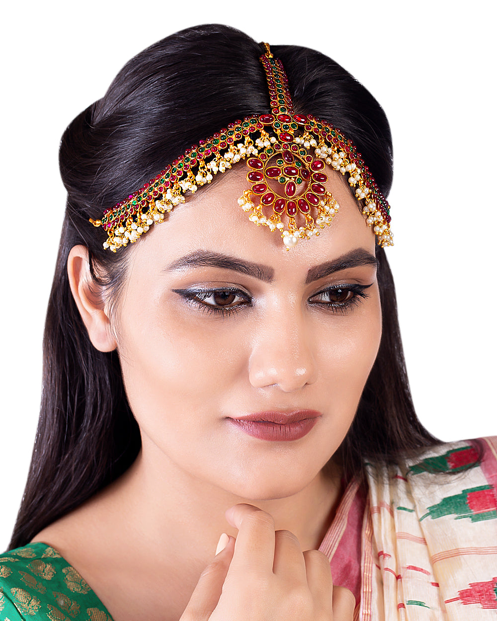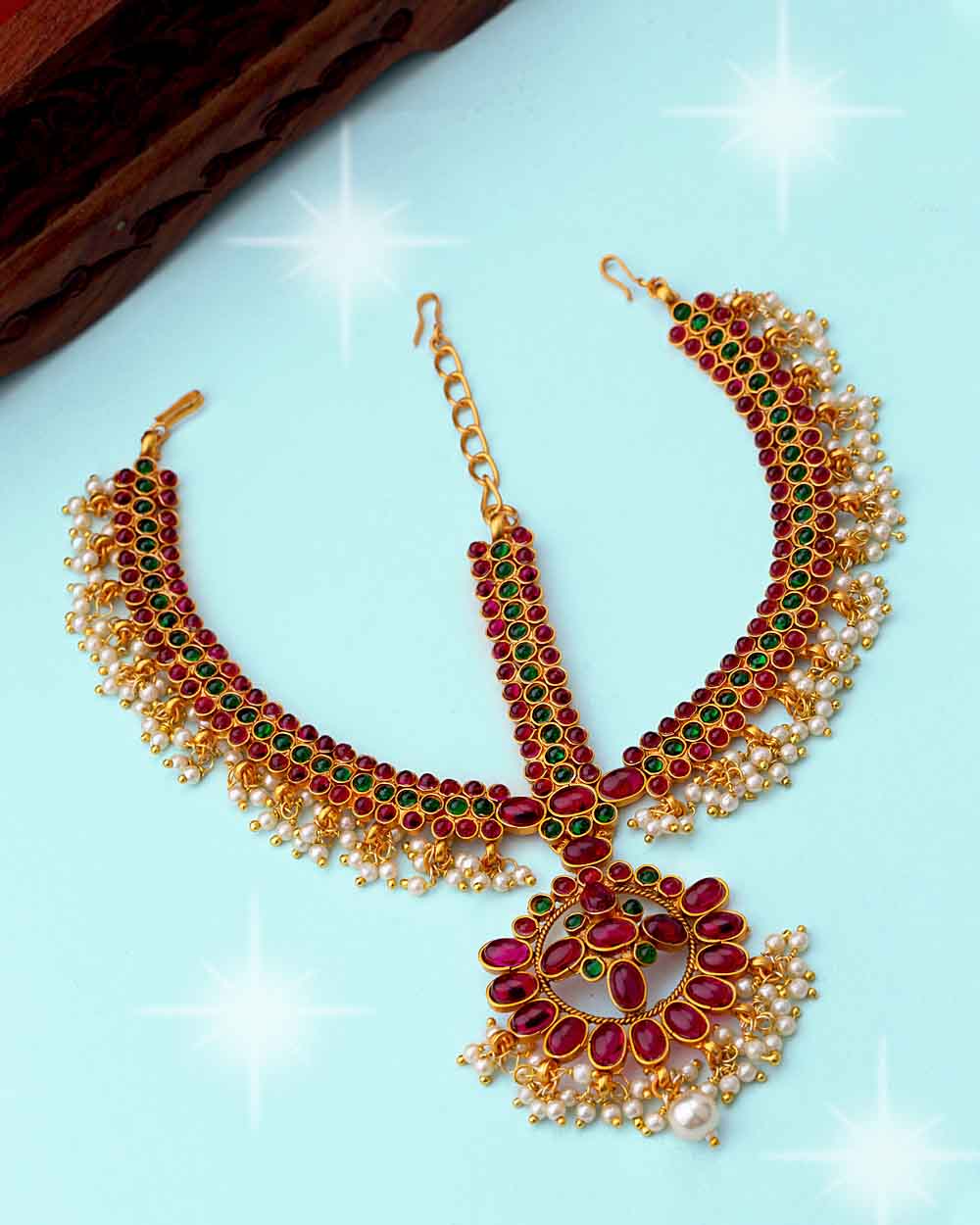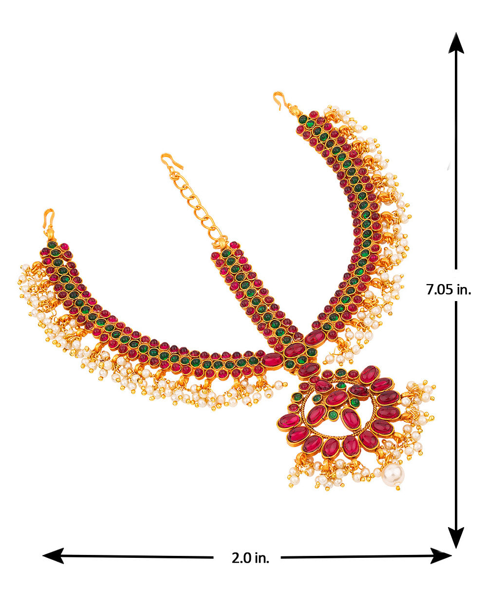 Floral motif maatha patti or maang tika made from brass. Embellished with faux pearls and zircon gems and yellow gold plated. Pair with traditional Indian looks.