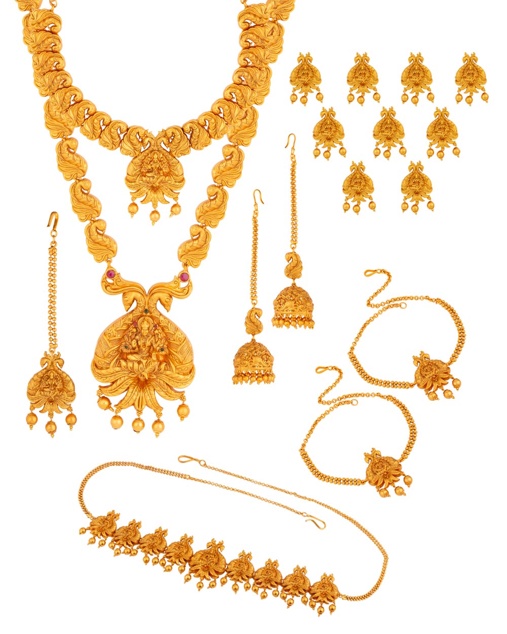 Brass bridal set with yellow gold plating. Embellished and good for traditional bridal wear.