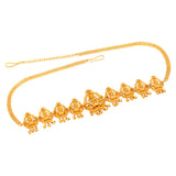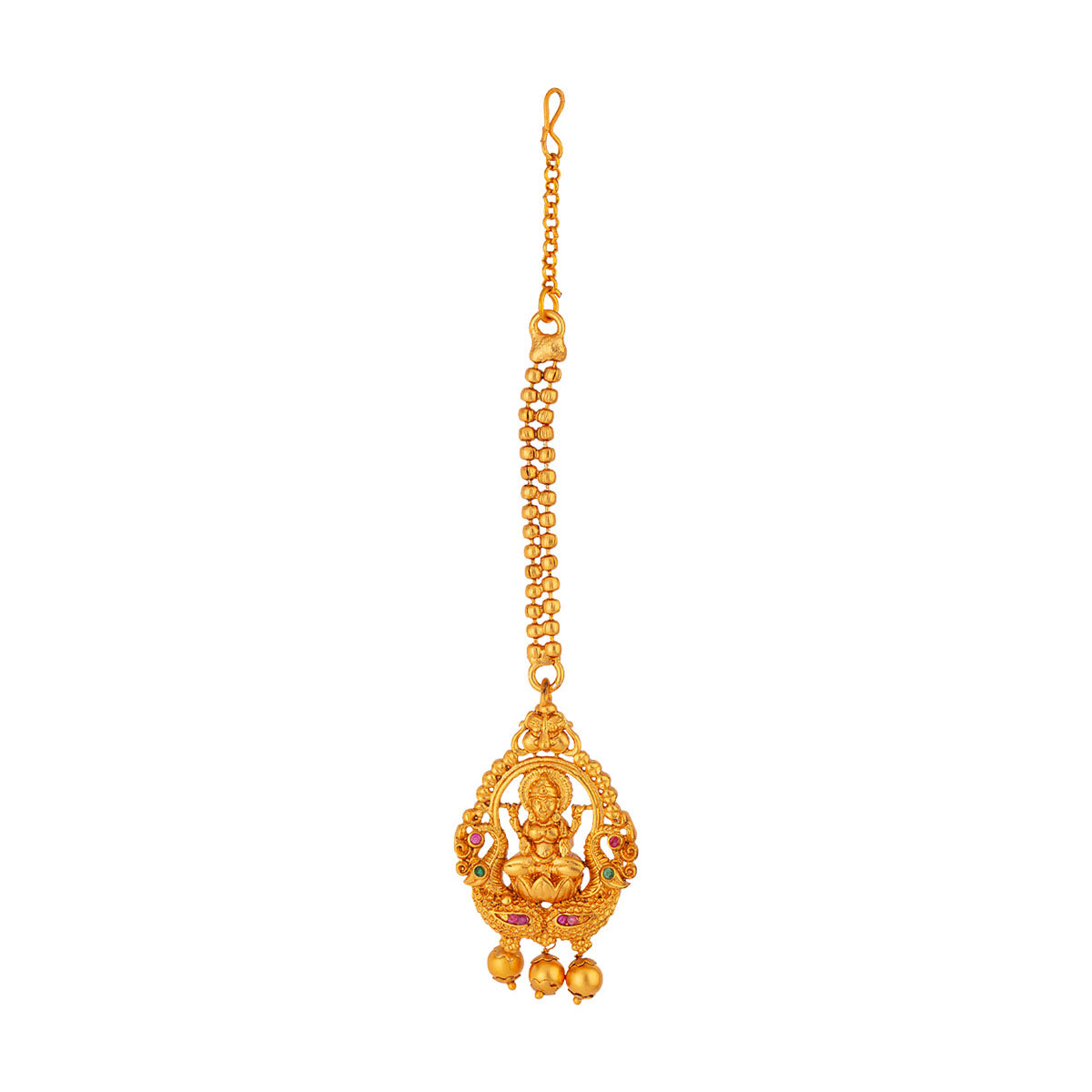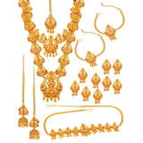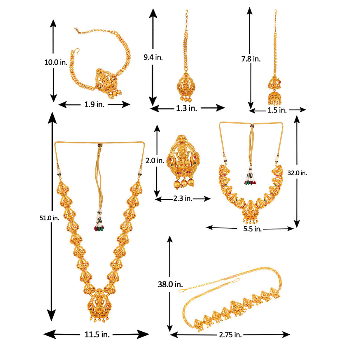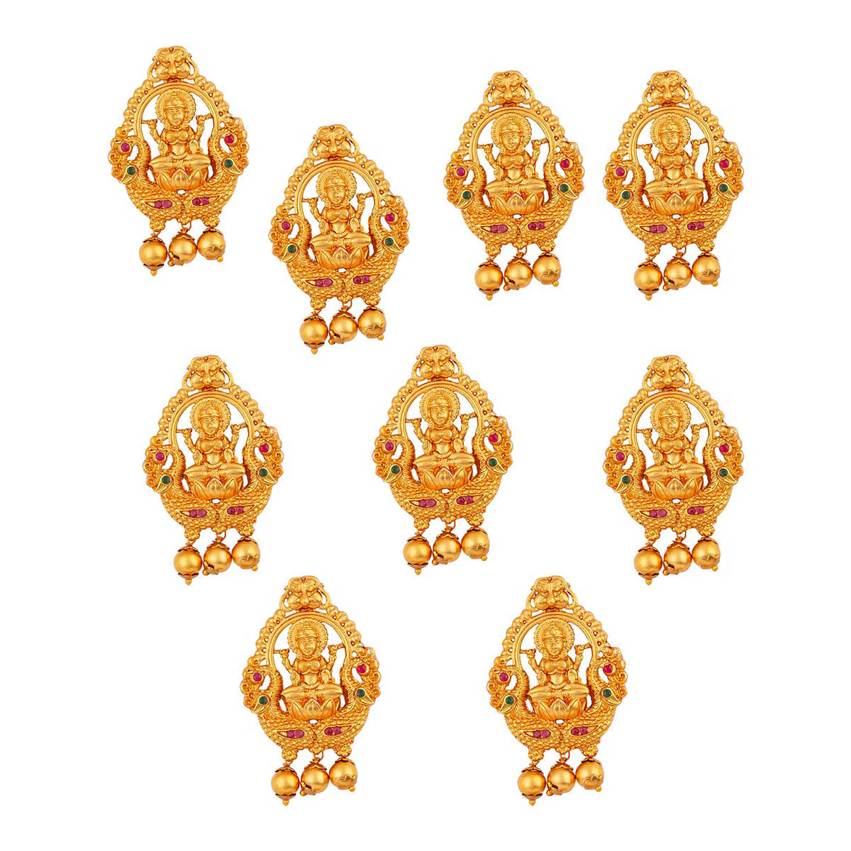 Goddess Lakshmi motifs adorned bridal set, fashioned out of brass. Yellow gold plated and inclusive of all essential accessories. Pair with Indian bridal outfits.