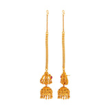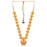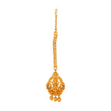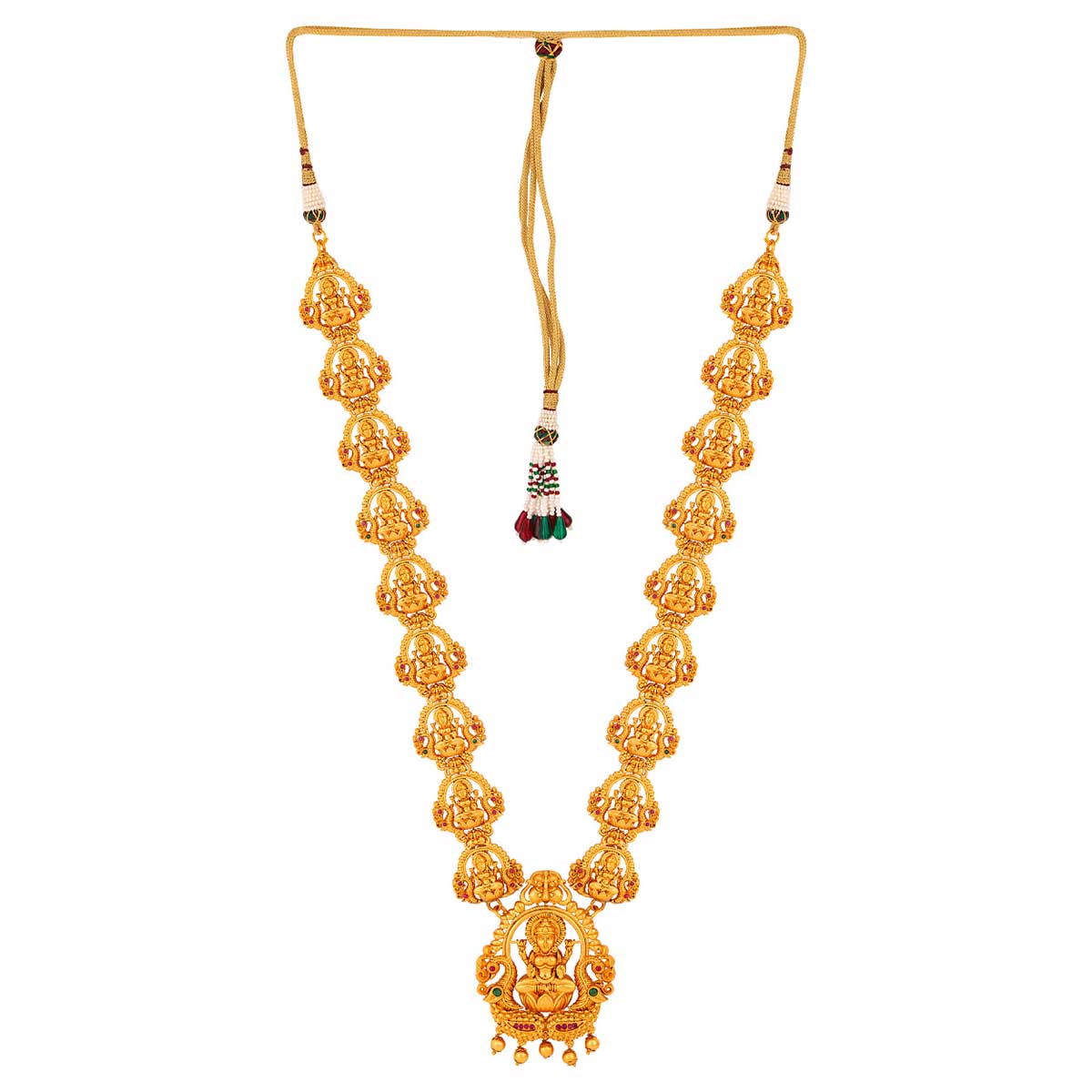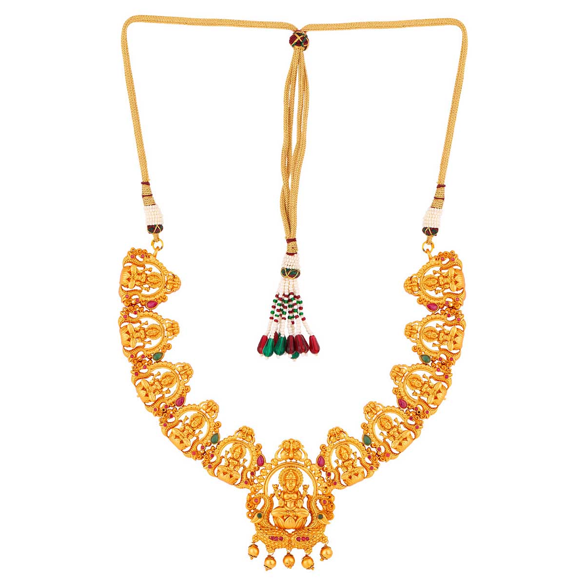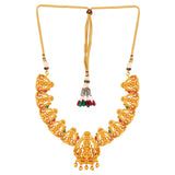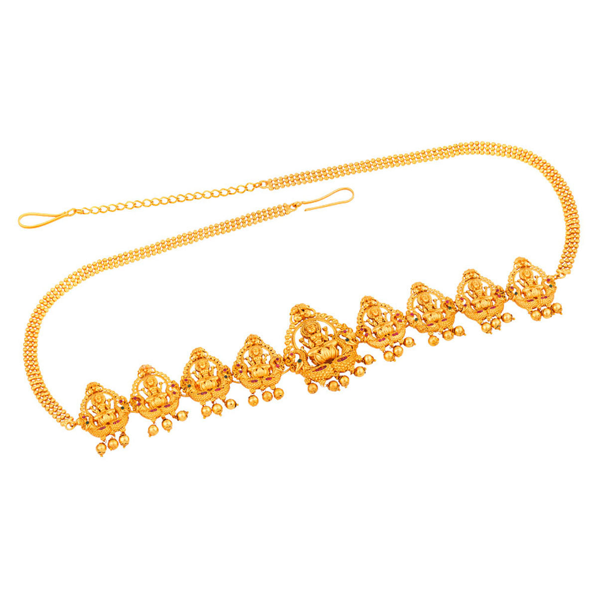 Goddess Lakshmi motifs adorned bridal set, fashioned out of brass. Yellow gold plated and inclusive of all essential accessories. Pair with Indian bridal outfits.