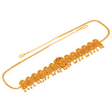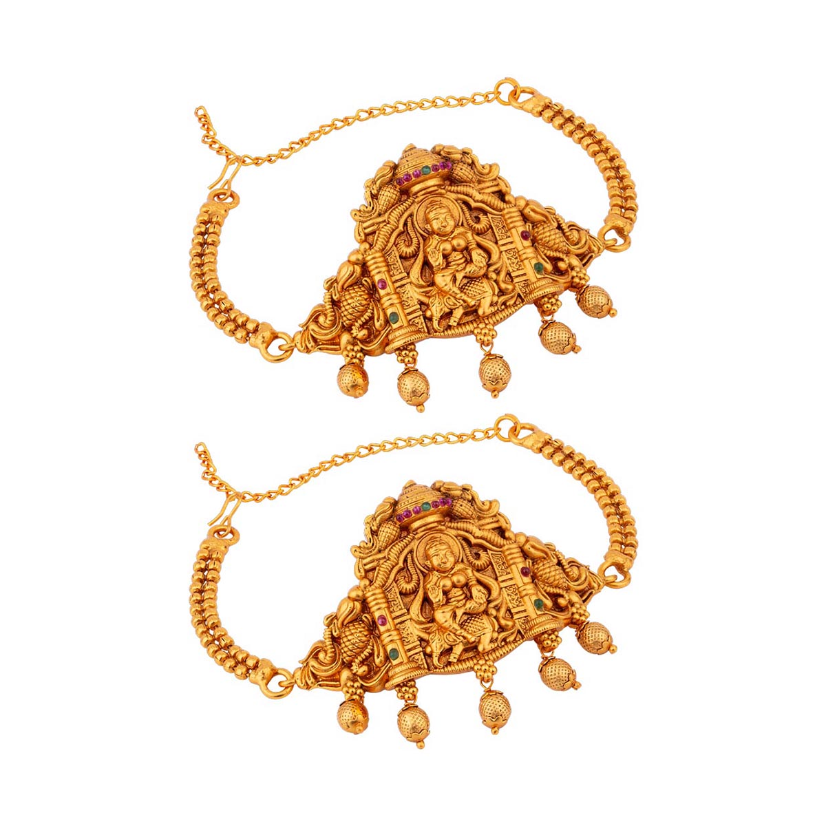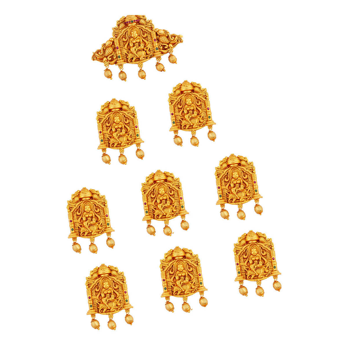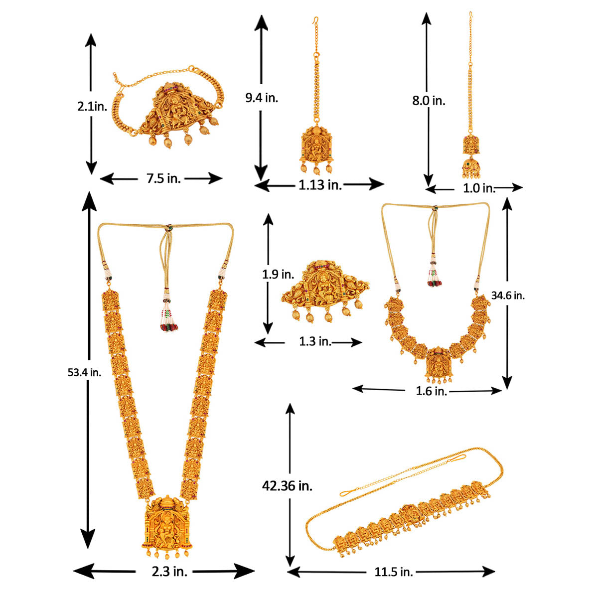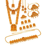 Temple inspired bridal set with all essential accessories. Made from brass and highly detailed. Yellow gold plated and a good match for ethnic bridal outfits.
