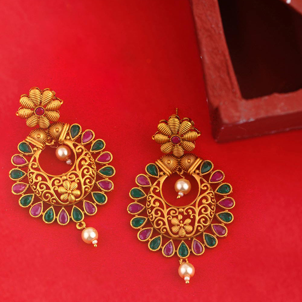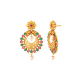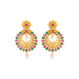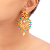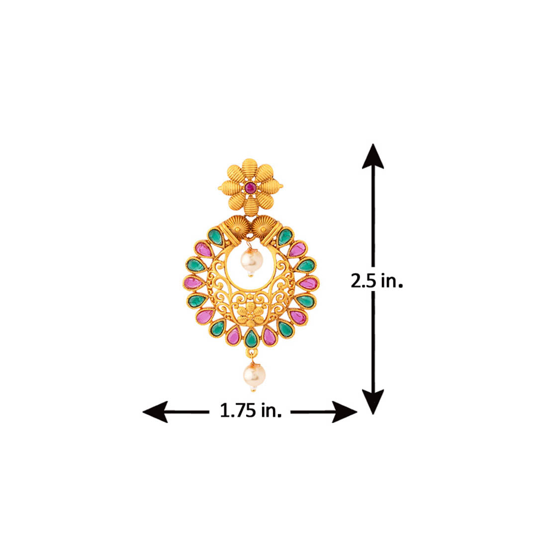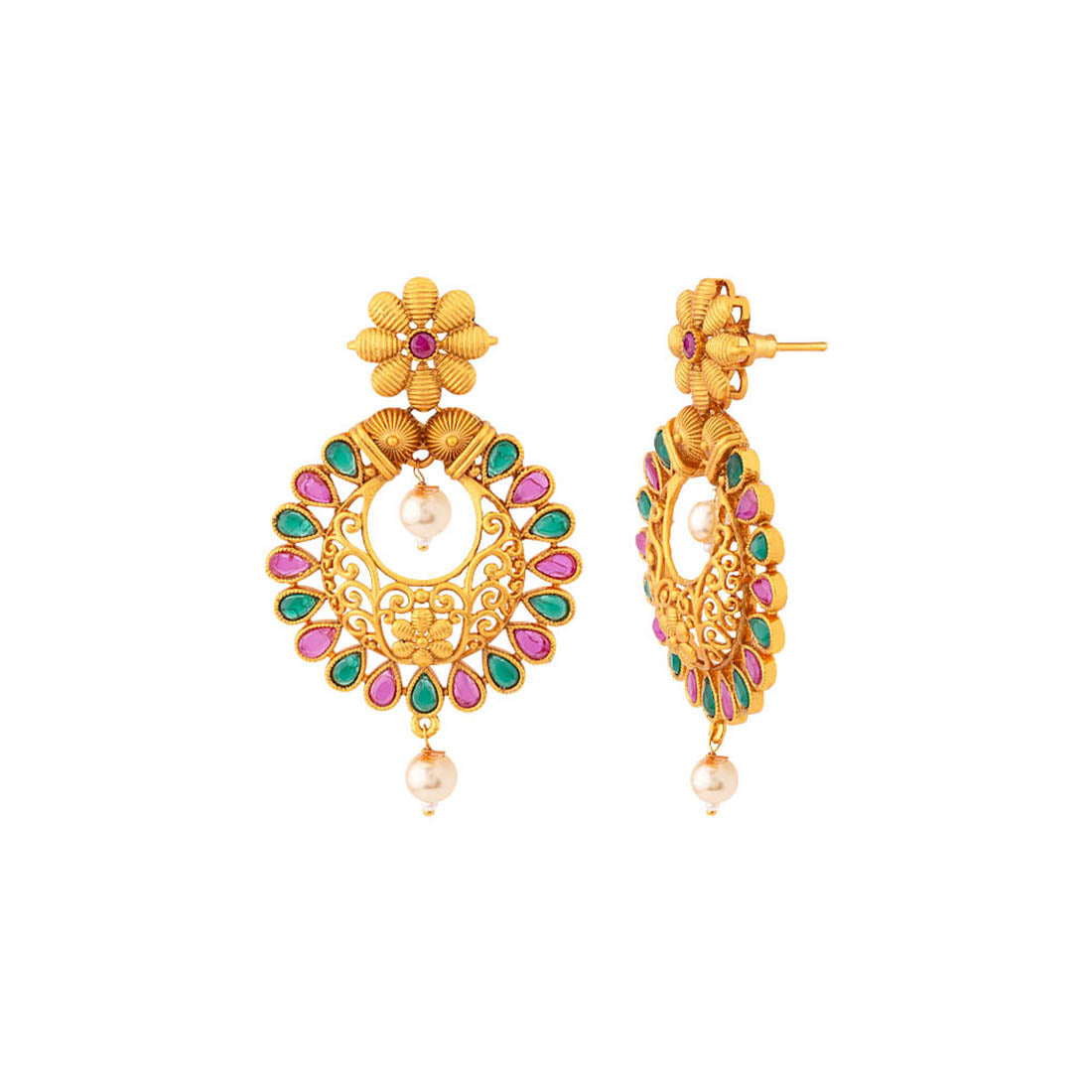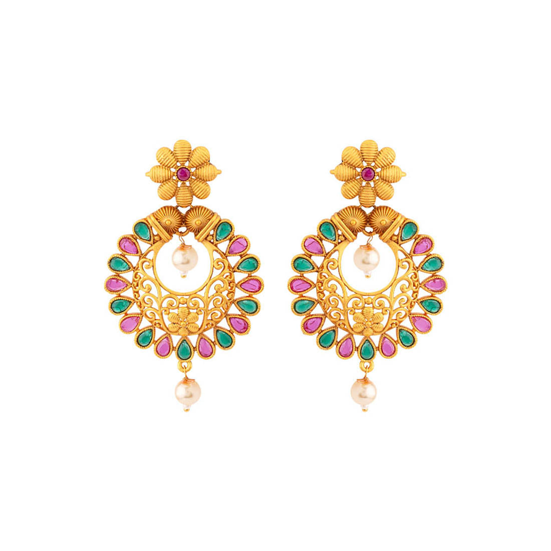 Floral motifs and coloured gemstones adorned earrings. Fashioned out of brass and copper plated. Wear with a formal kurta.