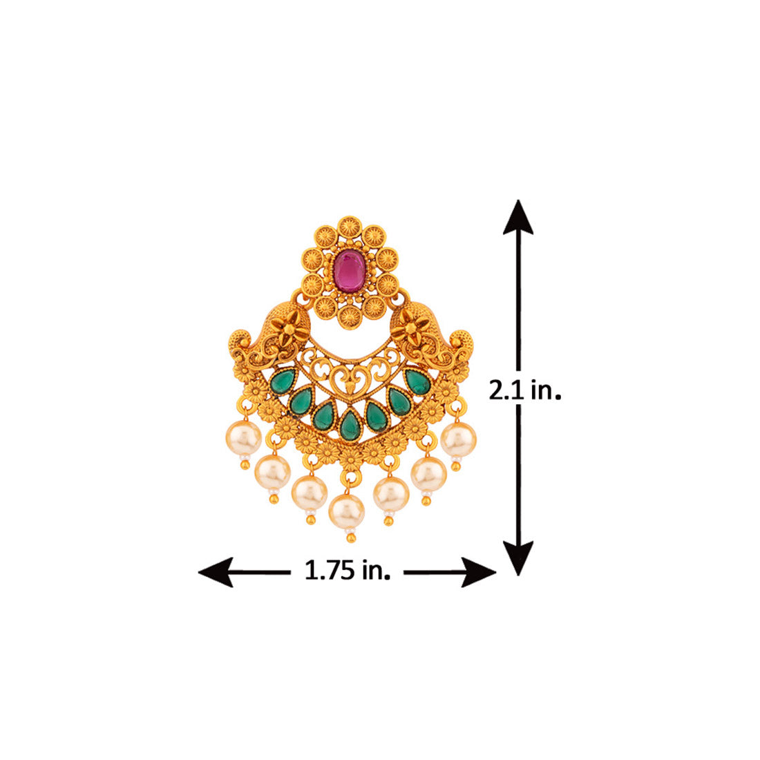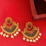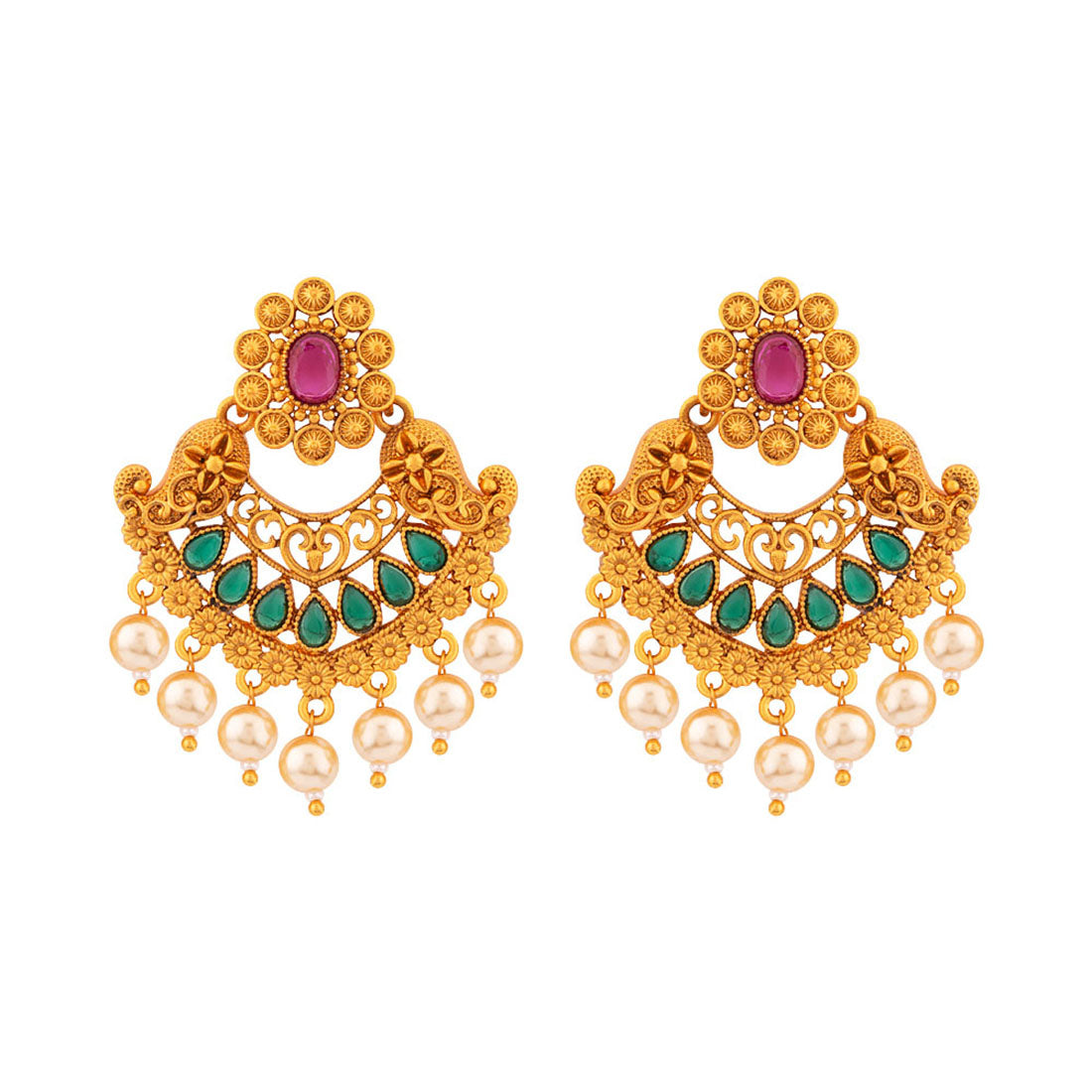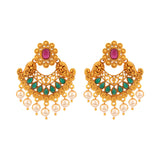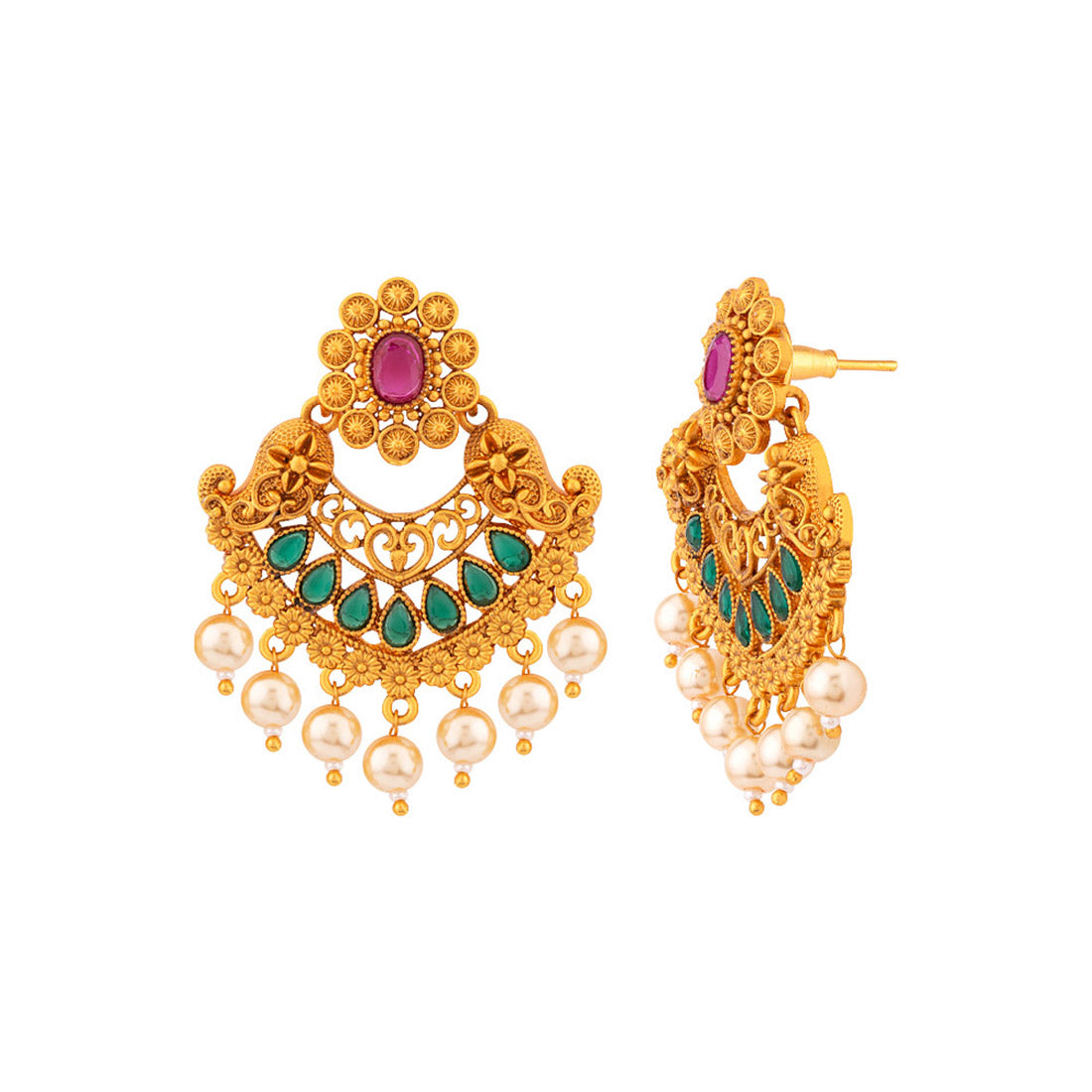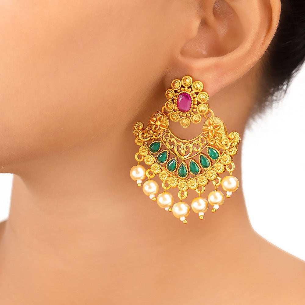 Heavily embellished ethnic hoop earrings with floral motifs. Made from brass and copper plated. Pair with a silk saree.