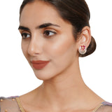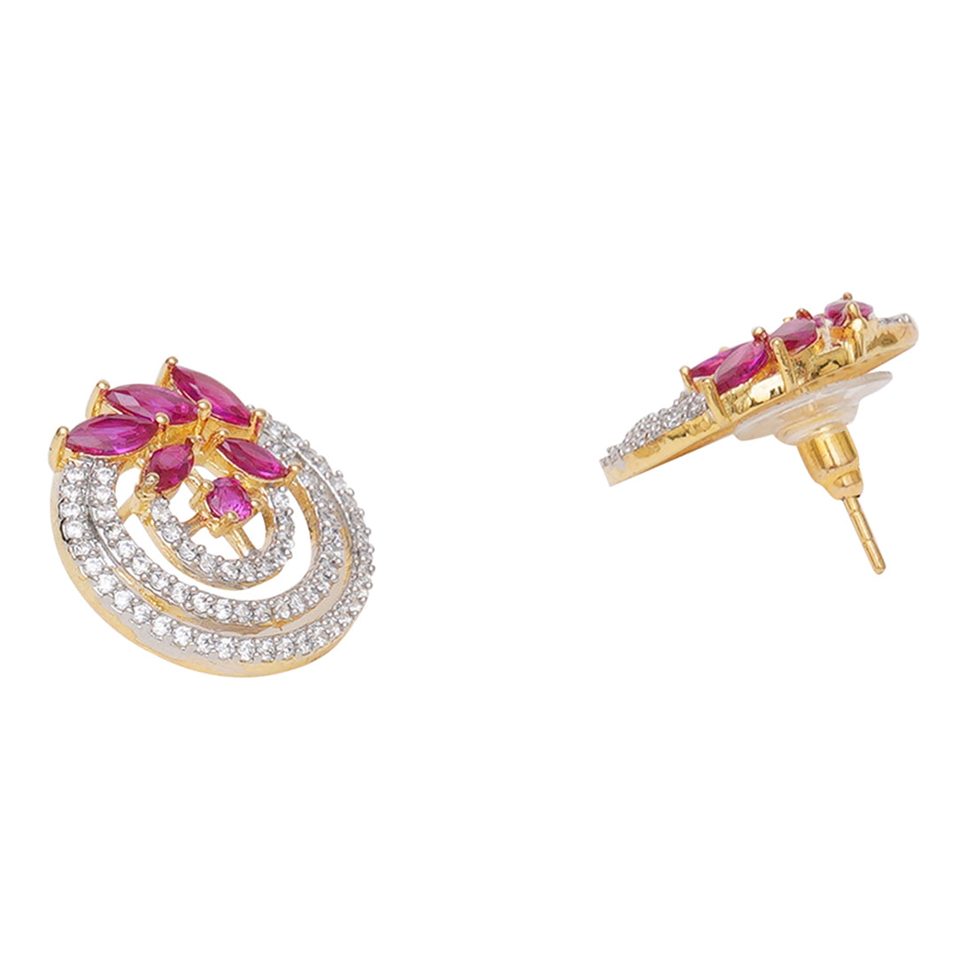 These uniquely designed ruby stone and american diamond earrings are sure to melt the heart of the one who wears it and the ones around her. The earrings feature oval cut ruby coloured stones placed exquisitely on the edge of loops of diamonds. Perfect to be worn alone as the star of the show or part of an necklace set to compliment your look.
