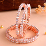 Four prong setting zirconia gemstones in a classic round cut adorn these brass bangle bracelets, which have been given a rose gold plating for added charm. Pair with formal outfits.