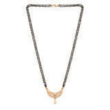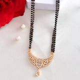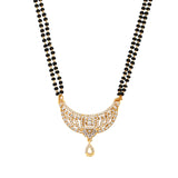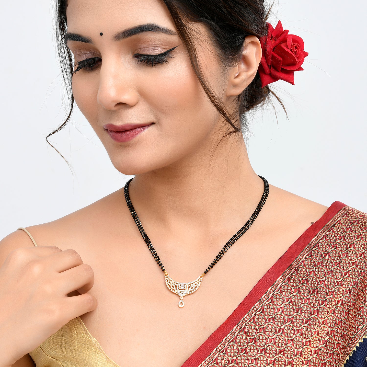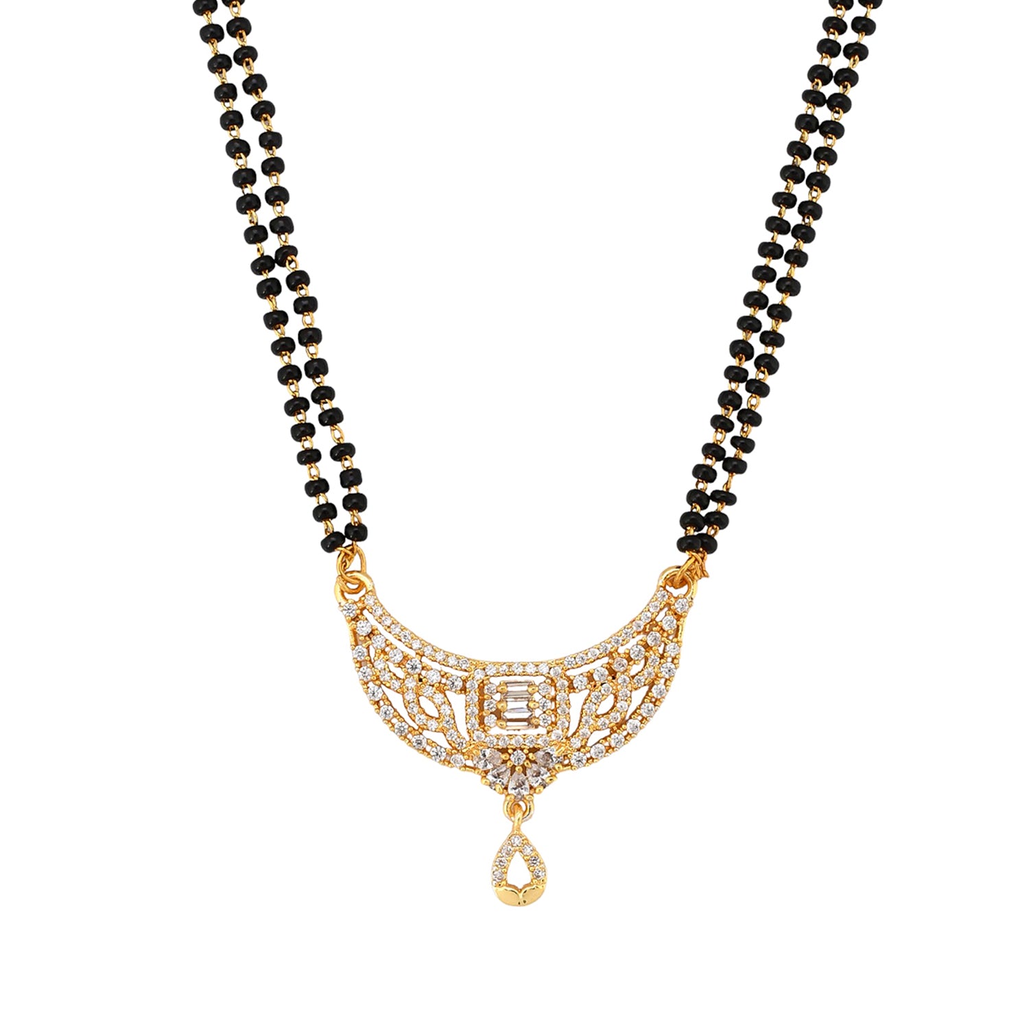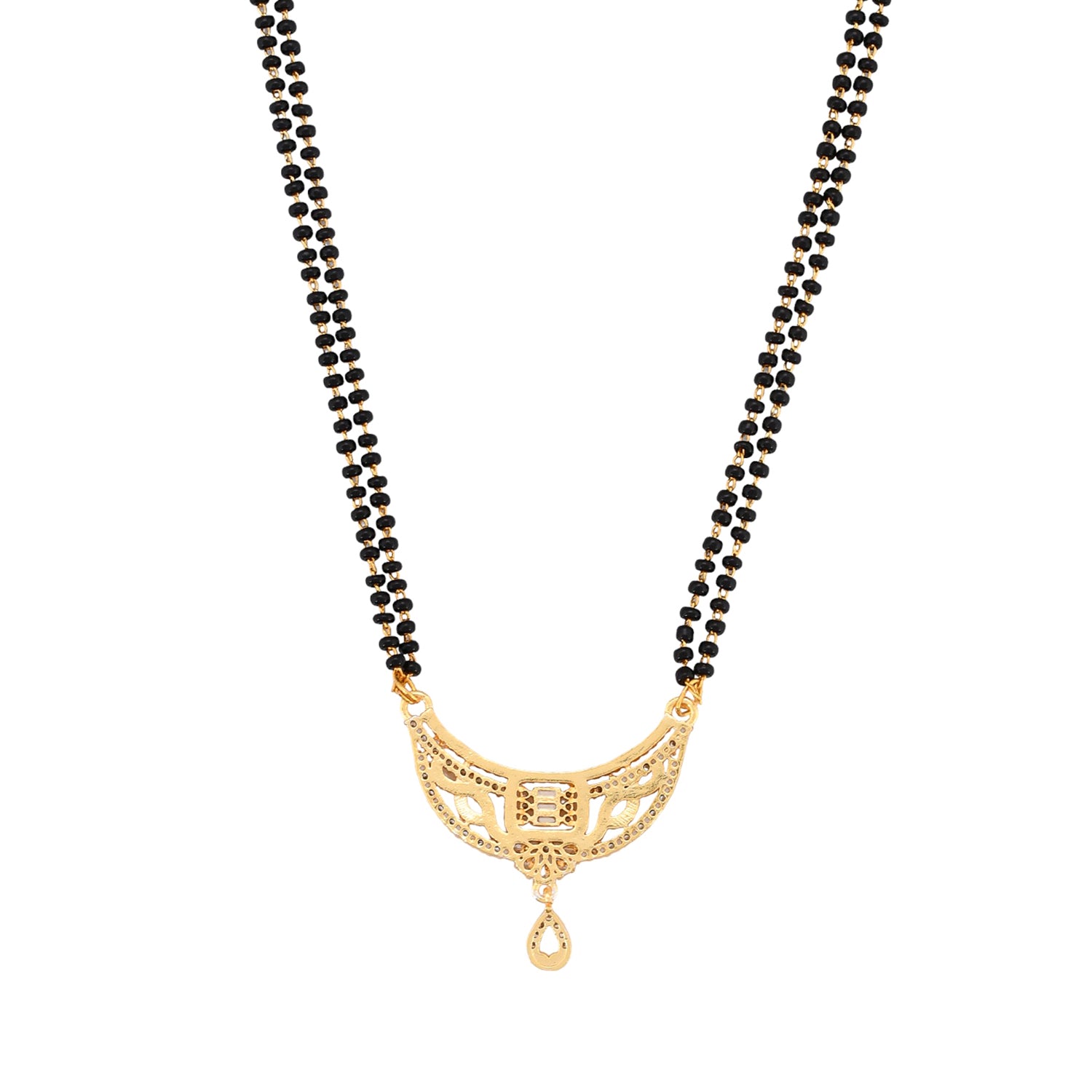 Black beads traditional mangalsutra with yellow gold plating. Made from brass and embellished with CZ gems. Good for everyday wear.