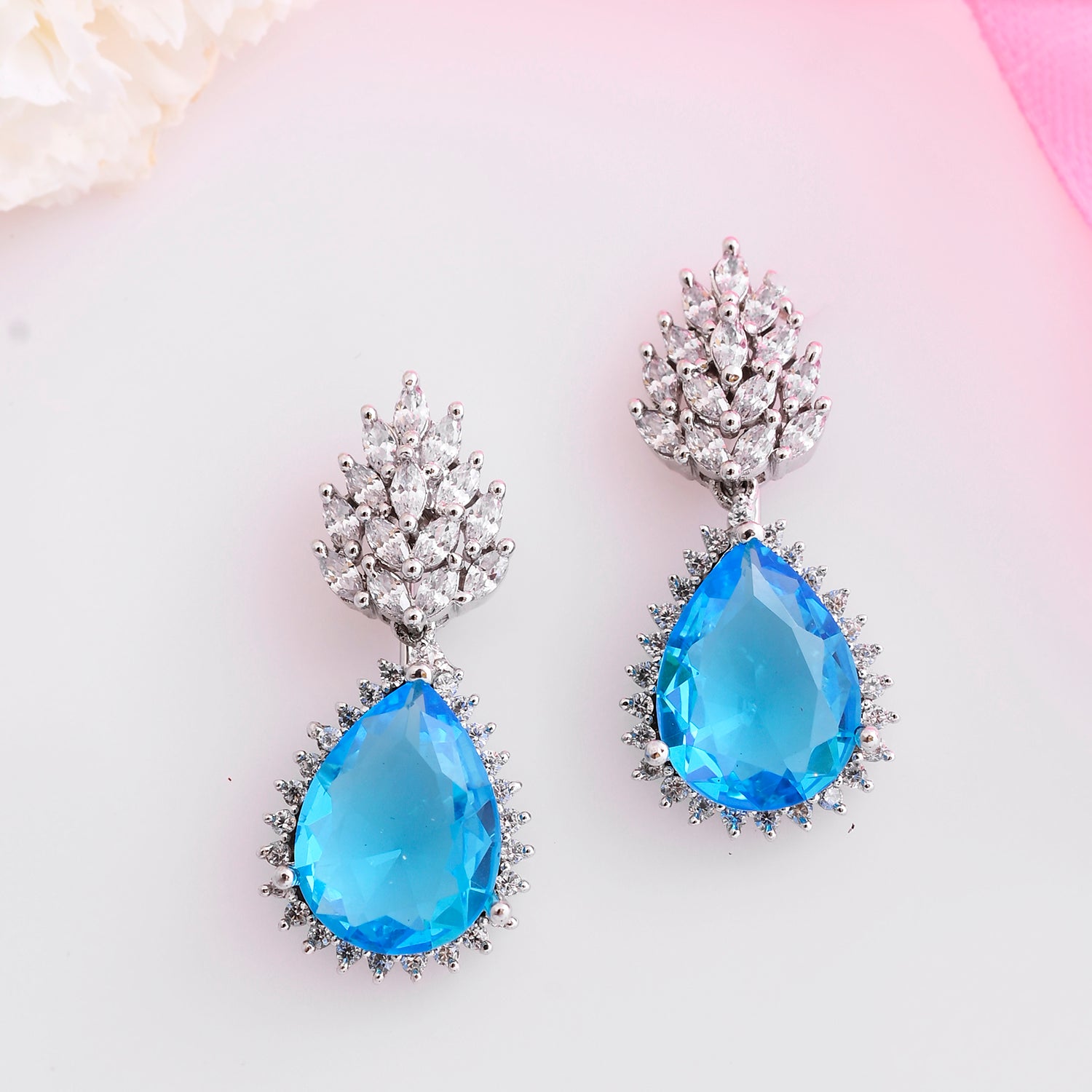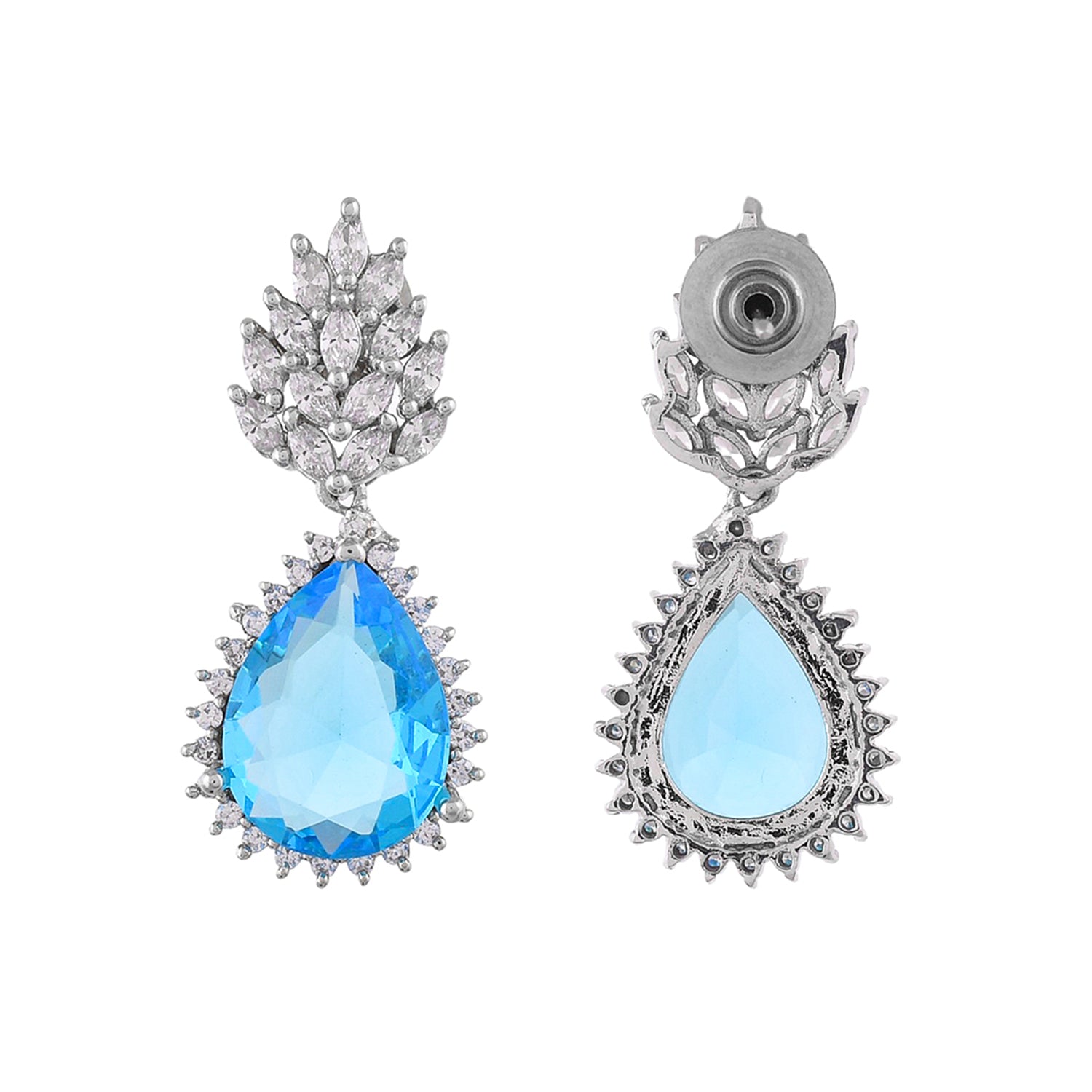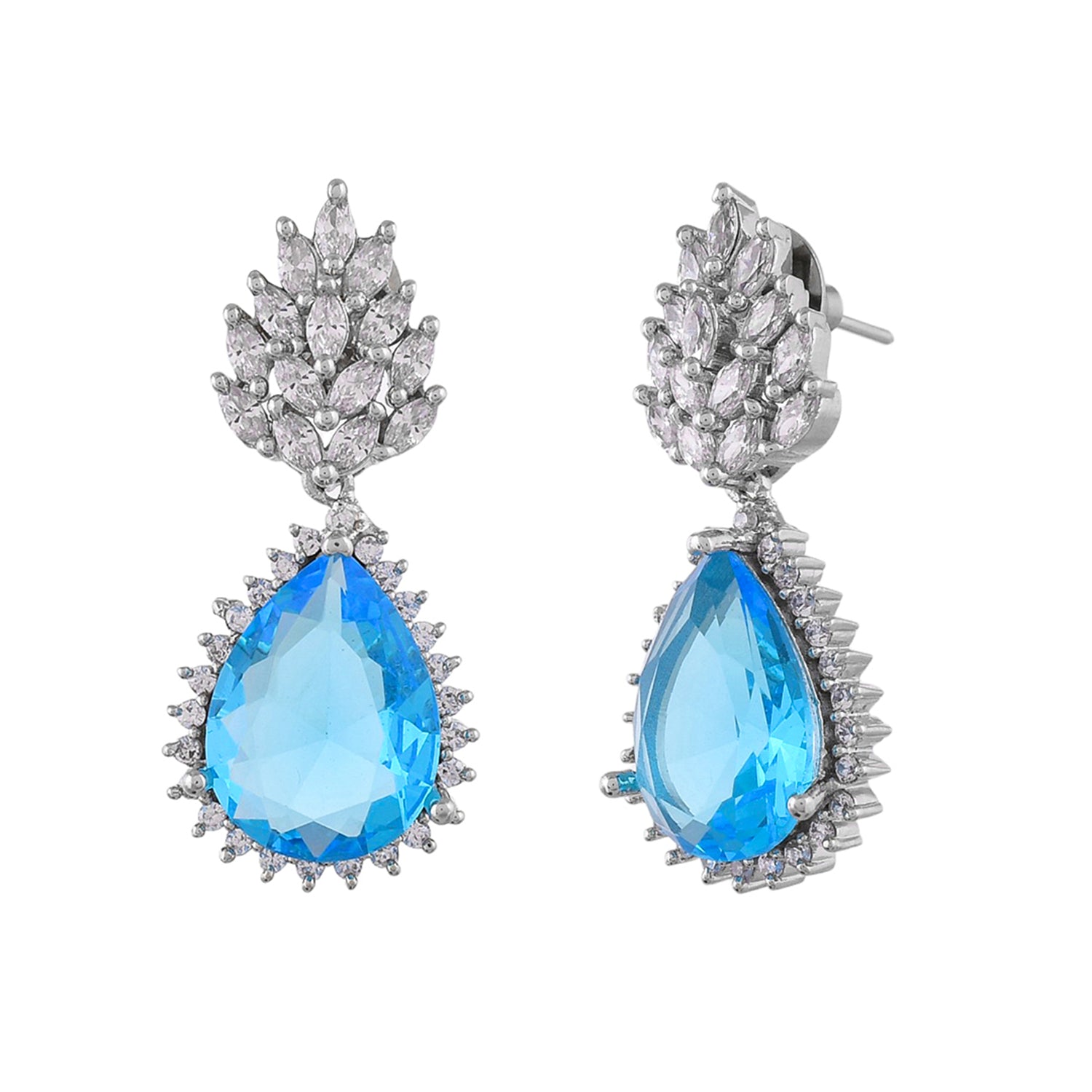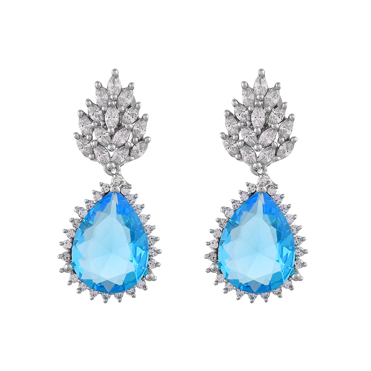 These enchanting pieces are masterfully crafted from robust brass and bathed in a radiant rhodium plating.At the core of each earring is a mesmerizing teardrop-shaped blue crystal, reminiscent of the deepest oceans, encircled by a constellation of clear crystals that provide a celestial sparkle. The pavé-set clear crystal stud anchors the design, serving as a bright star leading to the tranquil blue below.