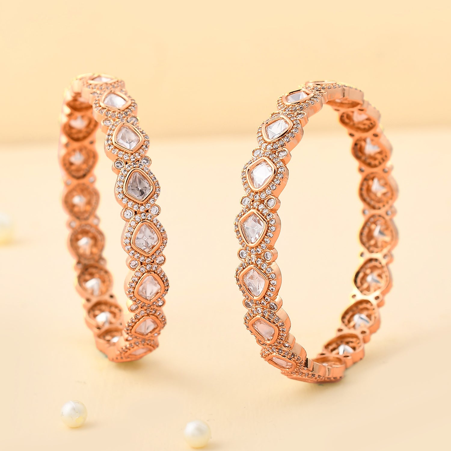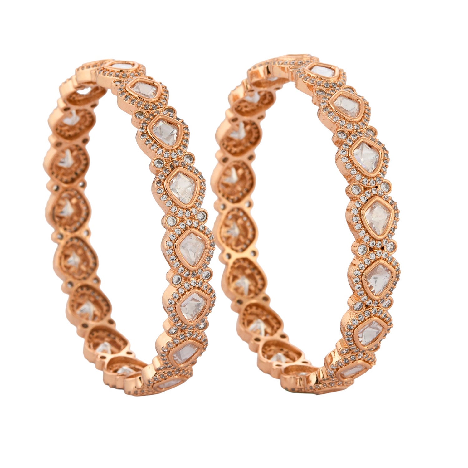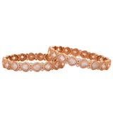 These bangles are adorned with sparkling American Diamonds, set in intricate oval designs that exude sophistication and charm. The addition of traditional Kundan-style stones enhances their allure, making them perfect party wear bangles for women. The harmonious blend of the cool brilliance of the diamonds with the warm rose gold hue of the brass creates a captivating contrast, ensuring these bangles stand out in any setting. Whether you’re looking for a thoughtful gift for your wife, a special gift for your sister, a meaningful gift for Rakhi, or simply a treat for yourself, these American Diamond Bangles are an ideal choice.