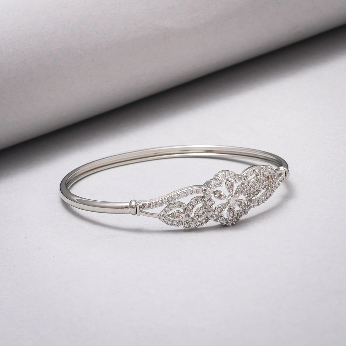 A sparkly rhodium plated bracelet with floral motifs, fashioned out of brass. Embellished with zircon gemstones in a classic cluster setting. A good match for formal looks.