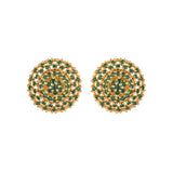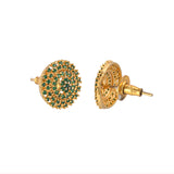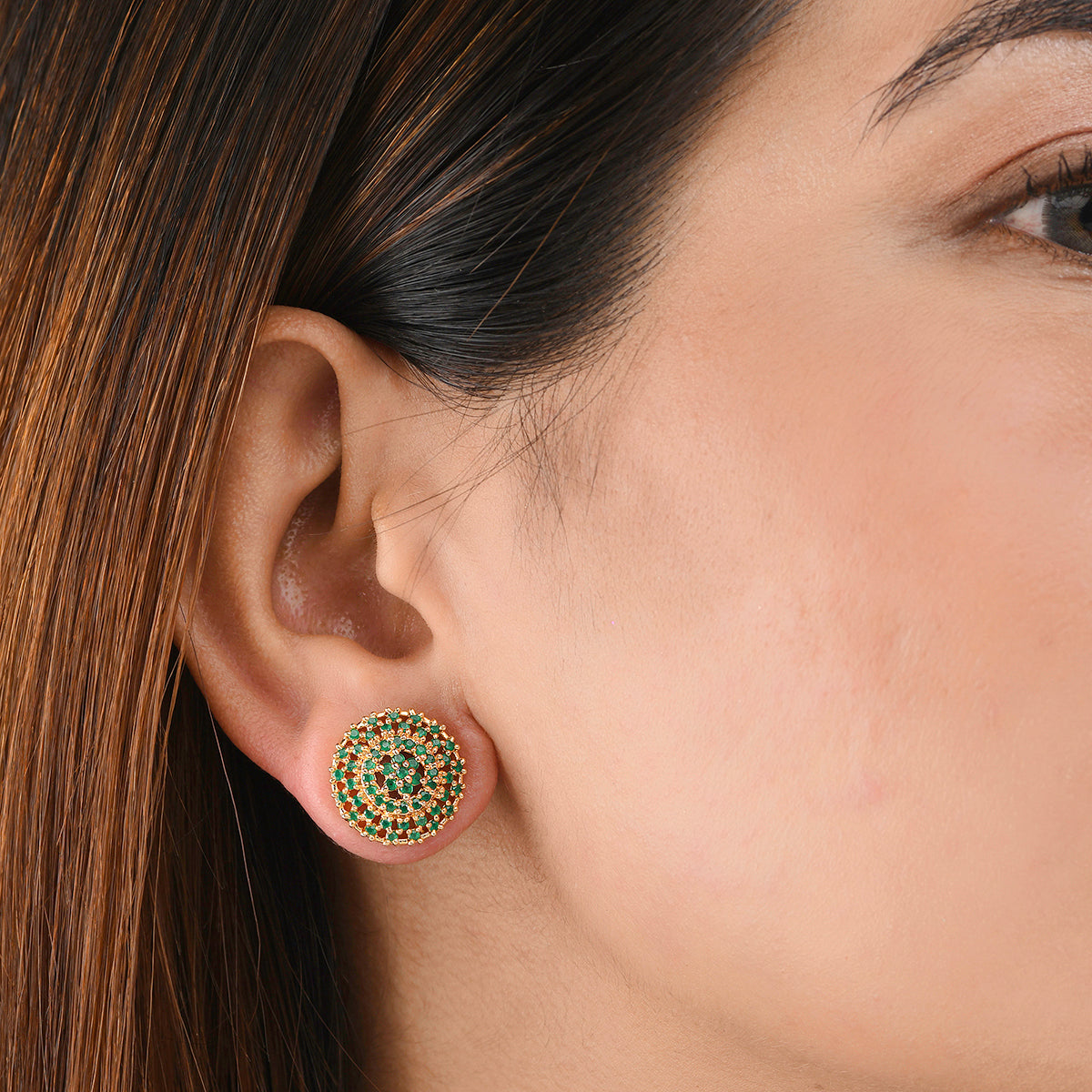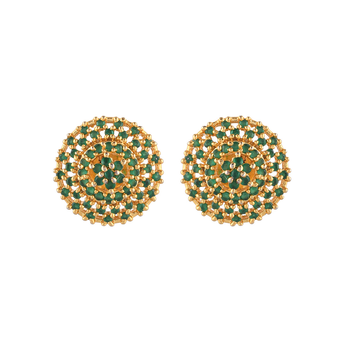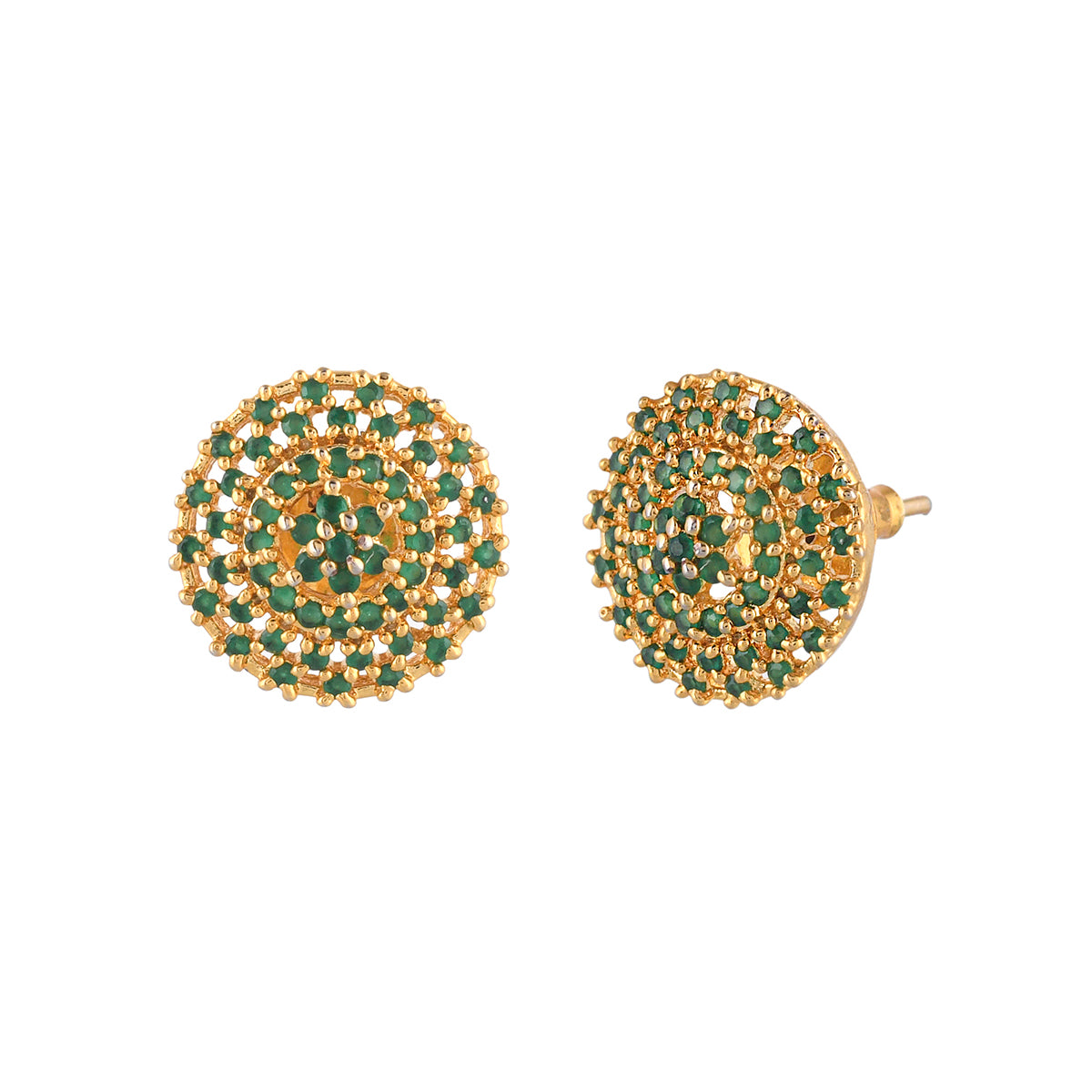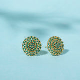 Large stud style brass earrings with a lovely yellow gold plating. Embellished with round cut green CZ gemstones in a classic cluster setting. A good match for almost all looks and outfits.