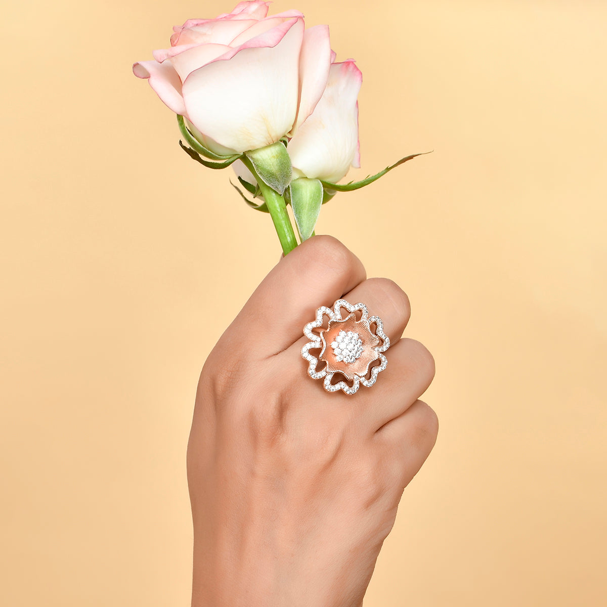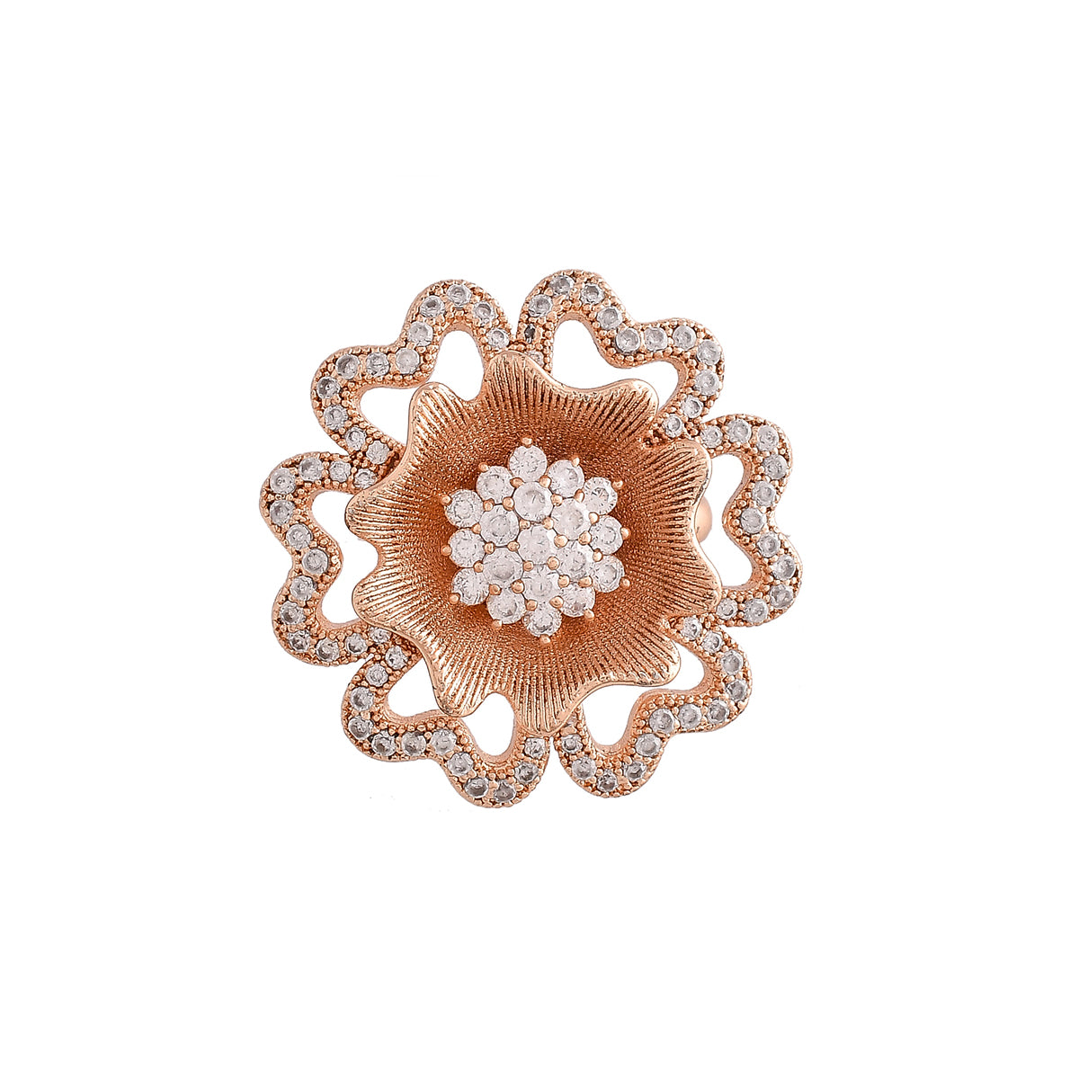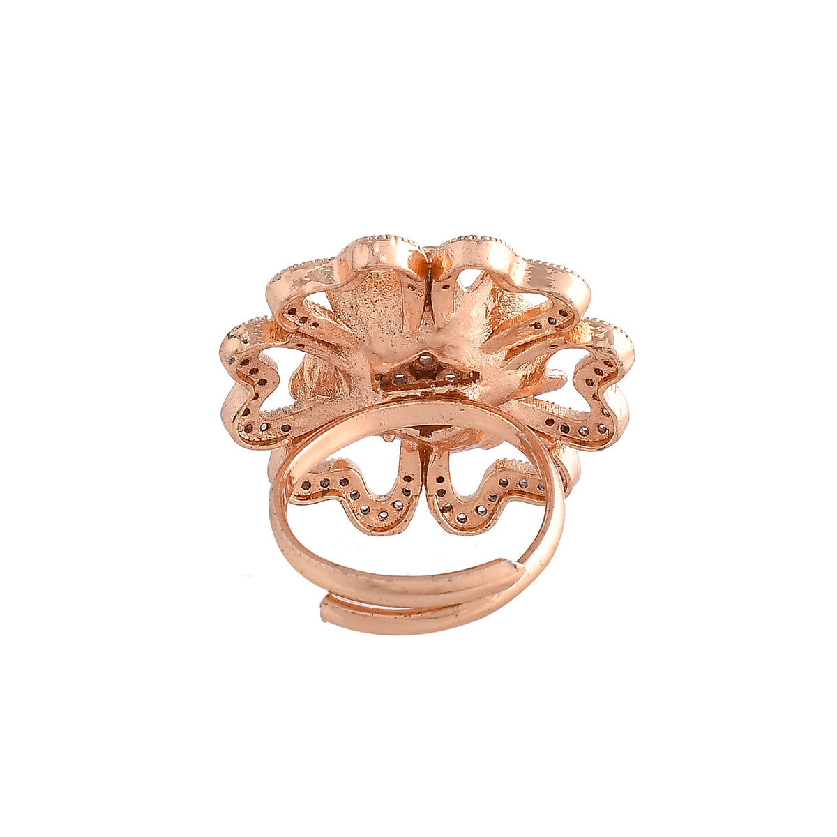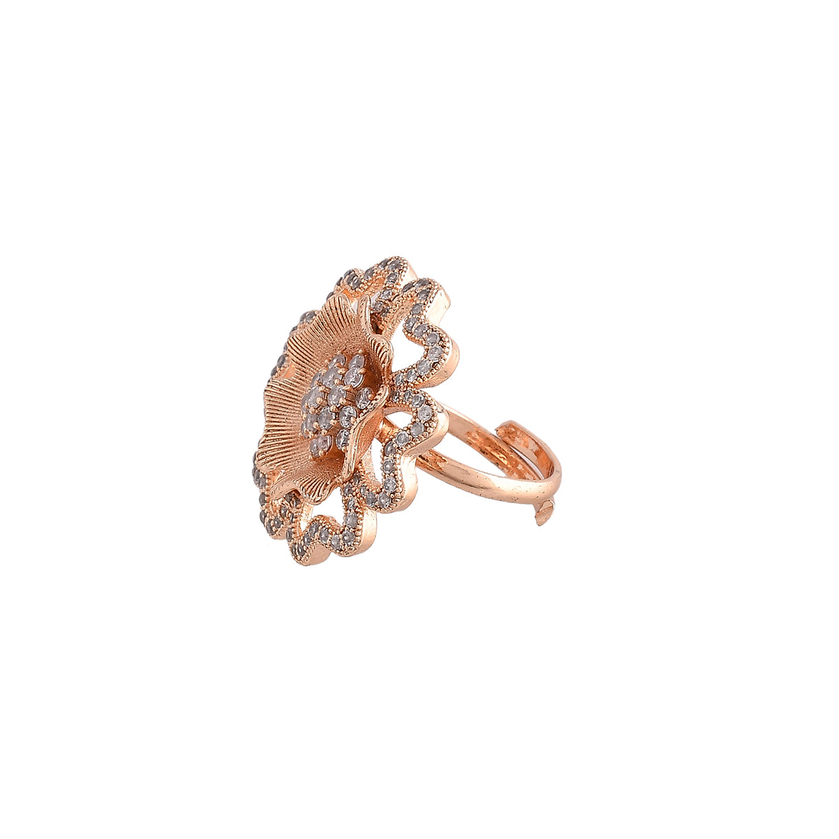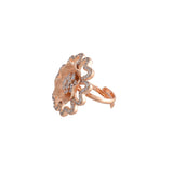 Floral motif edgy design ring, made from brass and embellished with cubic zirconia gemstones. Rose gold plating adds to the charm of this versatile and stylish ring.