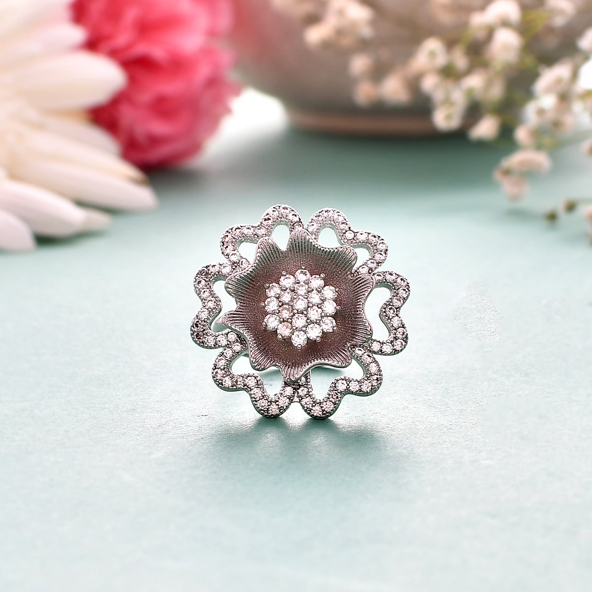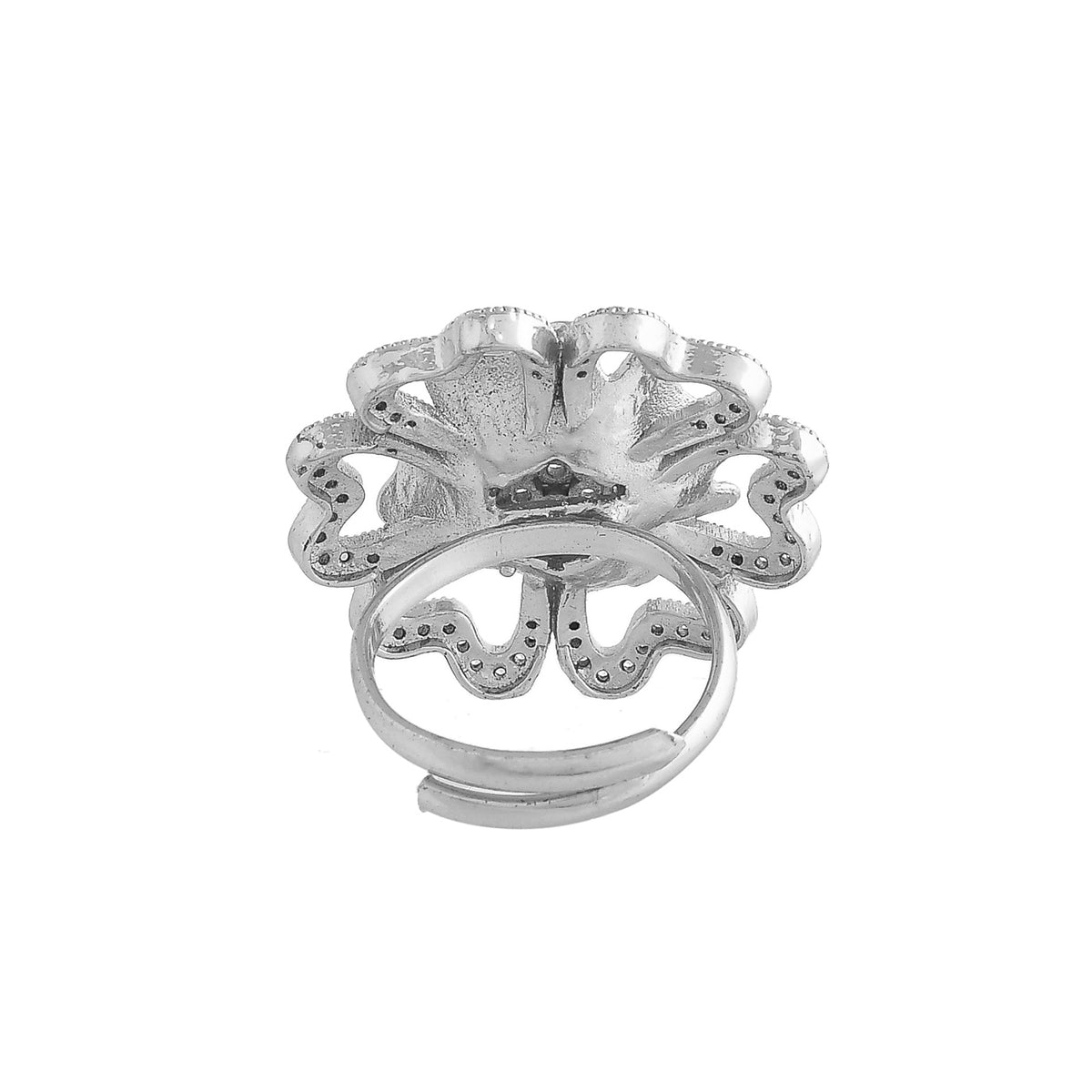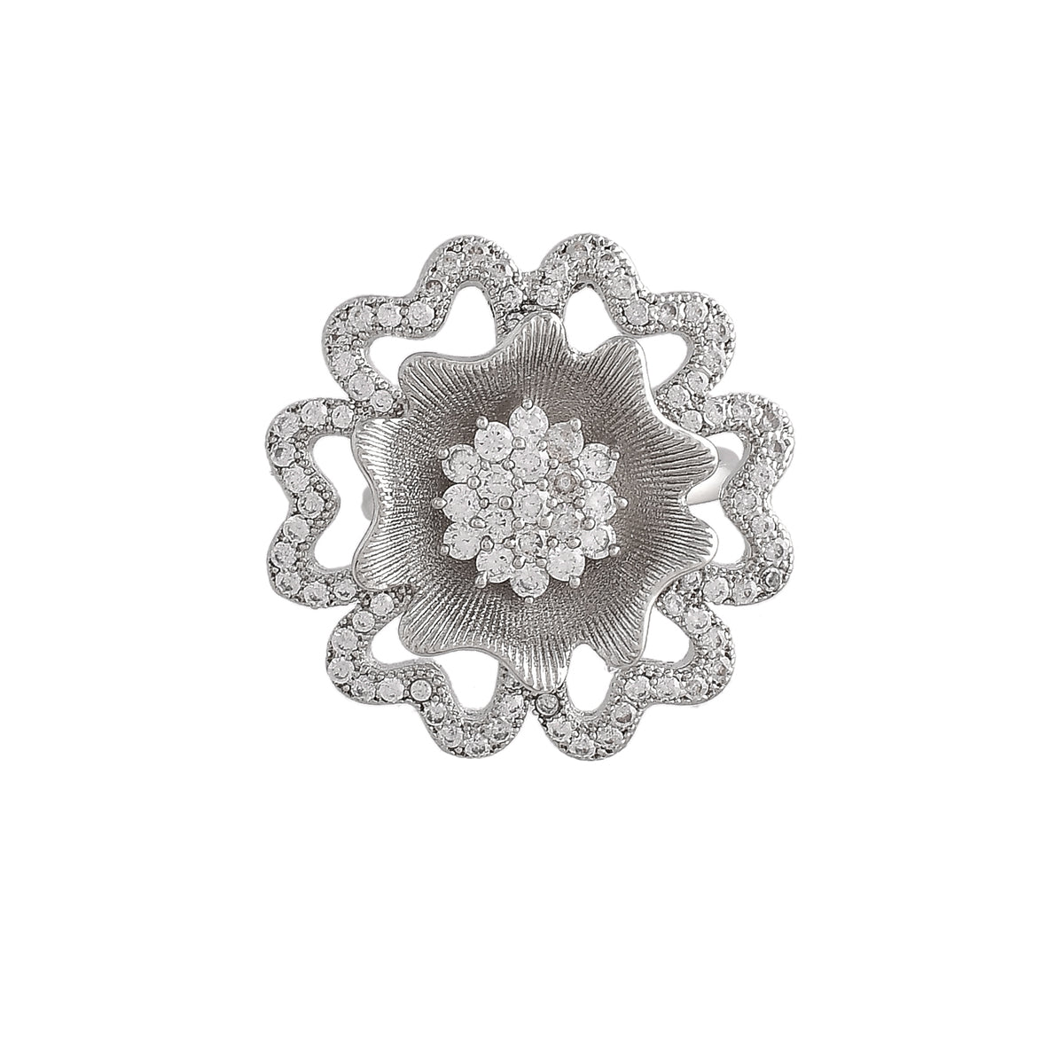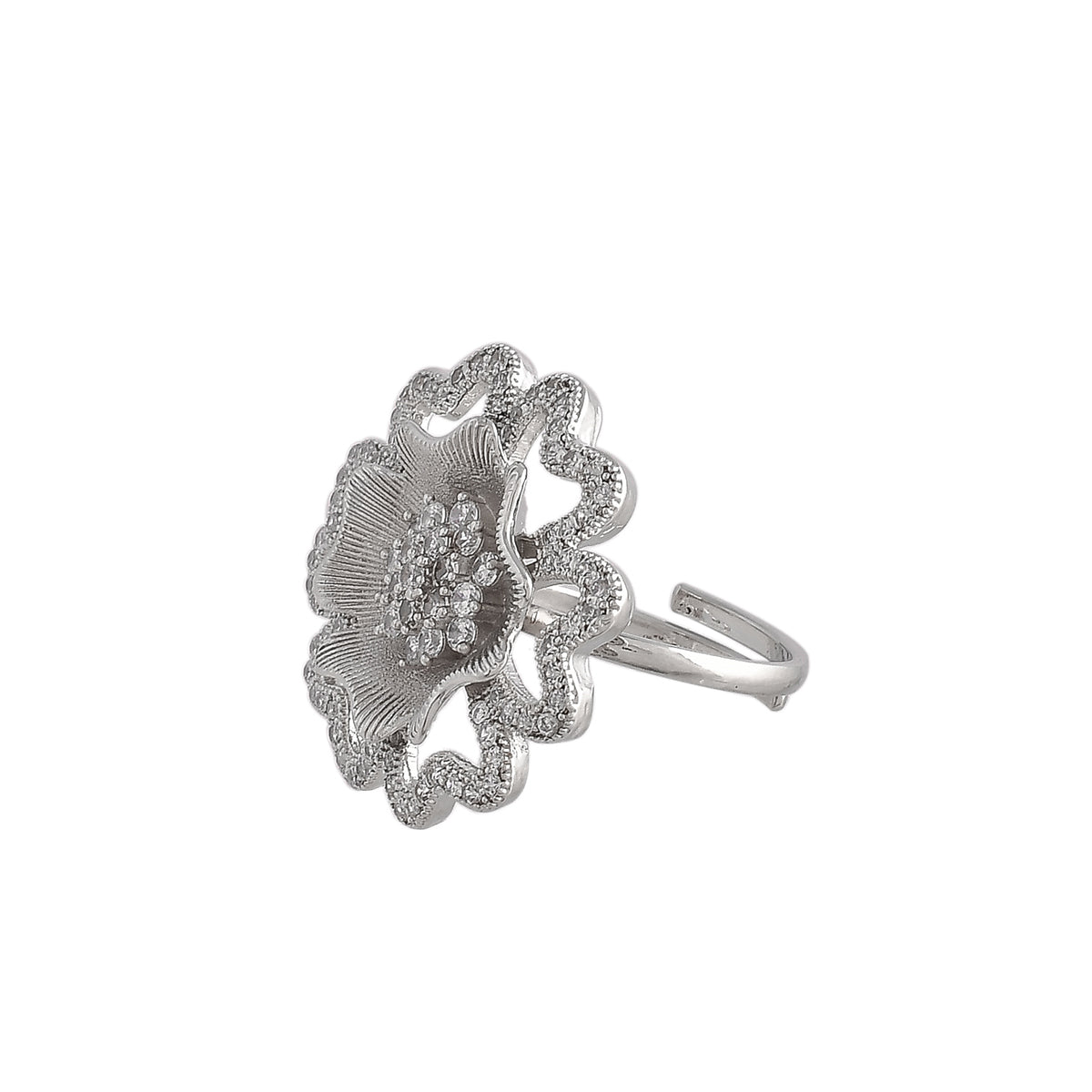 Floral motif edgy design ring, made from brass and embellished with cubic zirconia gemstones. Lovely silver plating adds to the charm of this versatile and stylish ring.
