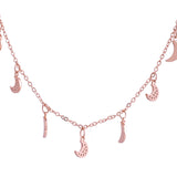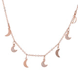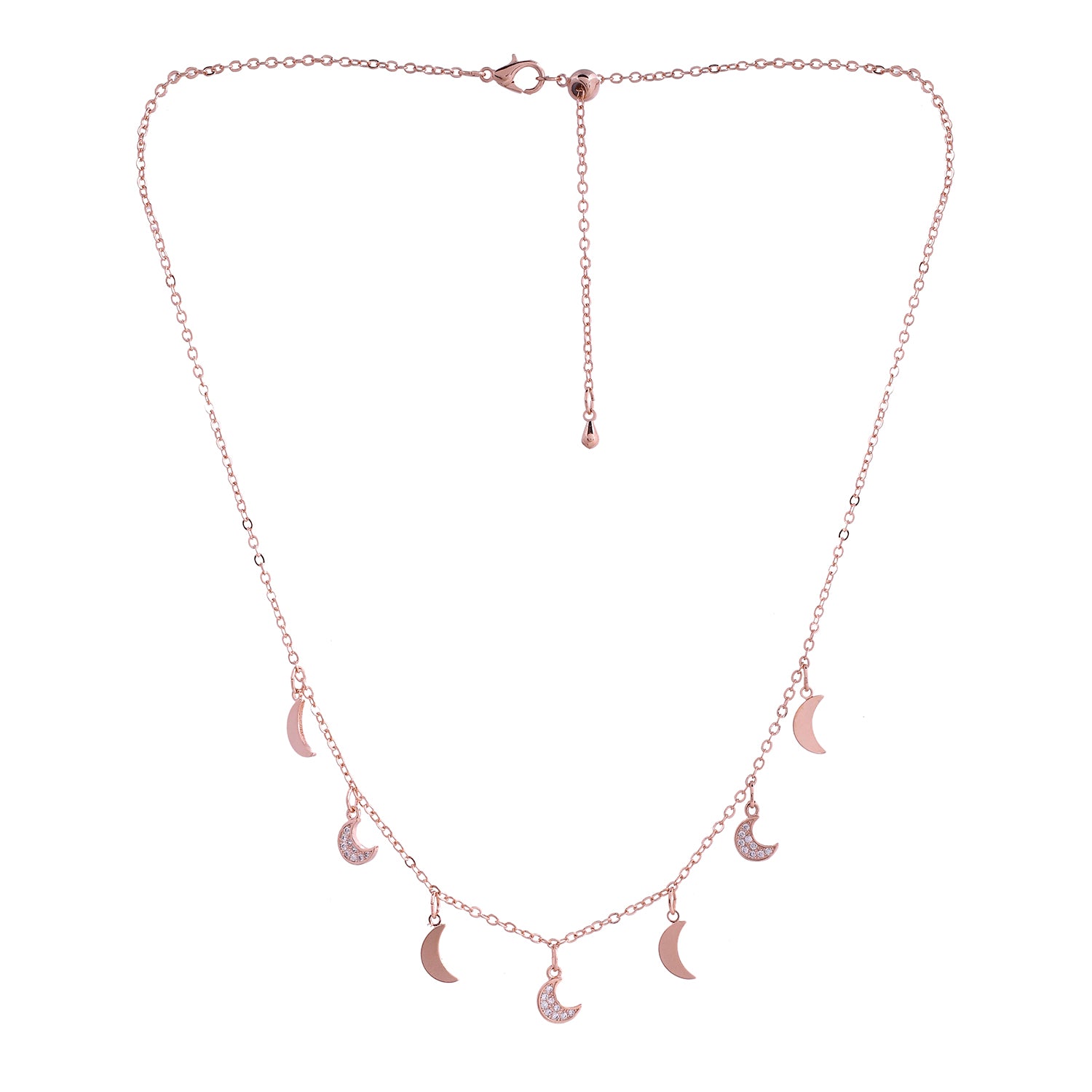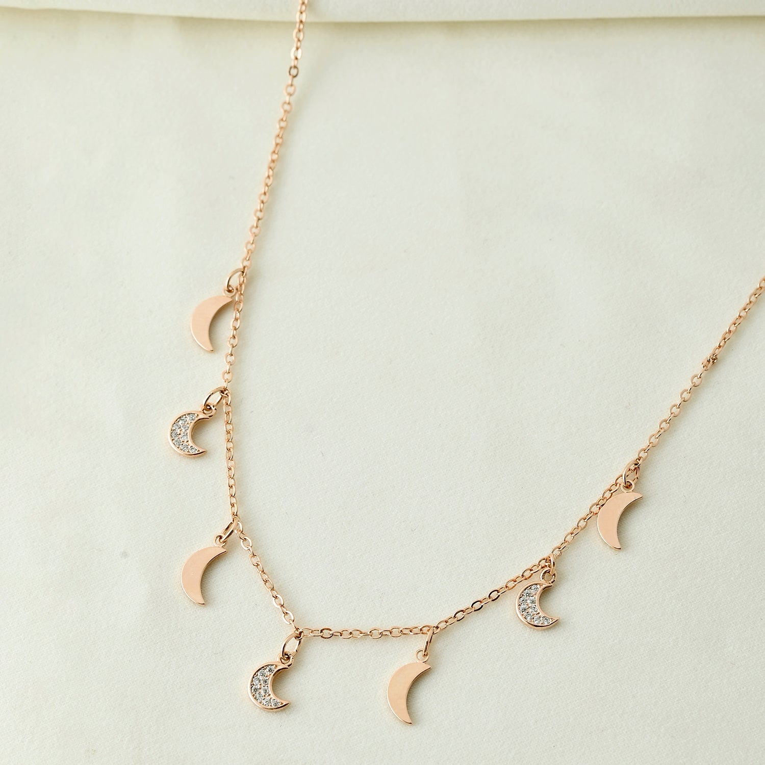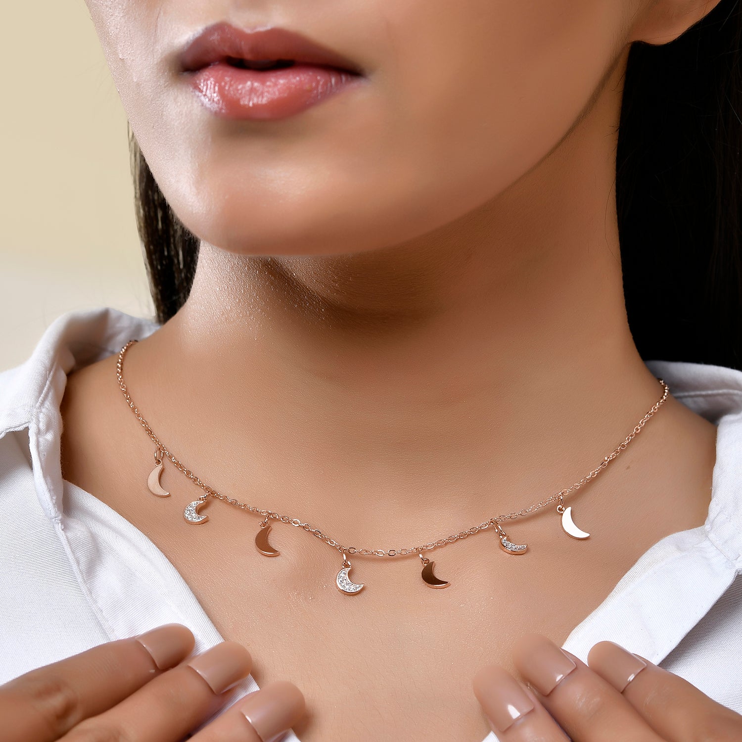 The Crescent Dream Charm Necklace from the Sparkling Elegance collection is a true embodiment of sophistication and style, crafted meticulously from high-quality stainless steel and plated with luxurious rose gold. This exquisite necklace features seven intricately designed crescent moon charms, three of which are adorned with sparkling American diamonds, adding a dash of glamour to any ensemble. The attention to detail and superior craftsmanship ensure a durable and radiant finish that remains timeless. Perfect for everyday wear as well as special occasions, this versatile piece effortlessly complements both casual and formal attire. Styled alone or layered with other necklaces, it adds a chic, statement-making touch to any look. The elegant design makes it an ideal gift for loved ones on occasions such as Valentine's Day, Christmas, Diwali, Rakshabandhan, or as a thoughtful treat for yourself. Whether it's a royal wedding, a festive celebration, or a casual day at work, the Crescent Dream Charm Necklace is a timeless piece that brings a touch of elegance and sparkle to any outfit.