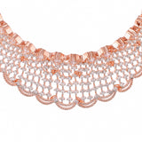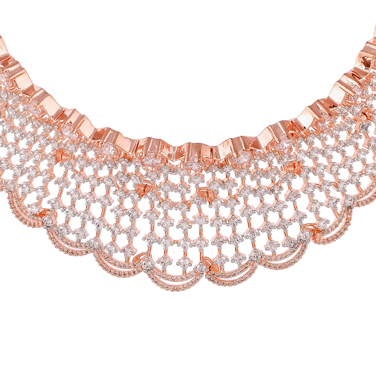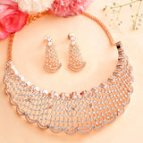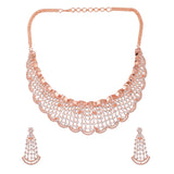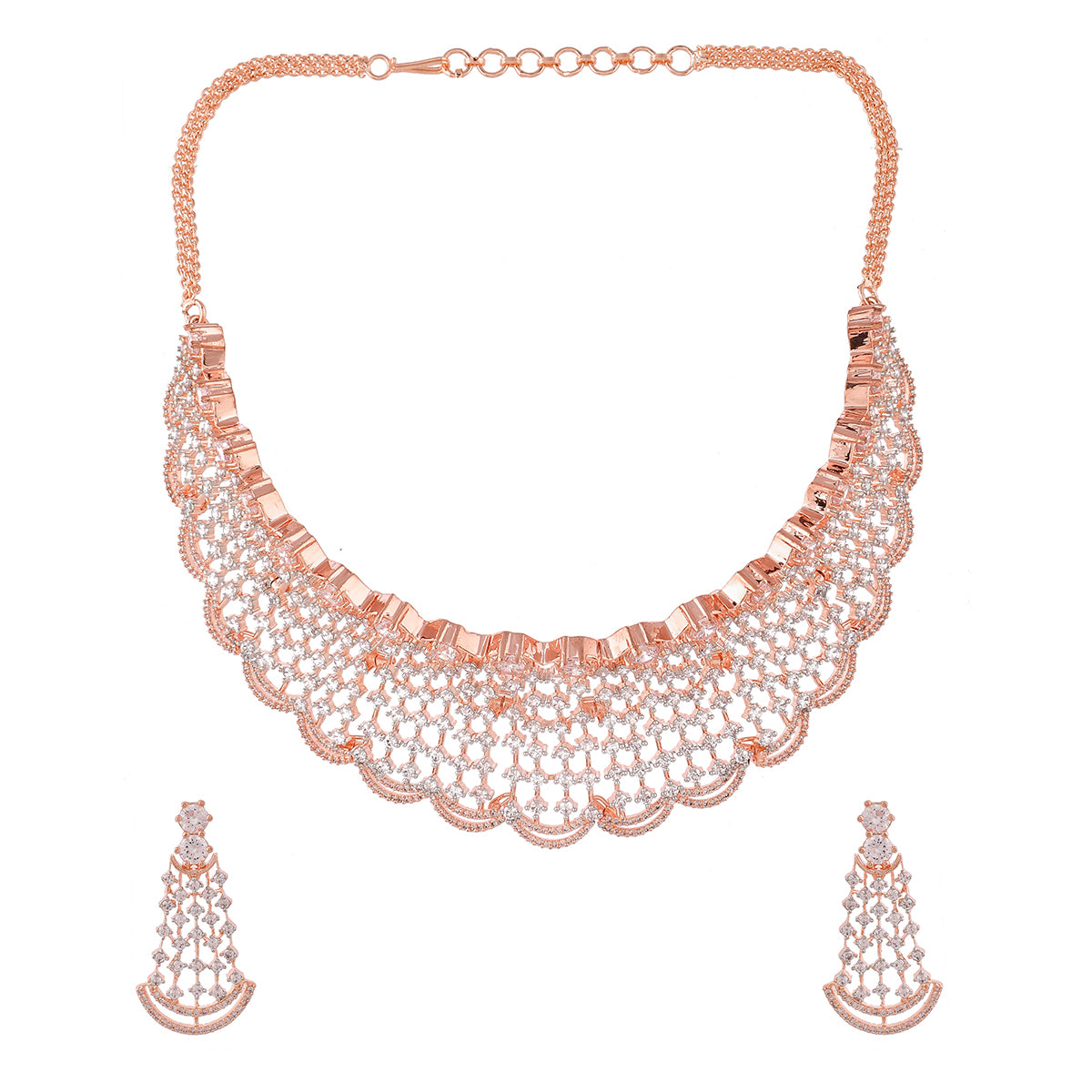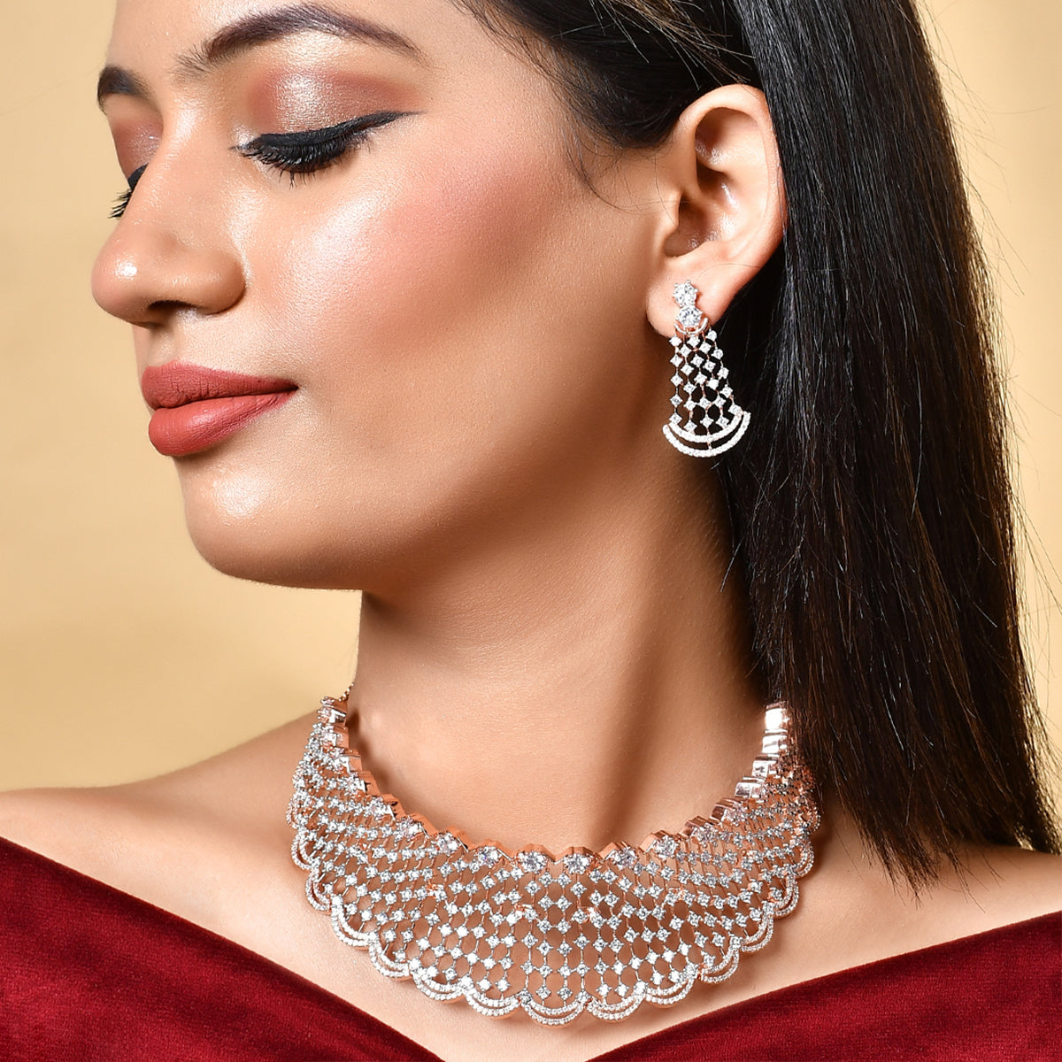 Two tone plated jewellery set, fashioned out of brass. The waterfall filigree choker necklace and matching earrings have been embellished with CZ gems. Good for formal looks.