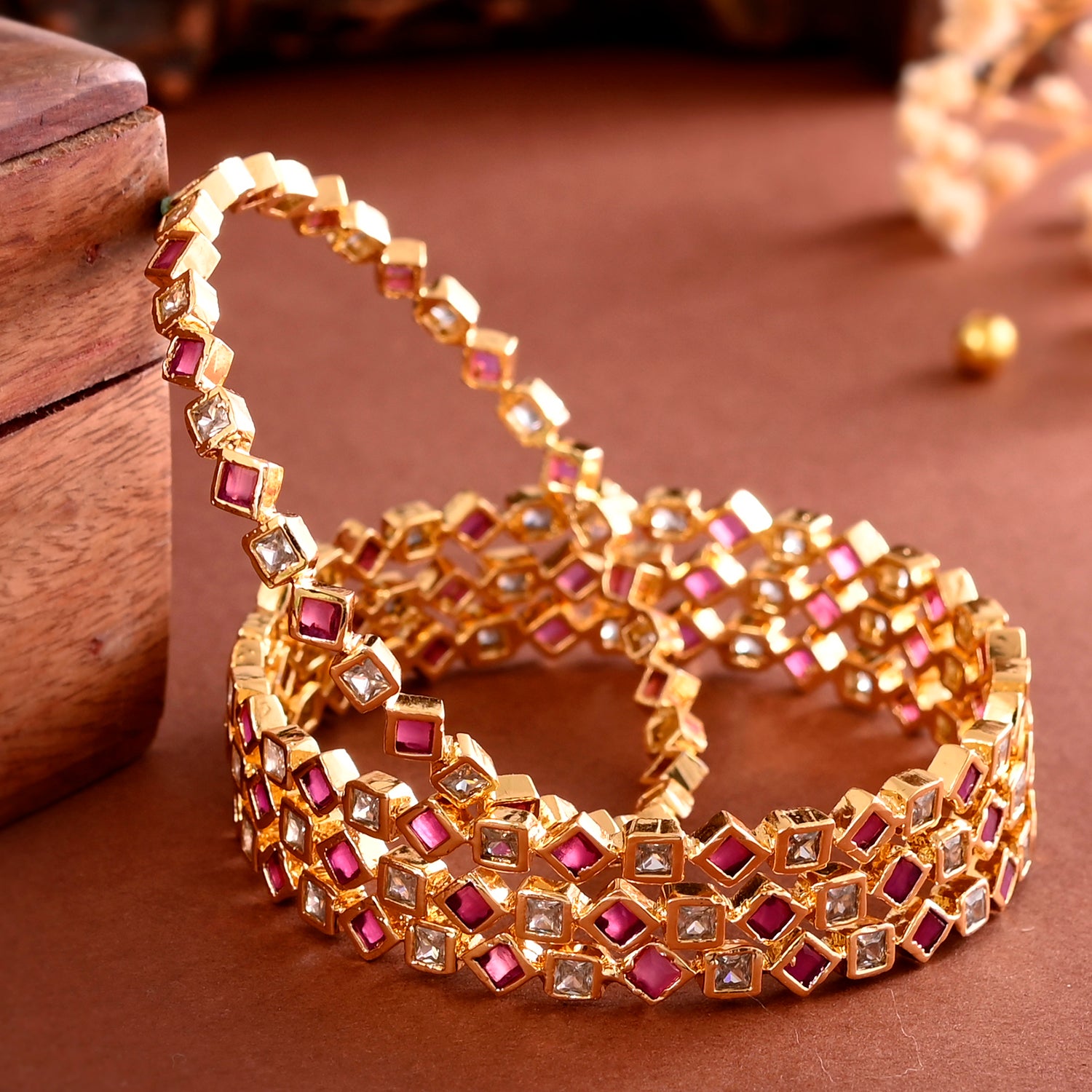 Diamond cut zirconia gemstones embellished bangle bracelets, made from brass and yellow gold plated. Pair with formal Indian attire.