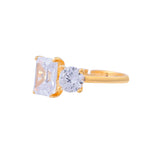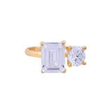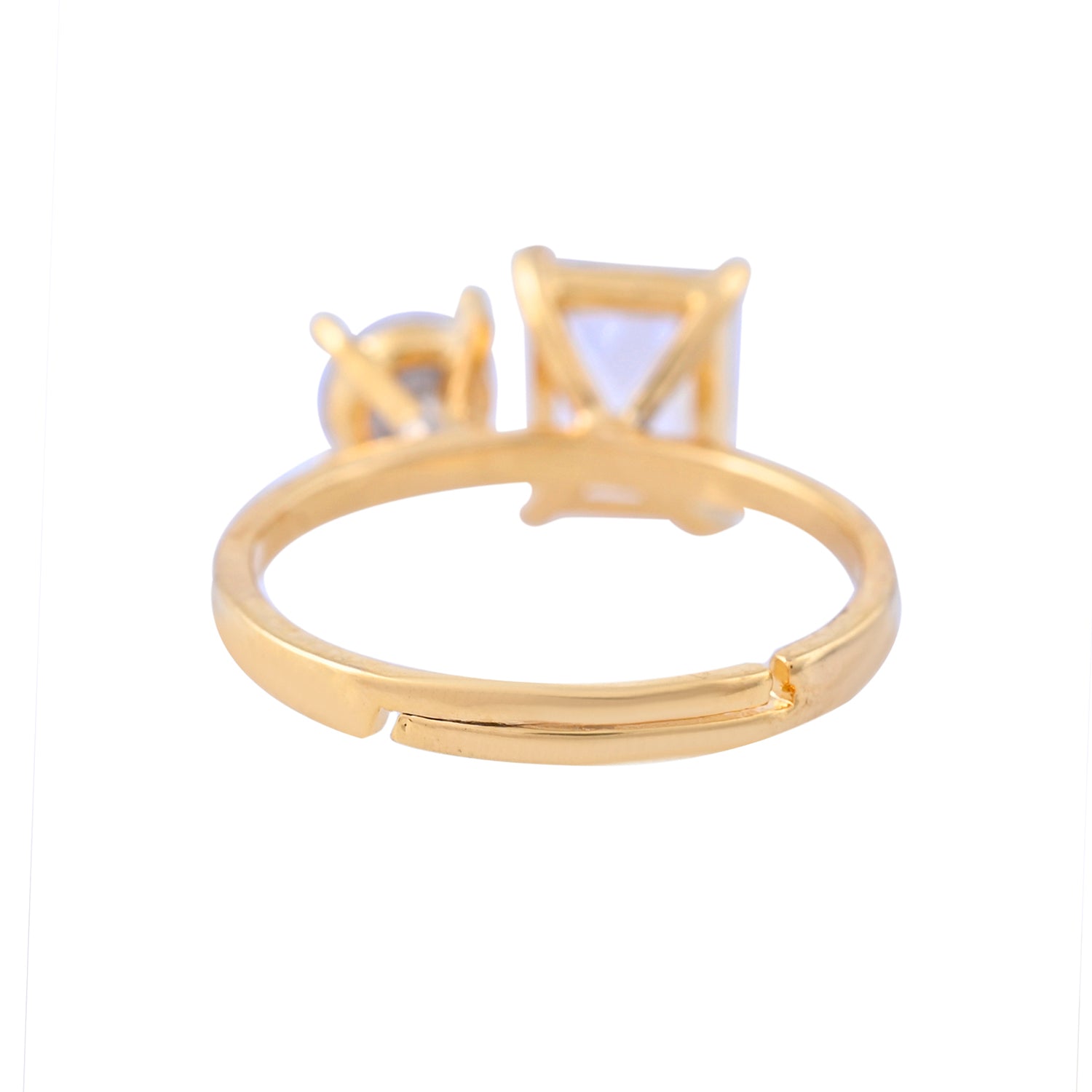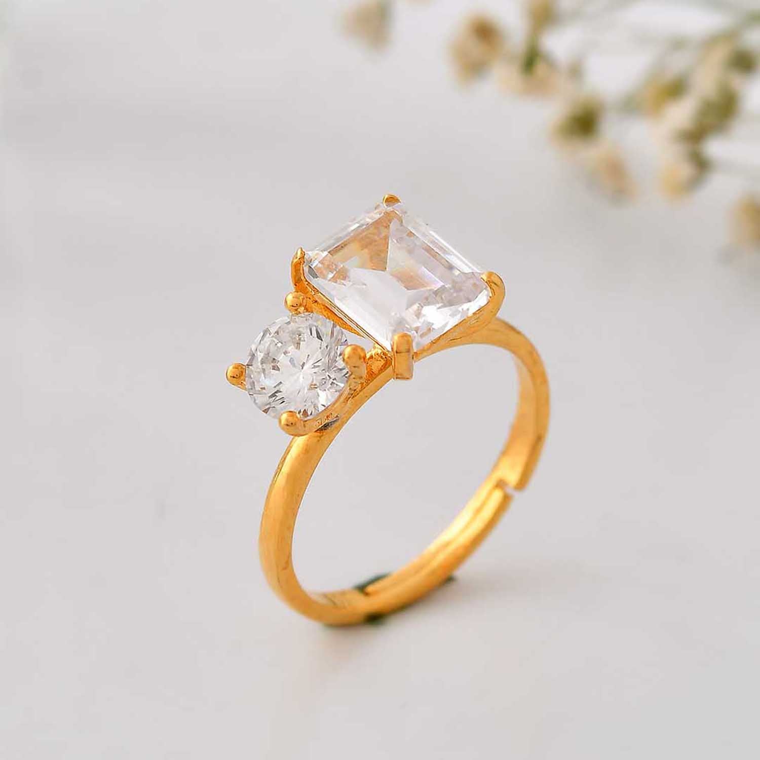 The Sparkling Elegance Dual-Stone Ring in luxurious yellow gold plating is a masterpiece of modern sophistication and timeless charm. Crafted from high-quality brass and finished with a radiant gold plating, this ring features a striking square-cut gemstone complemented by a delicate round-cut stone, creating a harmonious blend of boldness and elegance. The sleek, polished band enhances the brilliance of the stones, making this ring a statement piece perfect for every occasion—be it a formal office look, a chic party ensemble, or a vacation-ready outfit. Designed for effortless styling, pair it with statement earrings, stud earrings, or Western-inspired jewelry to achieve a sophisticated flair. A stunning gift idea for Diwali, Raksha Bandhan, Christmas, Eid, Valentine’s Day, and more, it’s the perfect present for a girlfriend, wife, mother, sister, or loved one, embodying love and admiration in every shimmering facet.