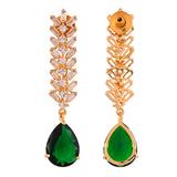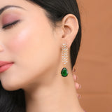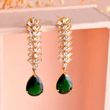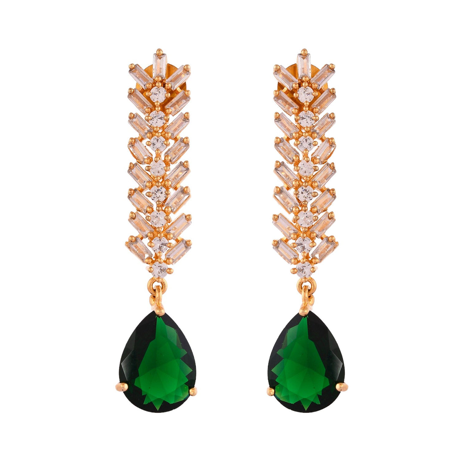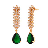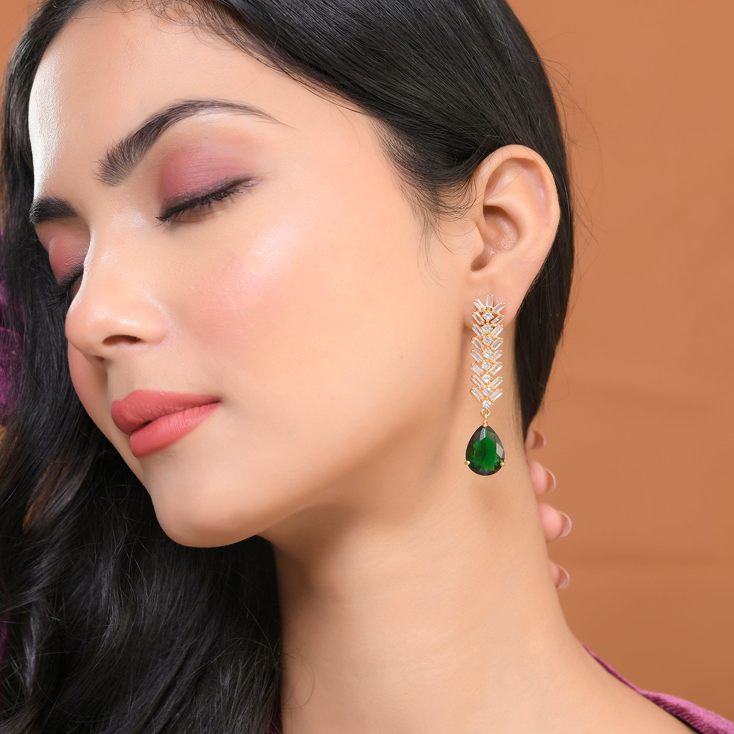 Crafted from high-quality brass and adorned with a lustrous gold plating, these earrings feature sparkling American Diamonds that cascade down in a sophisticated arrangement. The design culminates in a striking green teardrop American Diamond Stone, adding a pop of color and an air of regality to any ensemble. Whether you’re searching for the ideal ‘Gift for wife,’ ‘Gift for sister,’ or ‘Gift for Rakhi,’ these earrings are sure to enchant. As versatile as they are beautiful, they make an impeccable choice for ‘party wear earrings for women’ or simply as an everyday luxury.