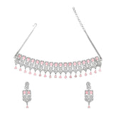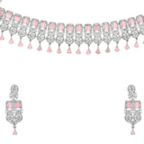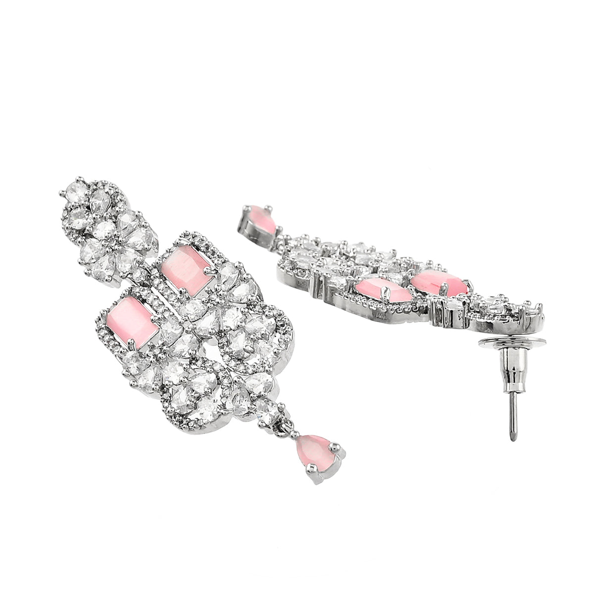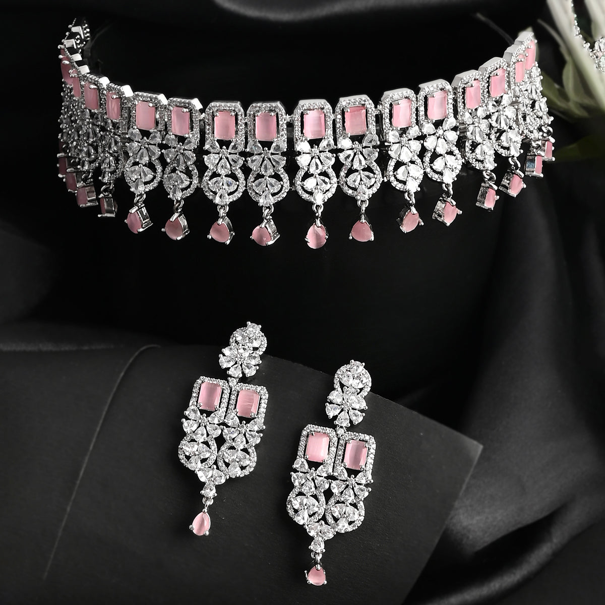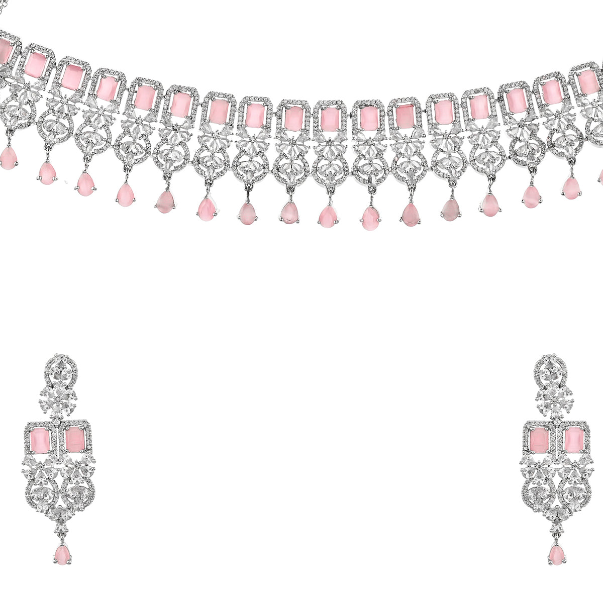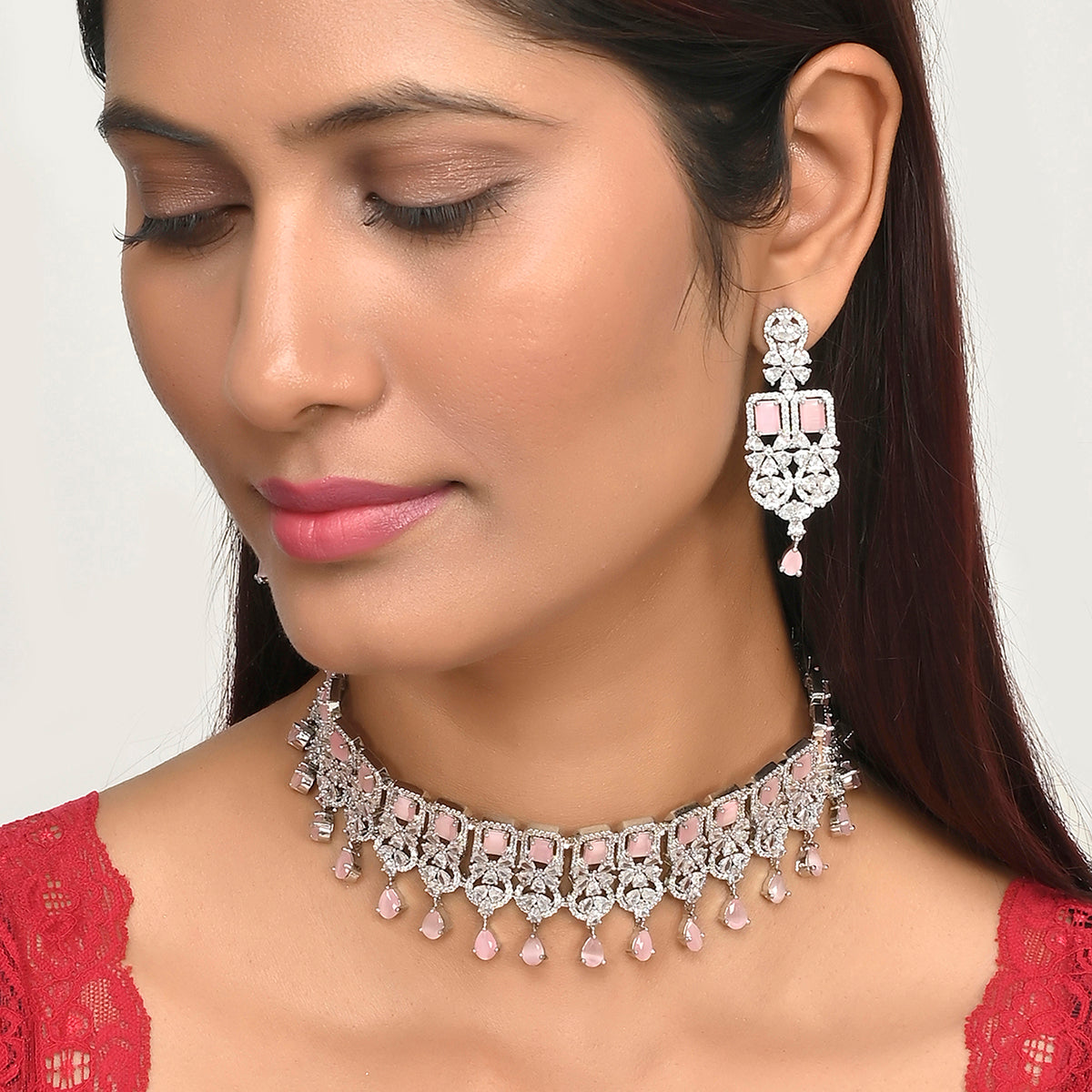 Cubic zirconia gemstones in a classic emerald cut adorn this brass jewellery set, which has been fashioned after Victorian jewellery pieces. The silver plating adds to the charm of this versatile and lightweight set.