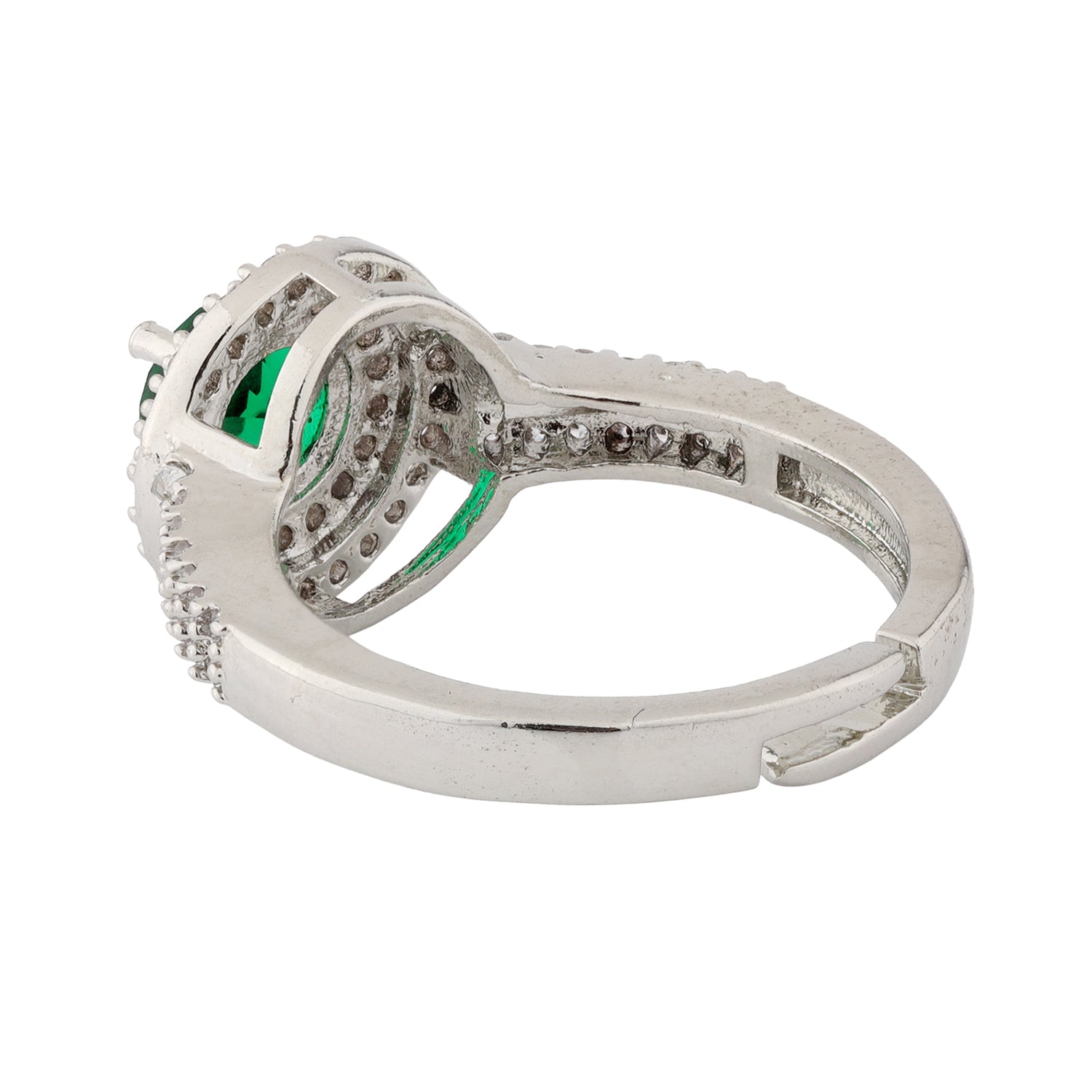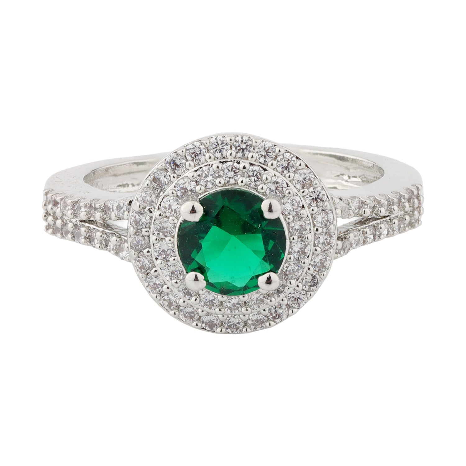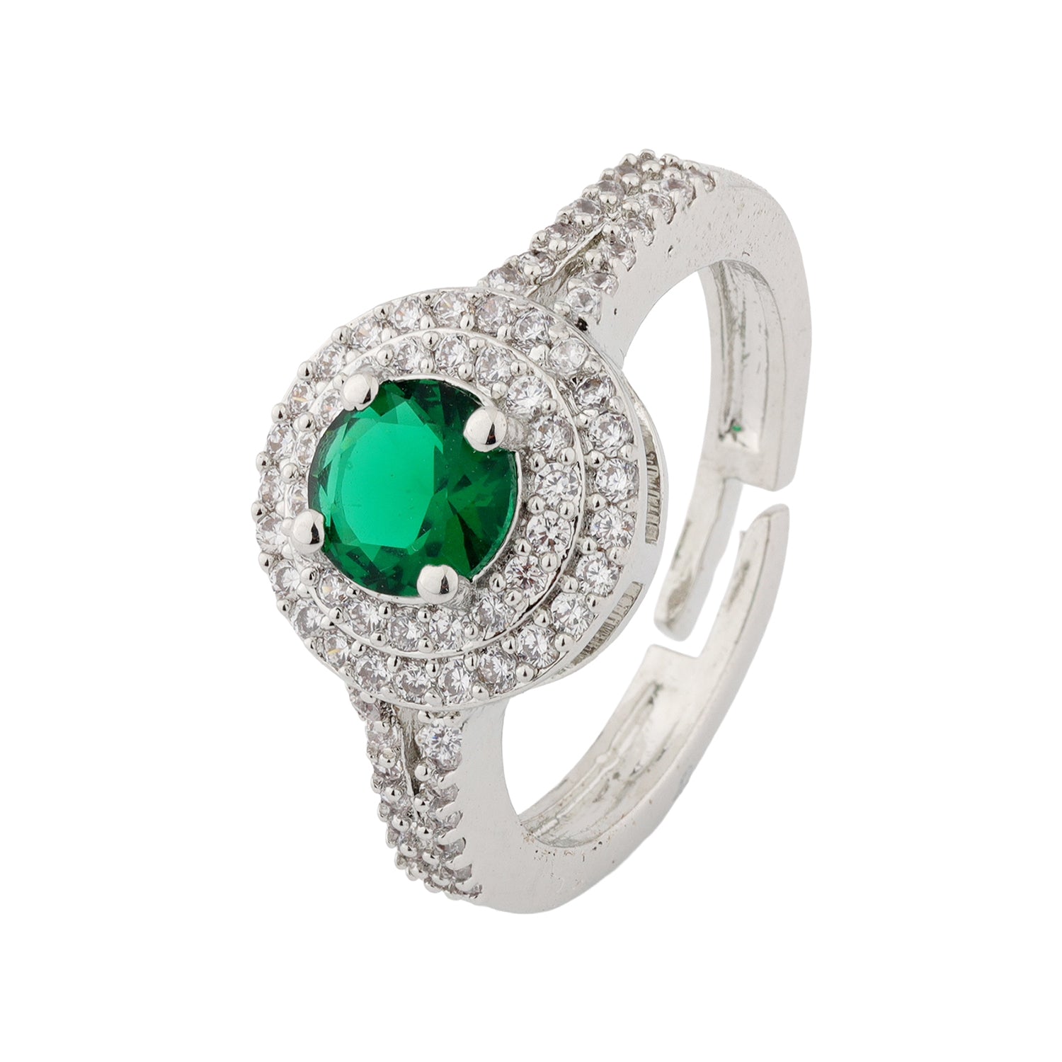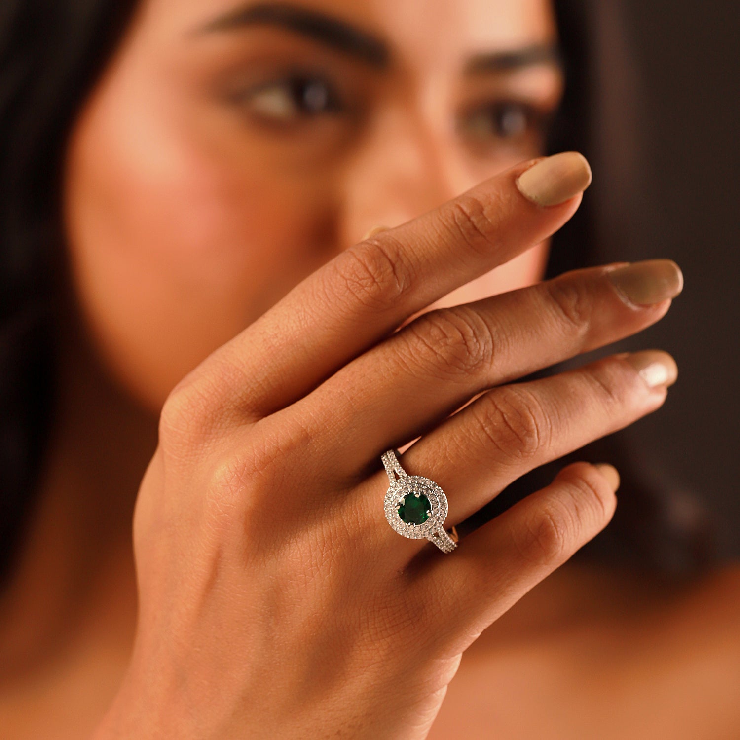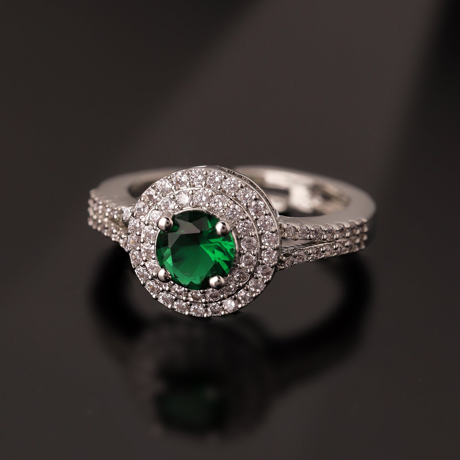 Elevate your elegance with the Sparkling Elegance Collection, featuring the stunning Emerald Halo Statement Ring for women, a perfect fusion of sophistication, glamour, and timeless beauty. Expertly crafted from premium brass and finished with a radiant white rhodium plating, this exquisite ring captures the essence of modern luxury. At its center shines a vivid emerald-green round CZ stone, surrounded by a dazzling double halo of American diamonds, symbolizing eternal charm and brilliance. Designed for the woman who appreciates both tradition and modern flair, this designer Ring adds effortless sophistication to any ensemble. Whether worn as a Ring for wedding, a festive Ring, or a cocktail showstopper, it complements every special moment with unmatched sparkle. A cherished gift for wife, gift for girlfriend, or gift for women, it’s the ultimate expression of elegance and grace.
