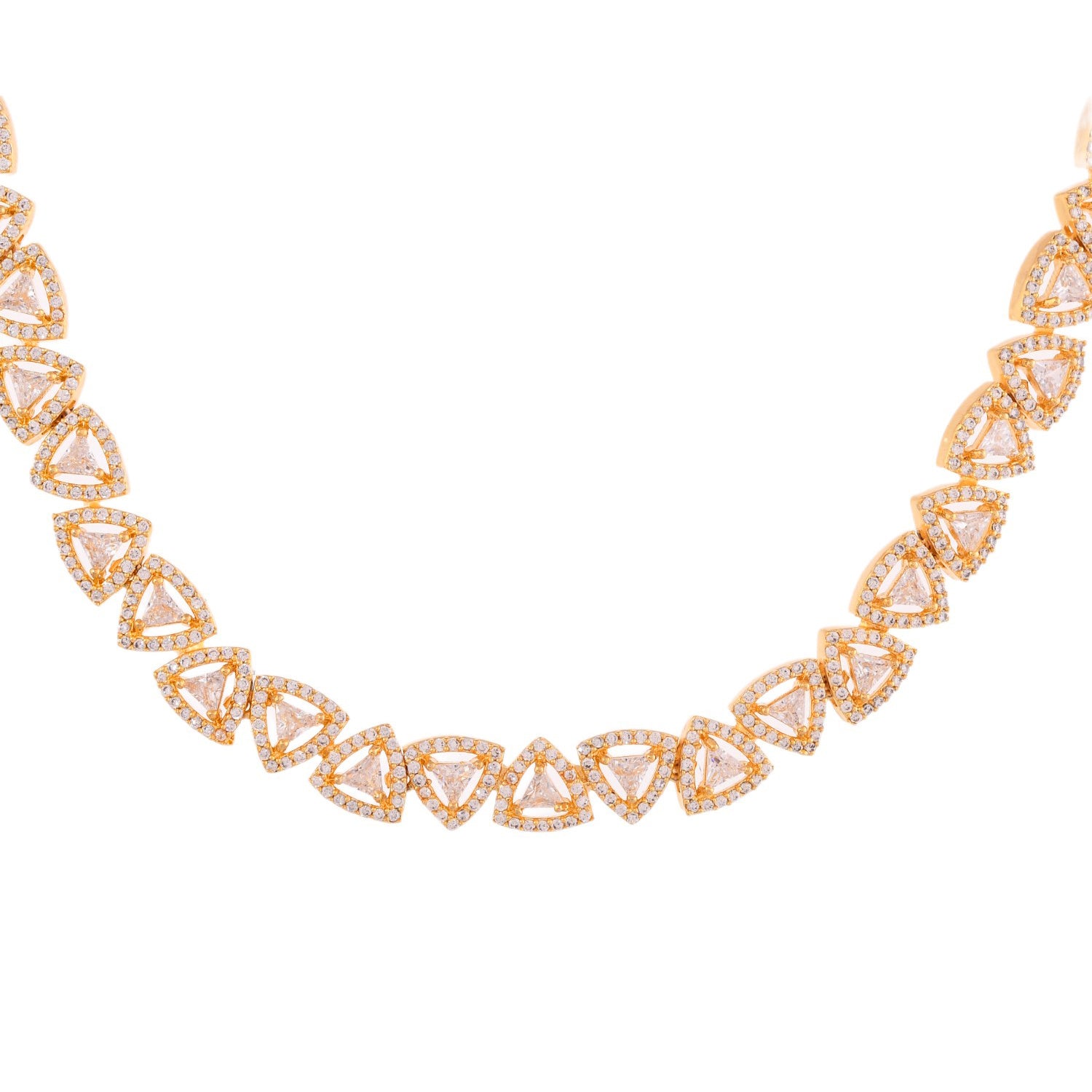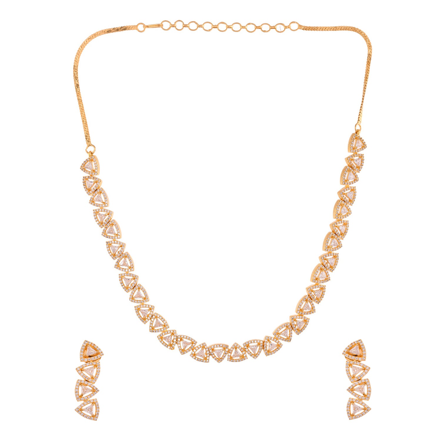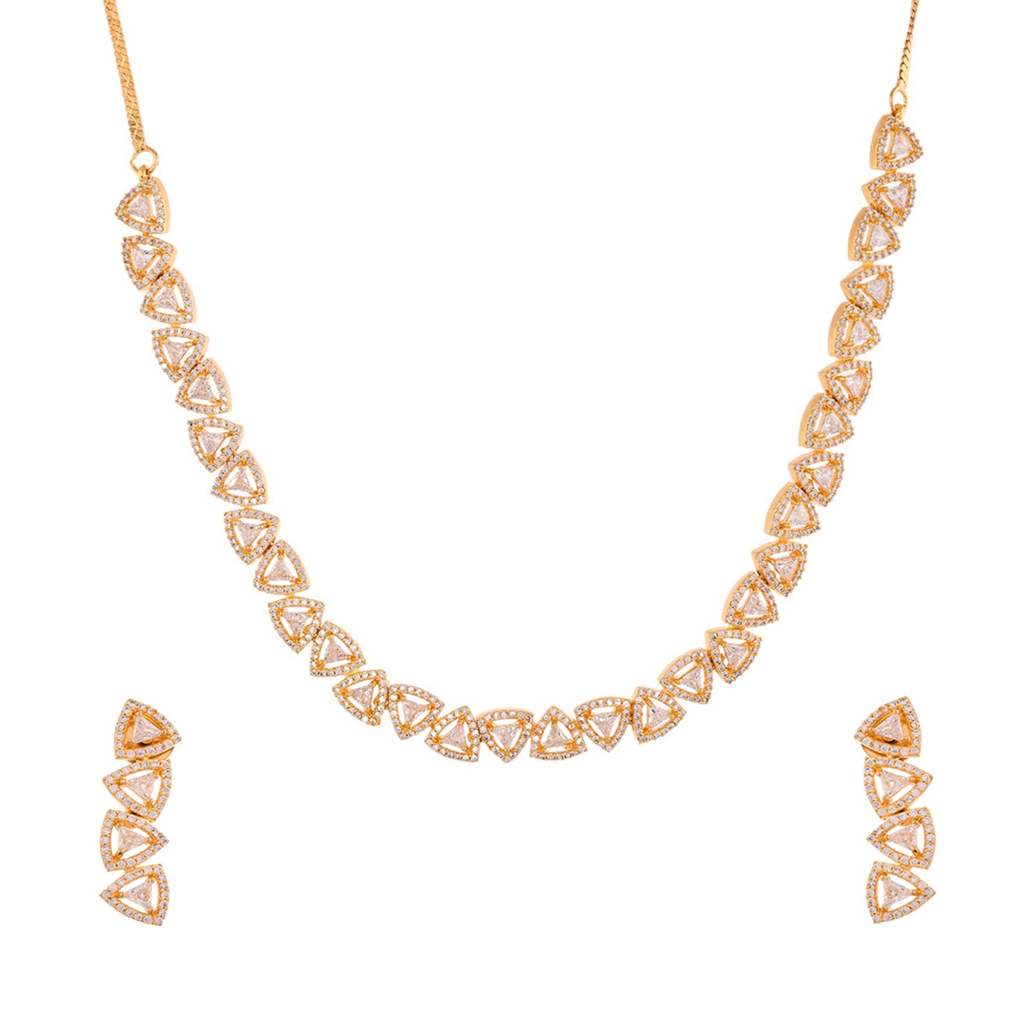 The Necklace set is elegantly plated in lustrous gold, enhancing its traditional yet timeless appeal. Each link of the necklace is adorned with sparkling American Diamonds, intricately set to catch the light from every angle. The design showcases a series of diamond-shaped motifs, connected seamlessly to create a statement jewellery set for women that exudes sophistication.As a thoughtful gift for wife, gift for sister, or self-purchase during Rakhi or other celebratory events, this Voylla necklace set for women embodies elegance and charm.