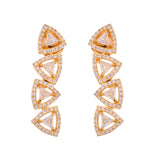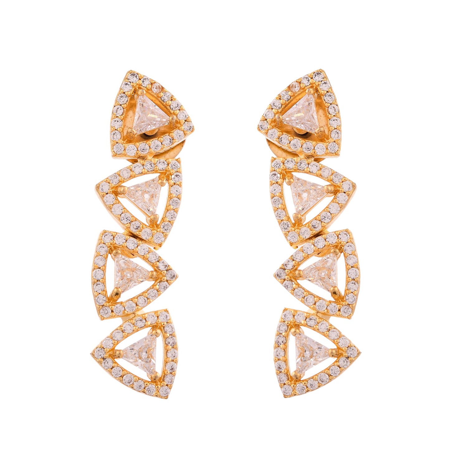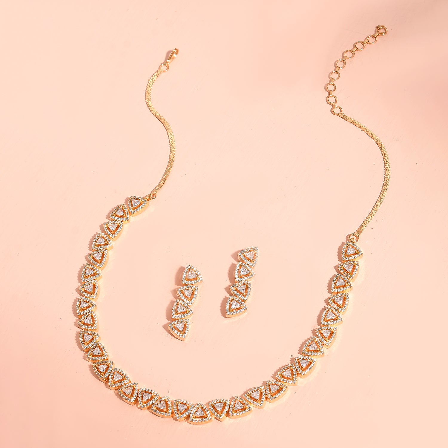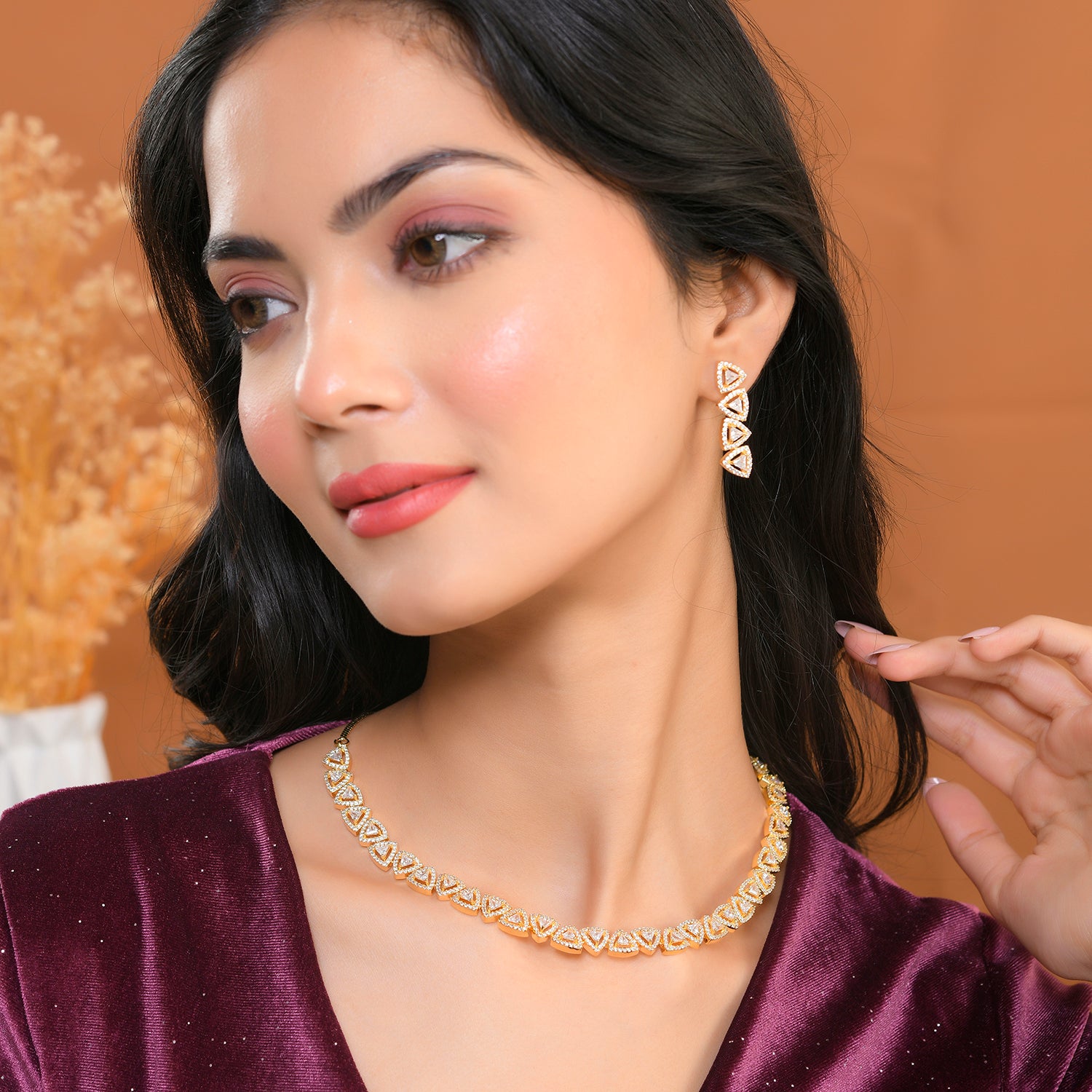The Necklace set is elegantly plated in lustrous gold, enhancing its traditional yet timeless appeal. Each link of the necklace is adorned with sparkling American Diamonds, intricately set to catch the light from every angle. The design showcases a series of diamond-shaped motifs, connected seamlessly to create a statement jewellery set for women that exudes sophistication.As a thoughtful gift for wife, gift for sister, or self-purchase during Rakhi or other celebratory events, this Voylla necklace set for women embodies elegance and charm.