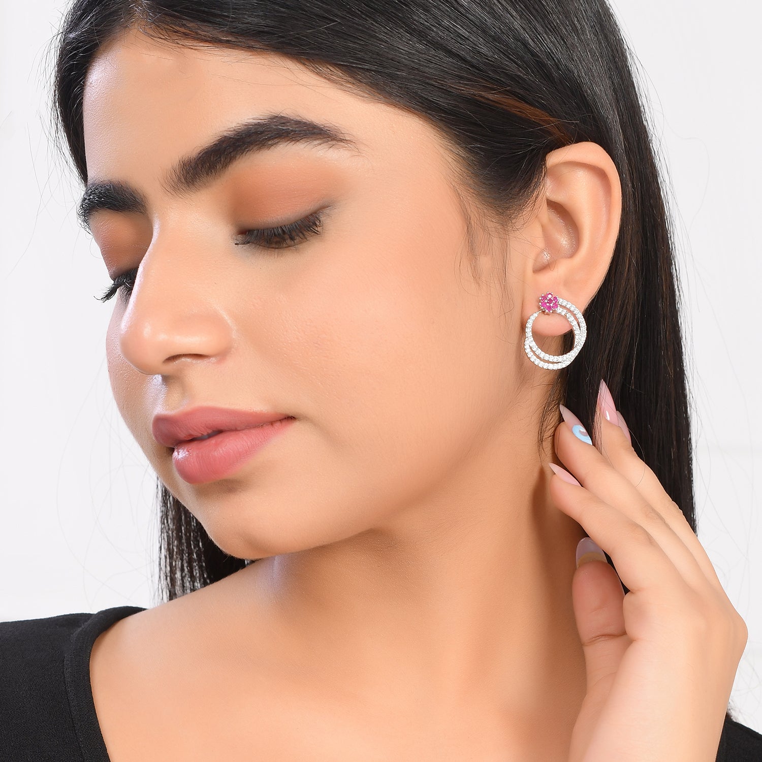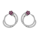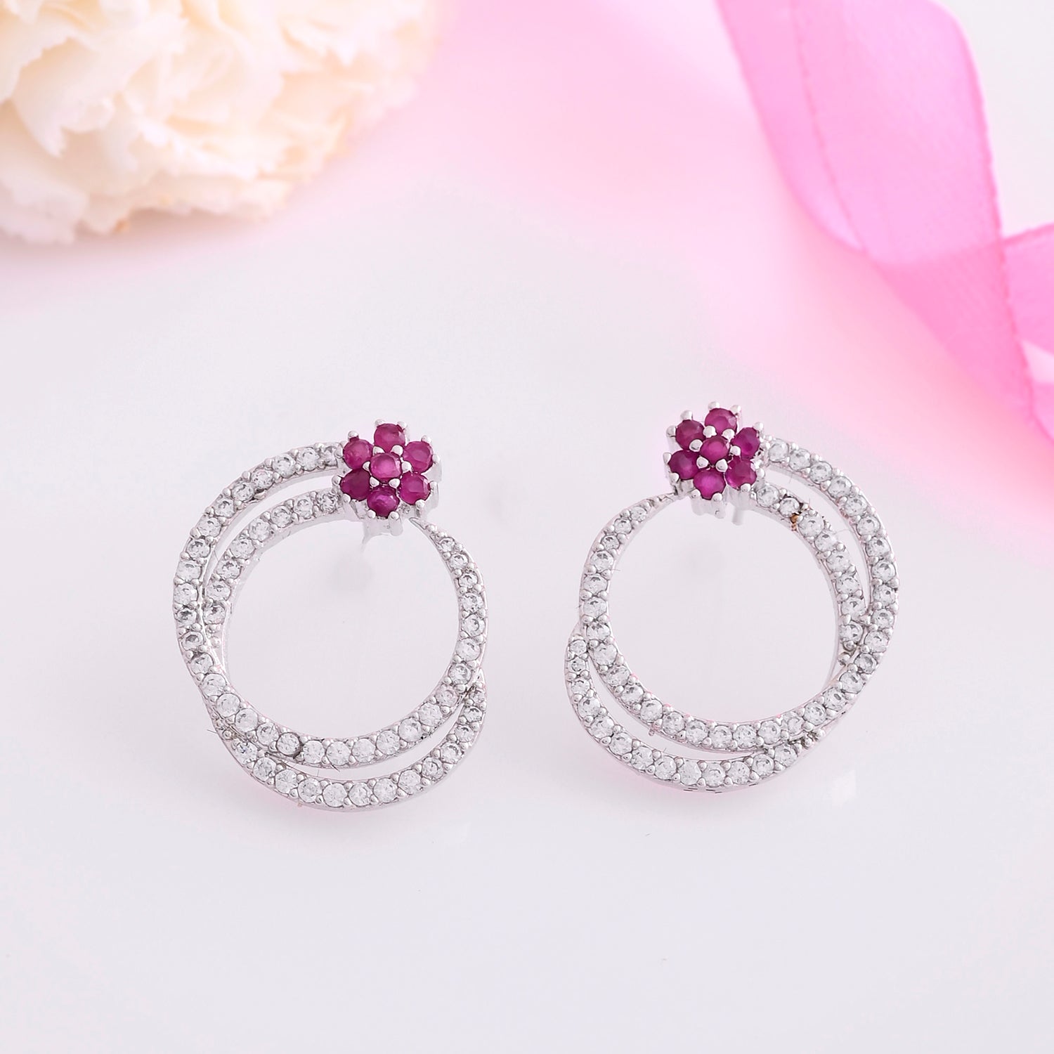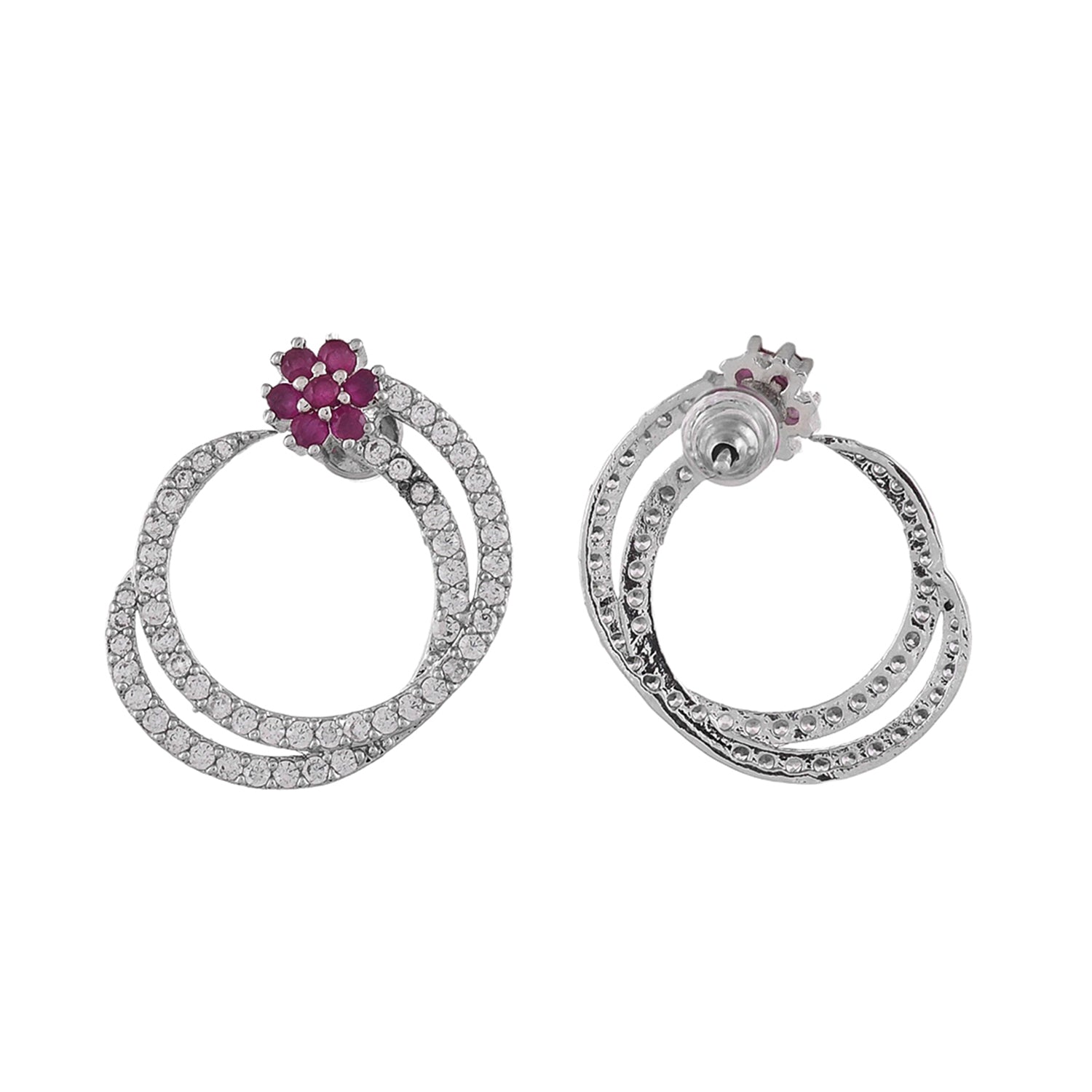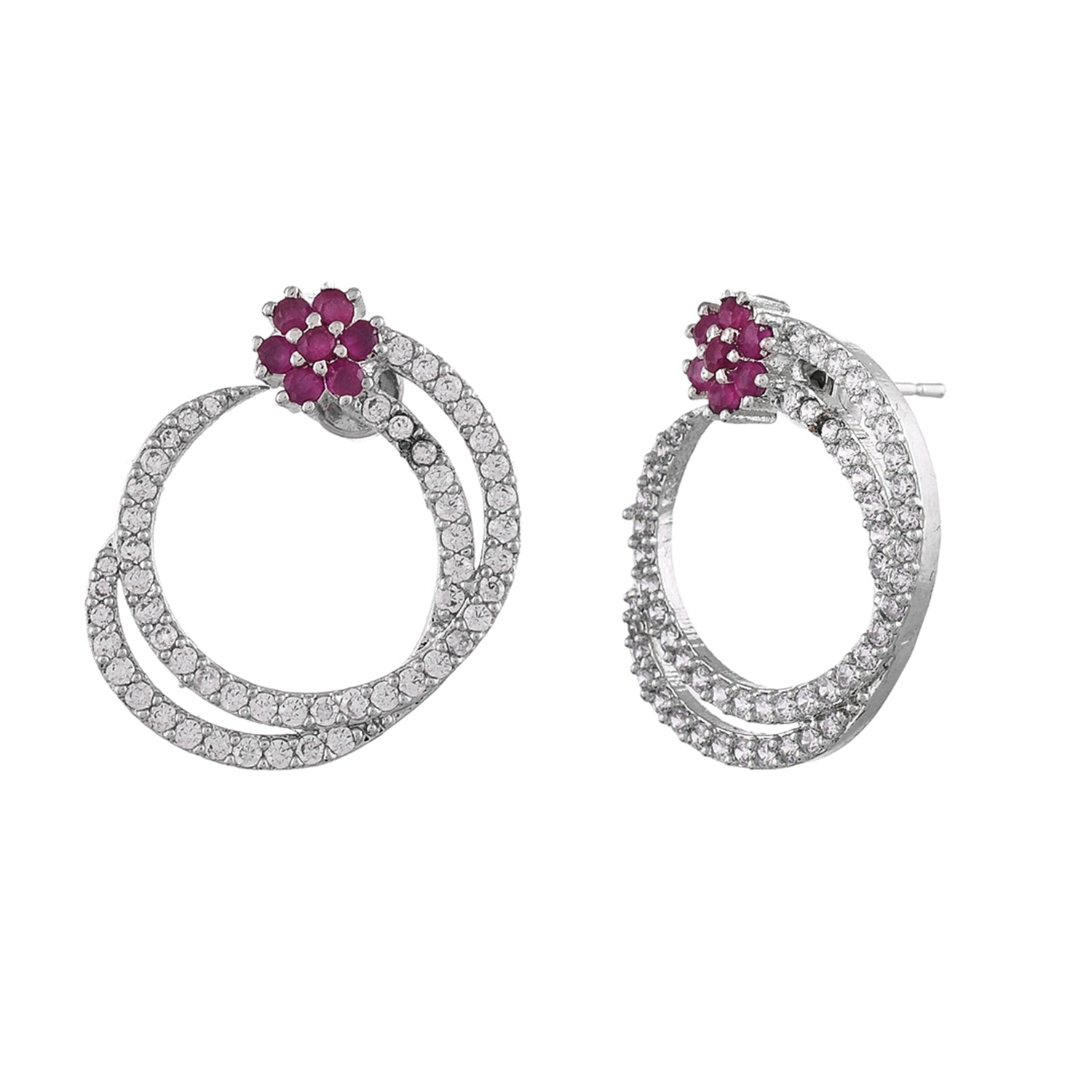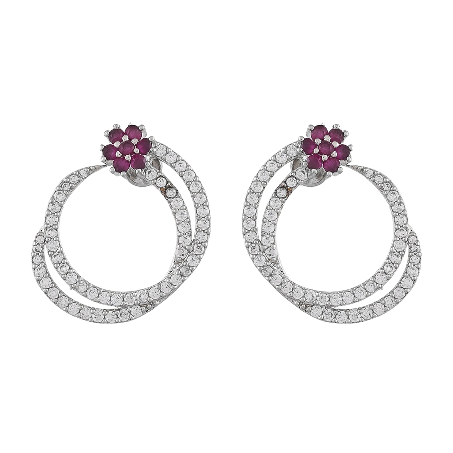 Spiral design brass earrings with silver plating. Embellished with red CZ gems in a floral pattern and white, round cut CZ gems. Pair with formal attire.