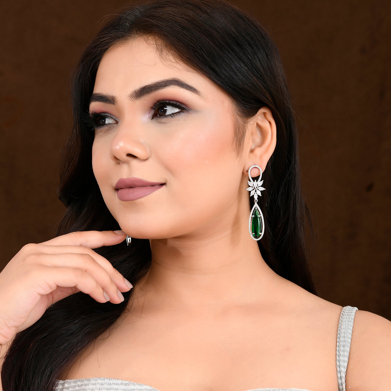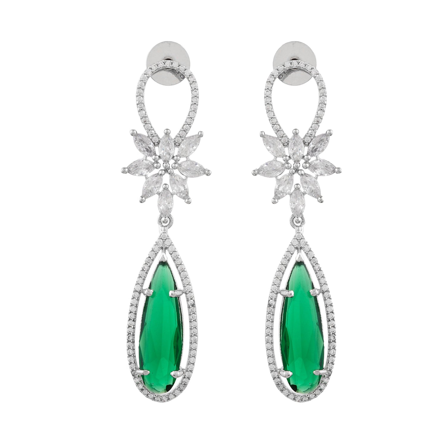 Crafted from high-quality brass, these earrings feature a luxurious white rhodium plating that offers a lustrous silver-tone finish, ensuring durability and shine. The design showcases a starburst motif at the stud, intricately set with sparkling American diamonds that catch the light beautifully. Suspended from this is an elongated teardrop silhouette, outlined by a halo of smaller American diamonds enhancing its grace. At the center of each drop lies a striking green stone, cut in a faceted marquise shape that adds a pop of vibrant color and an extra layer of allure to these party wear danglers. The combination of green and silver tones makes these earrings versatile for various outfits, making them perfect for women seeking long earrings that make a statement. Whether it’s as a gift for your wife, sister or even as an indulgent purchase for self on occasions like Rakhi or simply to elevate your jewelry collection.