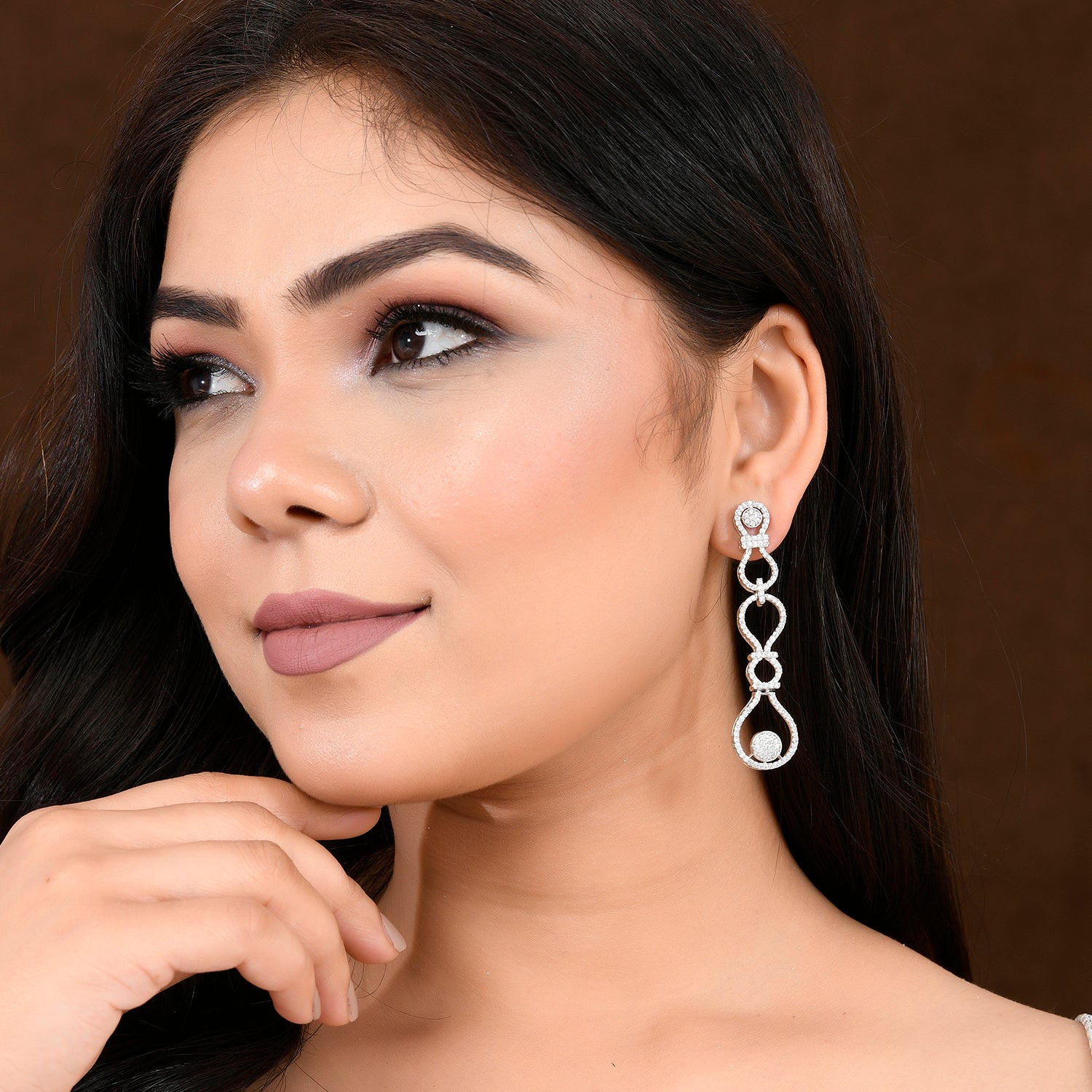The earrings are elegantly plated in lustrous White Rhodium, giving them a sophisticated sheen that catches the light beautifully. Each earring showcases a series of interconnected loops, creating an elongated silhouette that exudes grace and style. The loops are adorned with sparkling American Diamonds, adding a touch of glamour to these Party wear dangler earrings for women.The design includes two prominent circular motifs encrusted with American Diamonds—one at the stud and another at the bottom loop. These earrings are versatile enough to complement both formal and Party events, making them an excellent Gift for wife, sister, or even as a self-indulgent treat. With their timeless elegance and dazzling sparkle, they also serve as a thoughtful Gift for Rakhi or any special occasion where you wish to convey affection and appreciation through jewellery.
