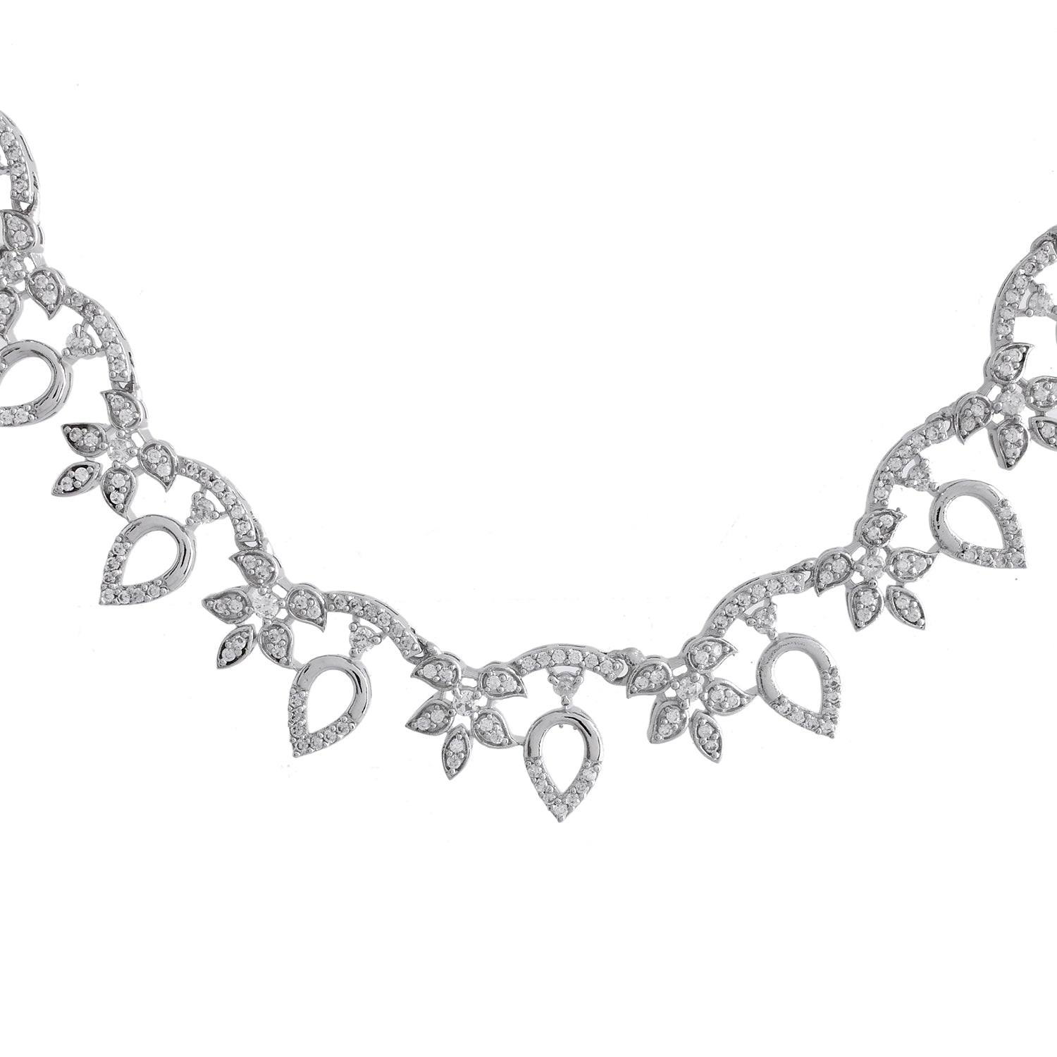 The necklace and earrings showcase a graceful arrangement of glistening teardrop shapes intertwined with delicate floral motifs, giving it a soft, romantic aesthetic. Inspired by nature's elegance, each element is precisely placed to create a fluid, blooming effect that beautifully enhances your neckline and adds a whisper of sparkle to every look.