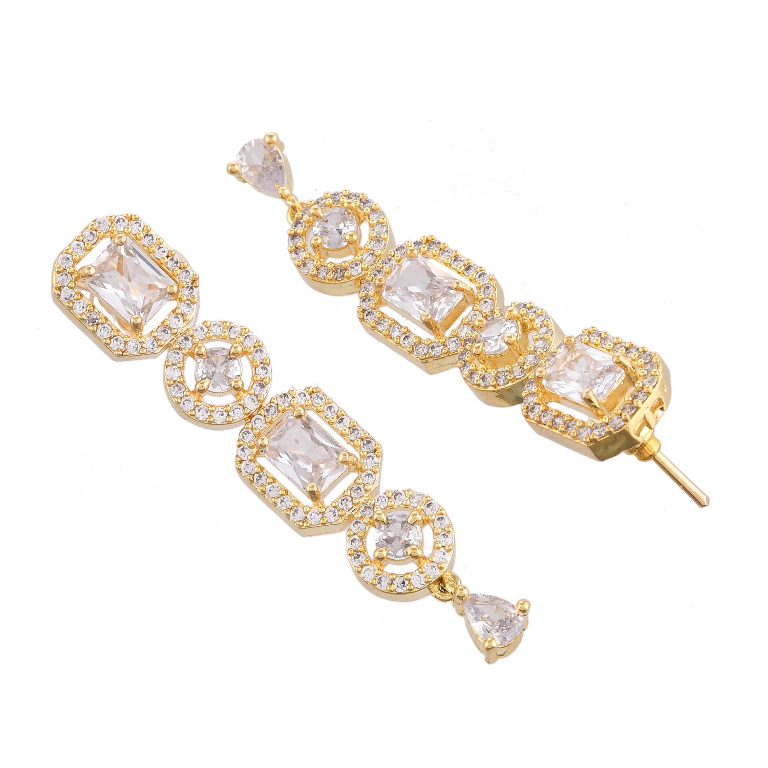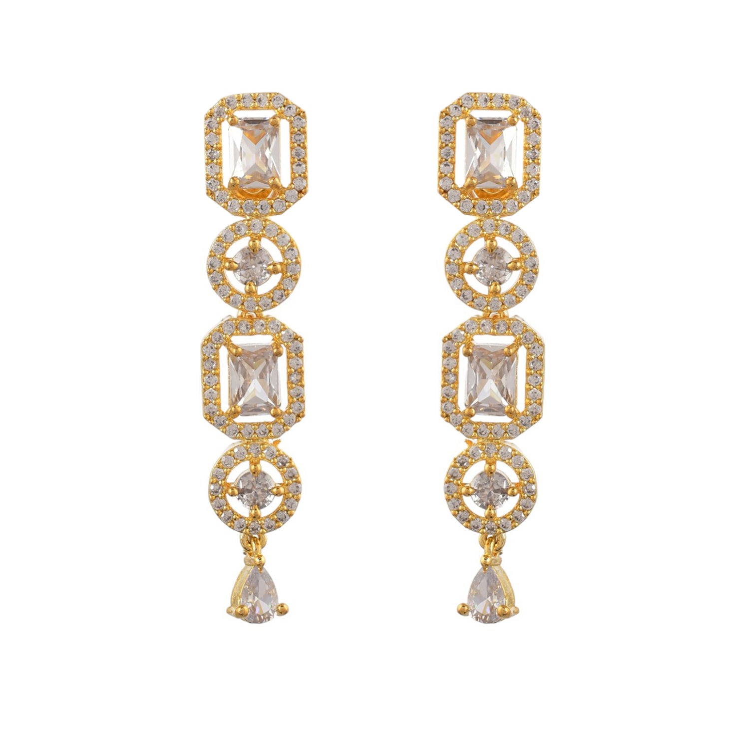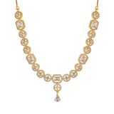 Shine bright at any celebration with the Sparkling Elegance Collection's gold-plated party wear necklace set from Voylla. This luxurious piece features an exquisite combination of round and rectangular cubic zirconia stones, meticulously designed to enhance your party look with unmatched sophistication and glamour. Perfect for making a statement at weddings, soirées, and festive events, this necklace set is a must-have addition to your jewelry collection, ensuring you dazzle on every occasion.