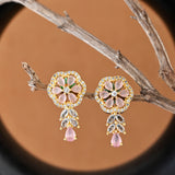 These exquisite earrings feature a delicate floral design adorned with sparkling cubic zirconia stones, adding a touch of glamour to any party ensemble. The soft pink hue enhances the feminine charm, while the gold plating exudes luxury and elegance. Perfect for parties and special occasions,
