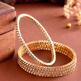 Round cut white cubic zirconia gemstones adorn these gold plated traditional bangle bracelets. Made from brass, the bracelets are lightweight, comfortable and versatile.
