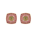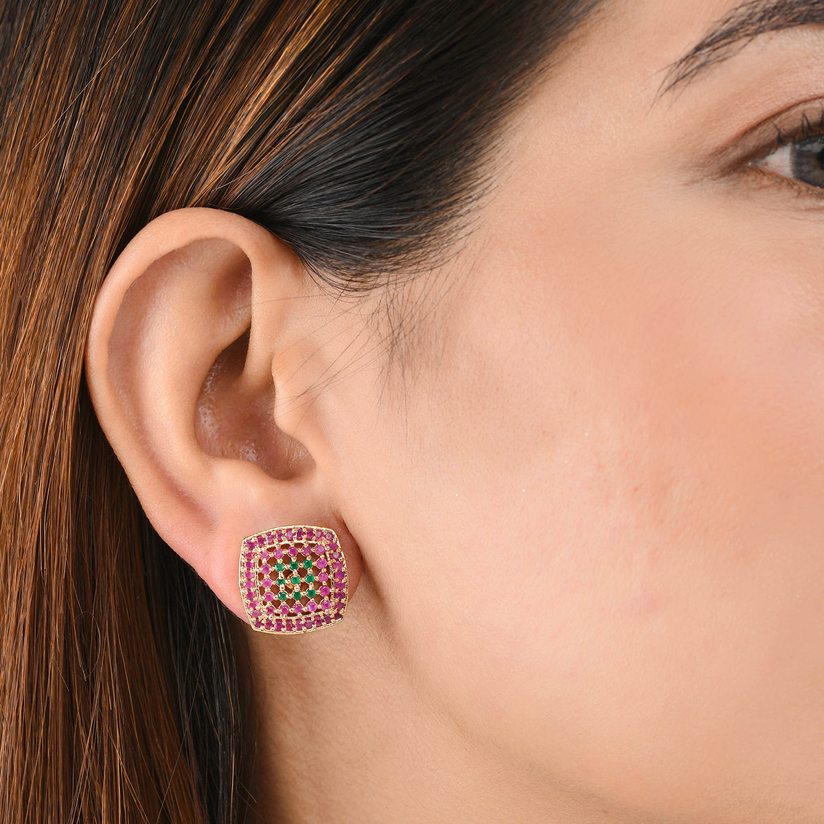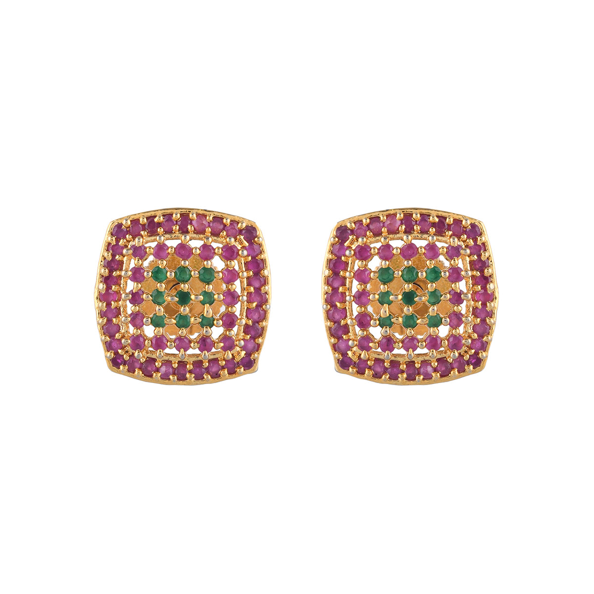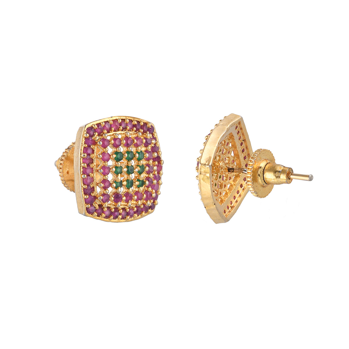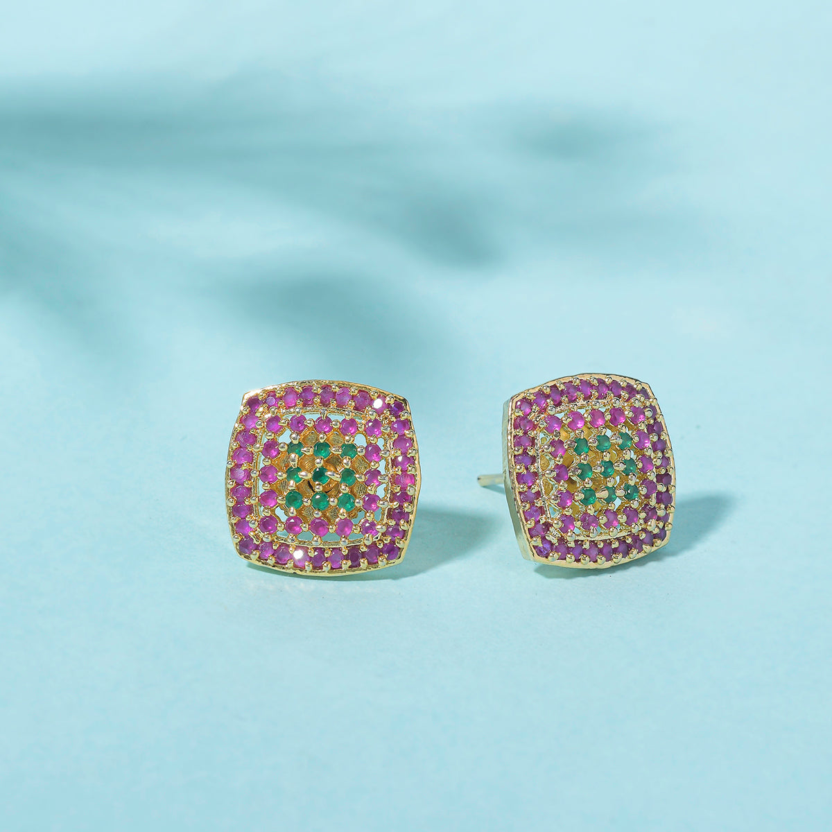 Brass stud style earrings with classic yellow gold plating. Embellished with round cut pink and green zirconia gemstones, the earrings can be paired with a wide range of outfits and looks.