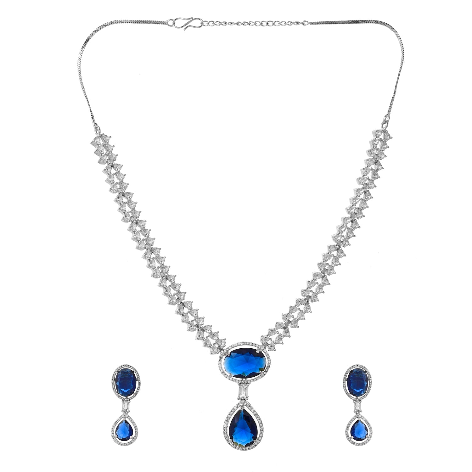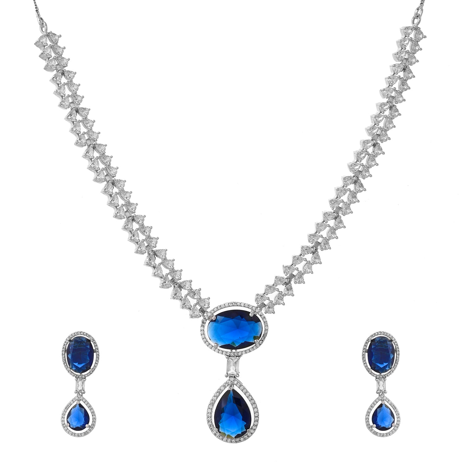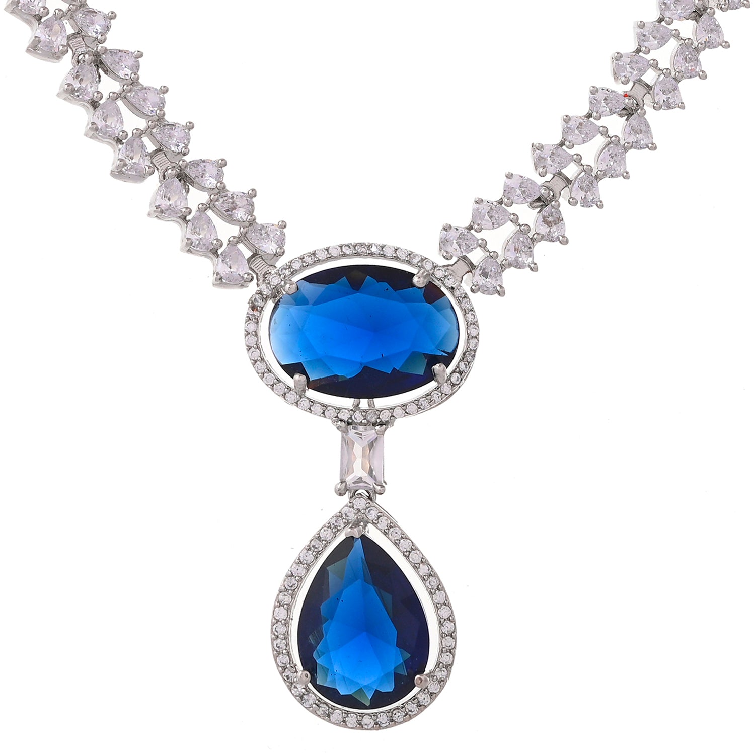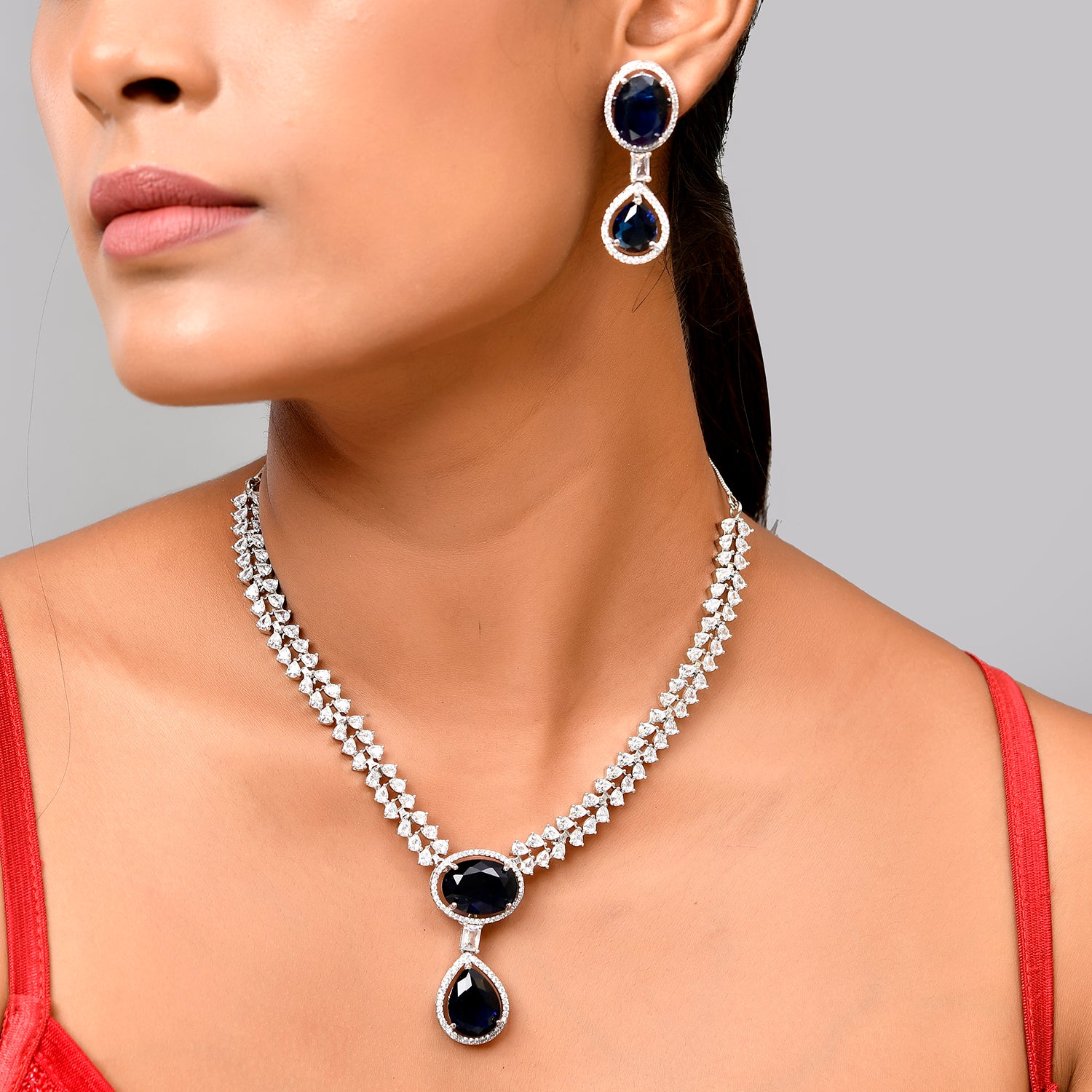 Elevate your festive attire with the exquisite Voylla American Diamond Necklace Set. This stunning necklace set for women features a luxurious design crafted from high-quality brass and adorned with sparkling cubic zirconia stones. The rhodium plating adds a touch of elegance and durability, ensuring this piece remains a cherished part of your jewelry collection. The necklace showcases a beautiful arrangement of shimmering stones, culminating in two striking blue gemstones that add a pop of color and sophistication. Perfect for Navratri, Diwali, Durga Puja, Rakhi, and other festive occasions, this necklace set makes an ideal gift for your wife, sister, girlfriend, mother, or friend. Celebrate the special moments with this dazzling American Diamond necklace set from Voylla.