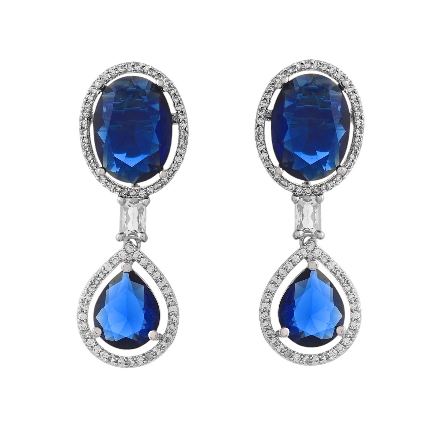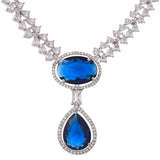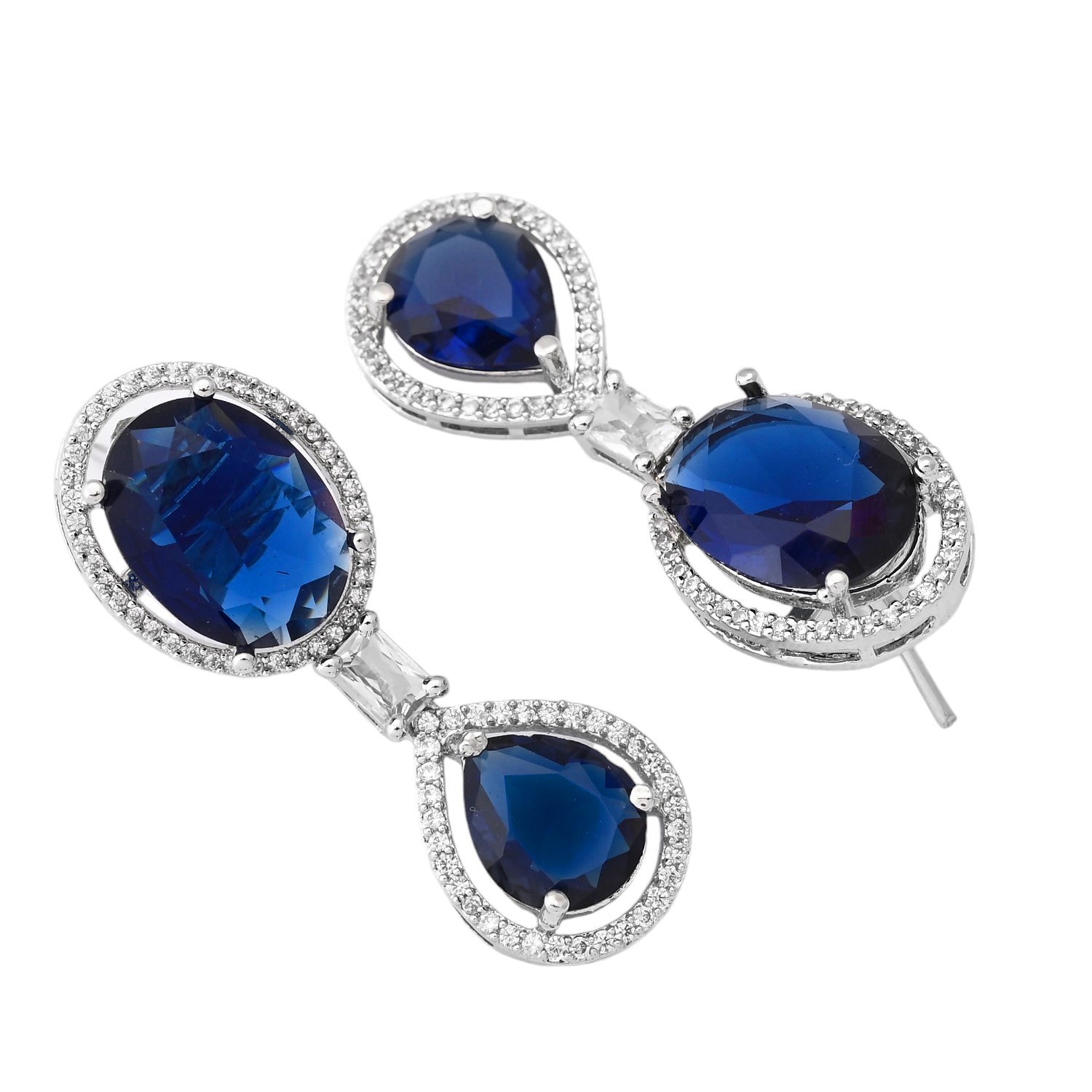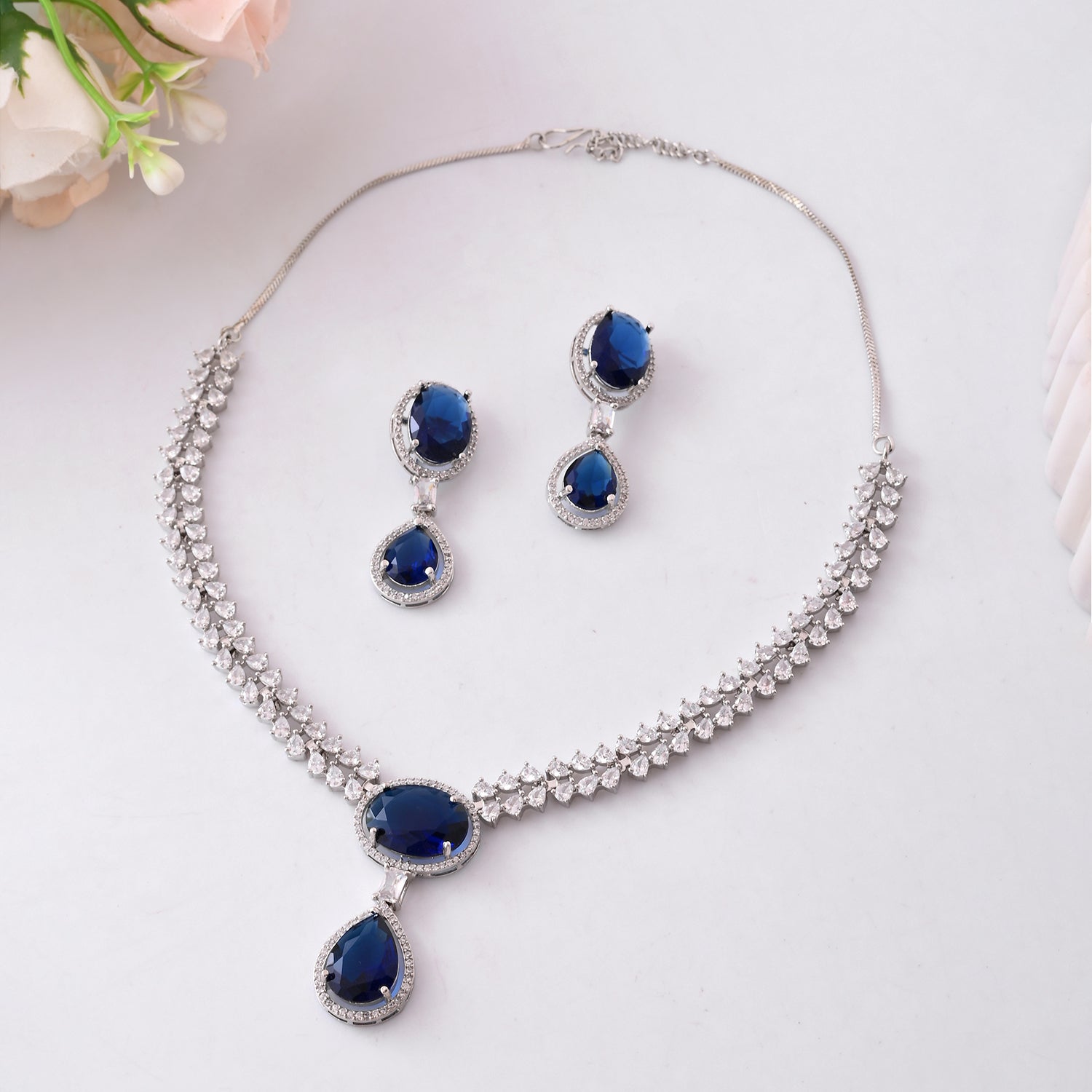 Elevate your festive attire with the exquisite Voylla American Diamond Necklace Set. This stunning necklace set for women features a luxurious design crafted from high-quality brass and adorned with sparkling cubic zirconia stones. The rhodium plating adds a touch of elegance and durability, ensuring this piece remains a cherished part of your jewelry collection. The necklace showcases a beautiful arrangement of shimmering stones, culminating in two striking blue gemstones that add a pop of color and sophistication. Perfect for Navratri, Diwali, Durga Puja, Rakhi, and other festive occasions, this necklace set makes an ideal gift for your wife, sister, girlfriend, mother, or friend. Celebrate the special moments with this dazzling American Diamond necklace set from Voylla.